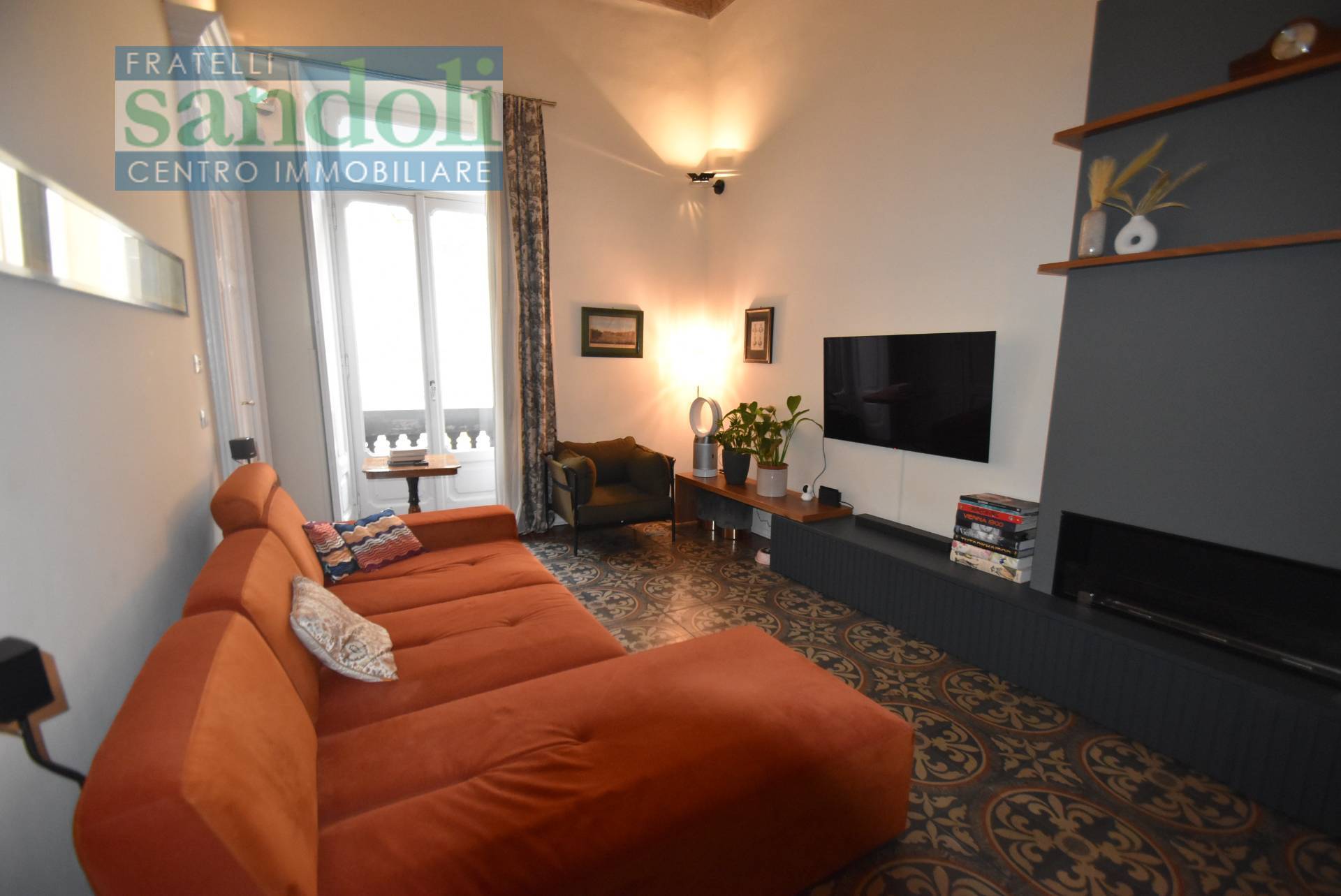 Posto al primo piano, di dalle splendide scalinate con originale passamano in ferro battuto raggiungiamo l'appartamento, dall'ingresso con comodo ripostiglio e primo bagno con box doccia e zona lavanderia, entriamo nel fantastico salone con soffitto affrescato, caratteristica pavimentazione finemente lavorata, molto luminoso grazie ai grandi serramenti d'epoca, sul fianco del soggiorno, anch'esso con soffitto affrescato e pavimentazione grecata troviamo lo studio, eventualmente utilizzabile a necessit anche come camera per gli ospiti.