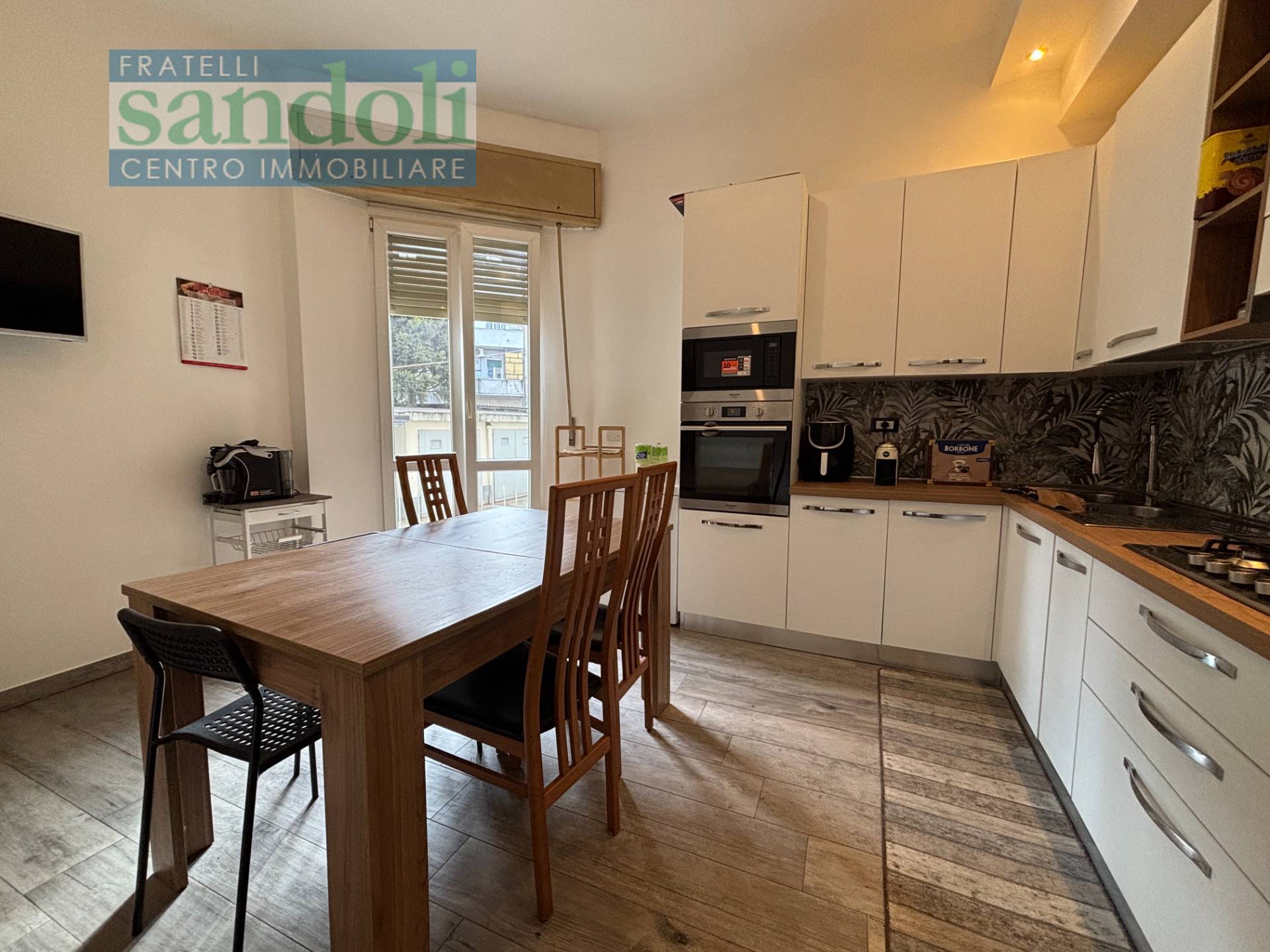La cucina abitabile, arredata in modo moderno e funzionale, dotata di tutti gli elettrodomestici necessari e offre accesso al balcone, ideale per trascorrere piacevoli momenti all'aria aperta.