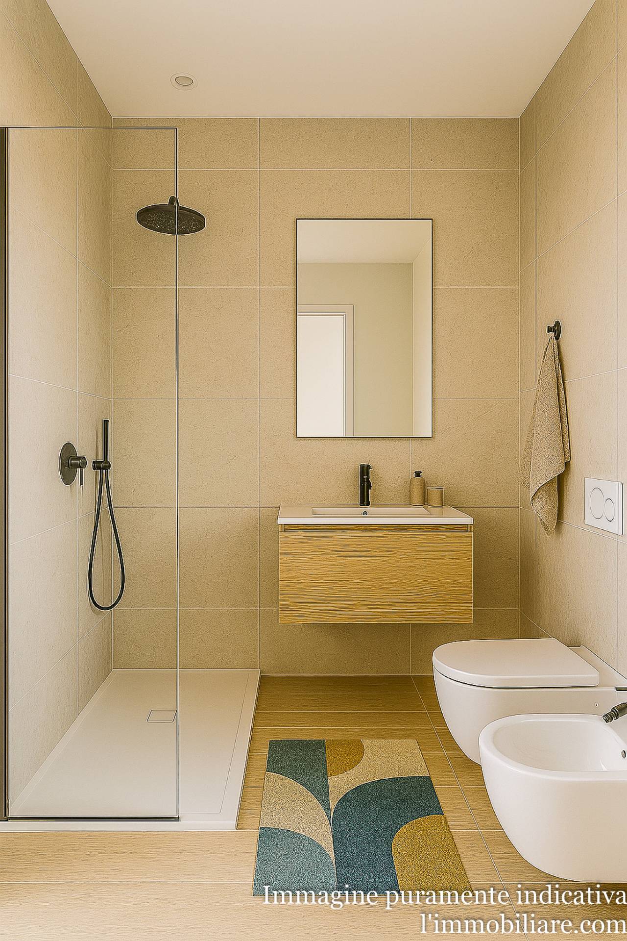 FINITURE: Pavimenti in gress porcellanato, serramenti interni in PVC con vetrocamera ed esterni avvolgibili; porte bianche, sanitari di design, colori di tendenza, impianto di climatizzazione e bagno arredato.