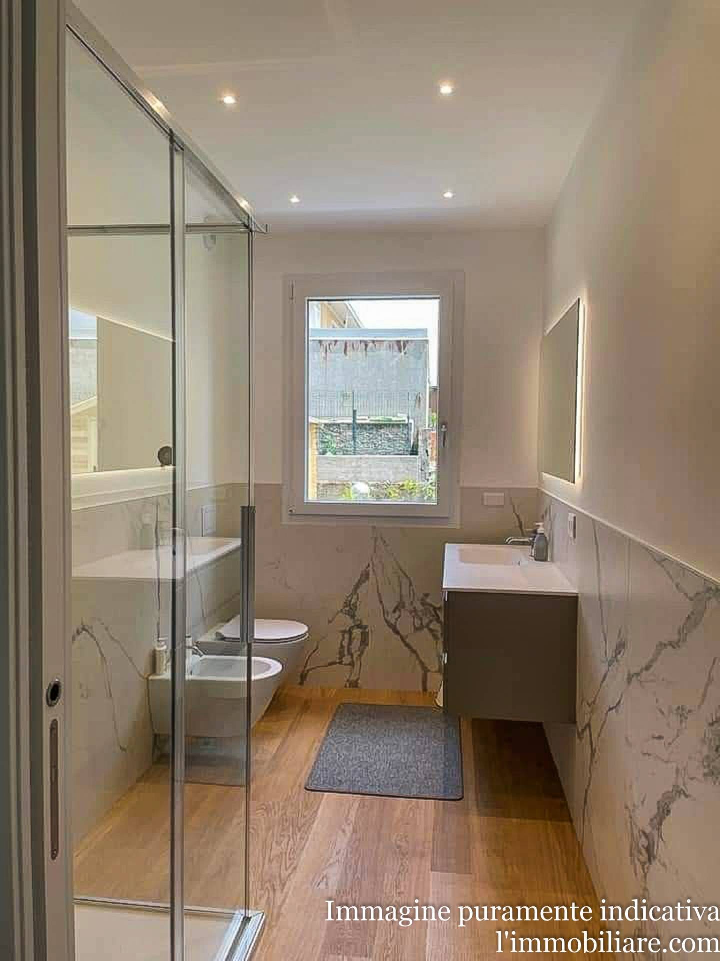 Il bagno, anchesso rinnovato con finiture contemporanee, completa labitazione con un tocco di eleganza funzionale.
