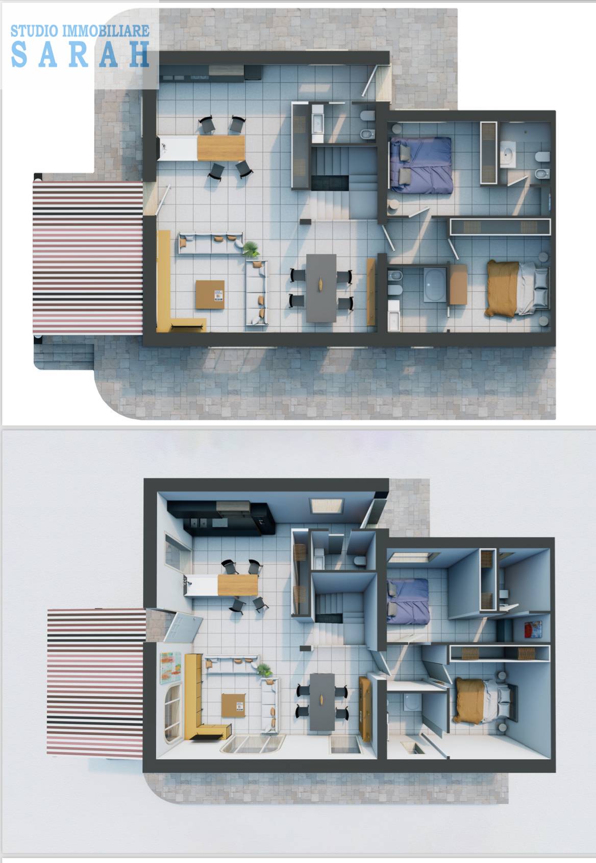 Nella zona notte troviamo due camere matrimoniali ampie e doppi bagni.