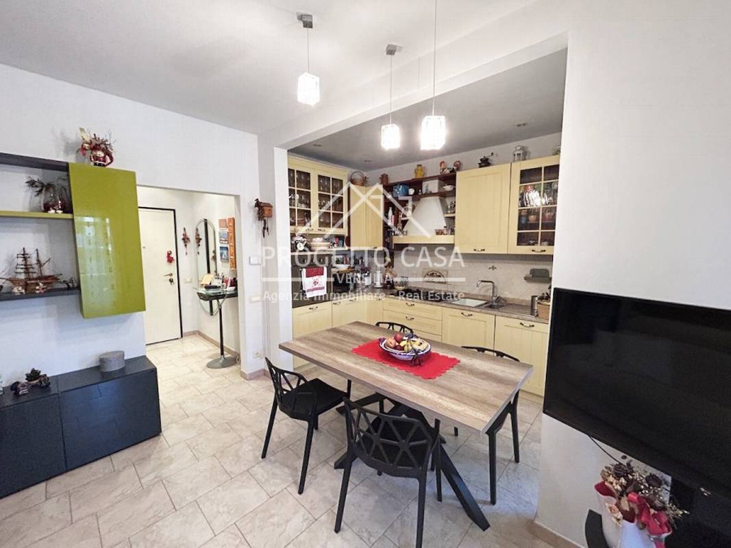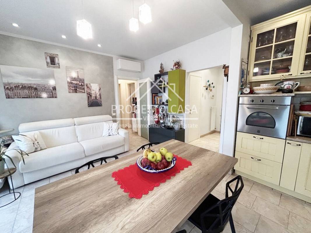 L'ingresso si apre su un disimpegno che conduce al luminoso soggiorno con cucina a vista.