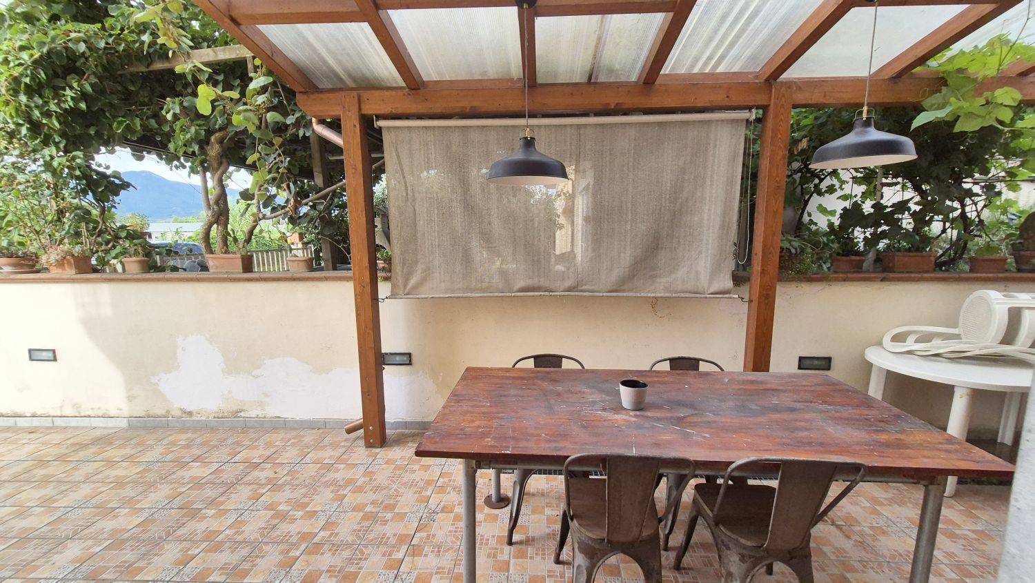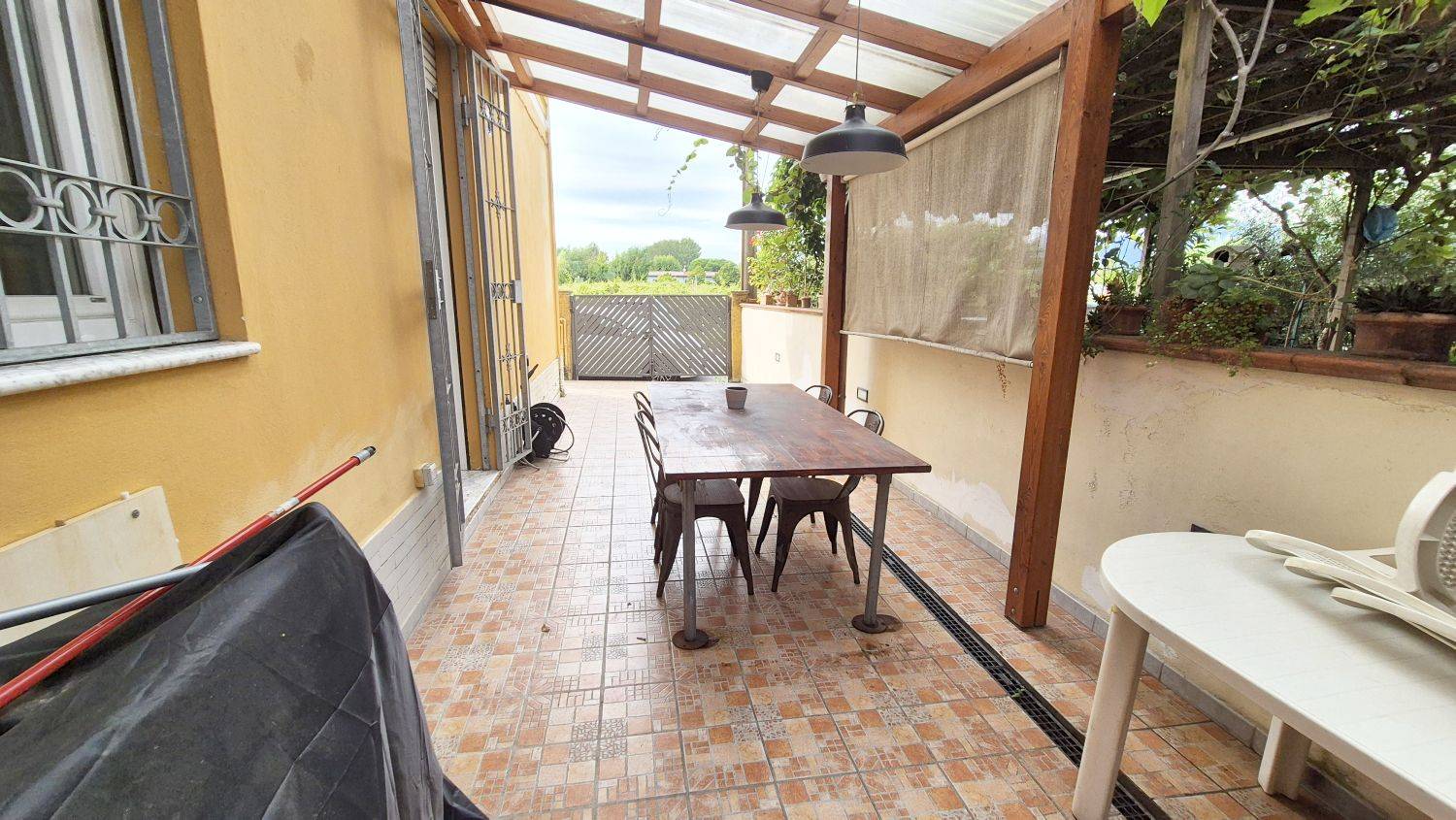 La resede sui due lati ed piastrellata, nella zona antistante la cucina stata realizzata una pompeiana in legno con spazio sufficiente per un bel tavolo, perfetto per pranzi e cene nella bella stagione, oltre alla possibilit del posto auto. Essendo un piano terra e quindi per maggior comodit, tutte le finestre e la porta finestra, sono dotate di inferriate, gli infissi esterni sono in PVC con doppia apertura e doppio vetro.