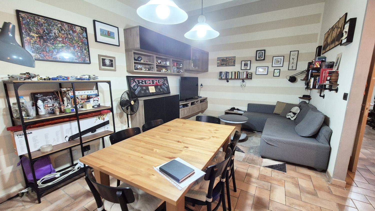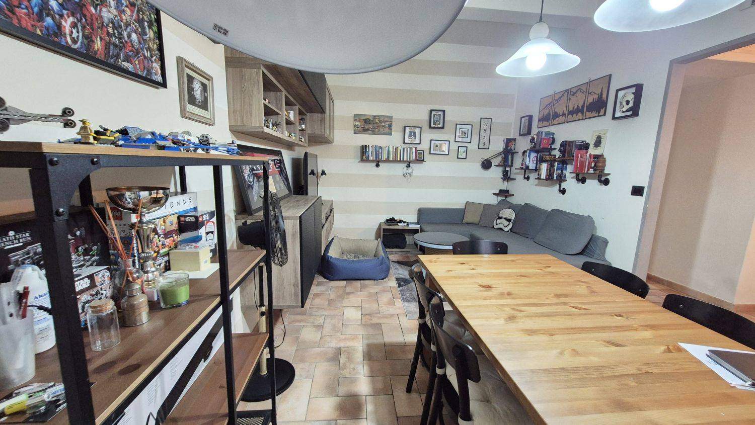 Si compone di un vano d'ingresso con armadi e librerie, due camere matrimoniali, un'ampia saletta da bagno con doccia e finestra su cavedio, attiguo vano lavanderia/ripostiglio con caldaia, una grande sala con zona soggiorno e zona pranzo e con cucina a vista, molto luminosa con finestra e porta per accesso al giardino.