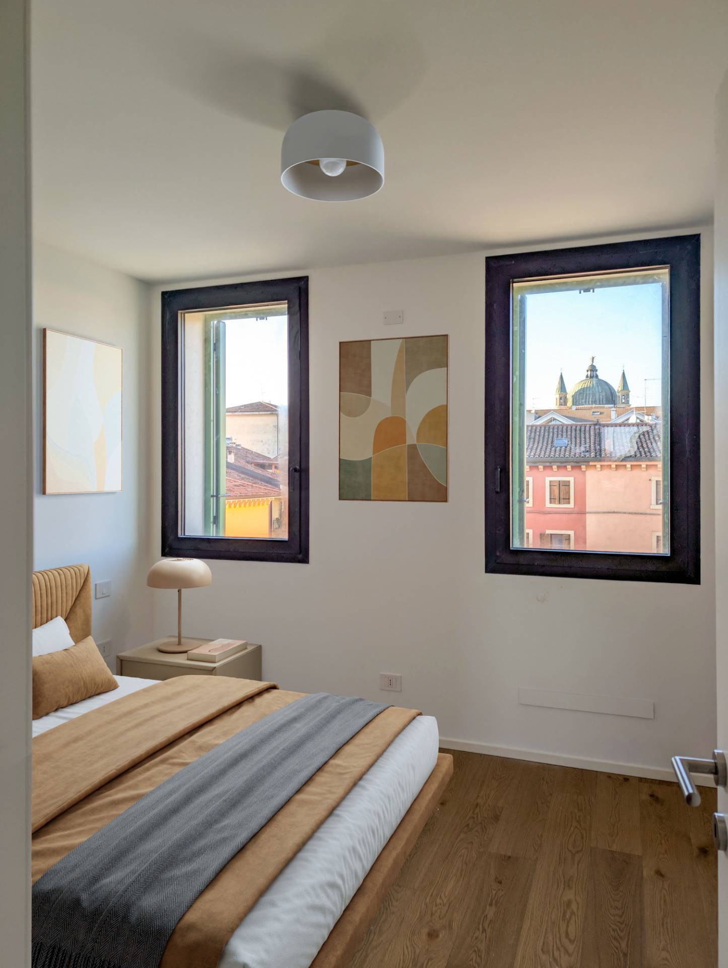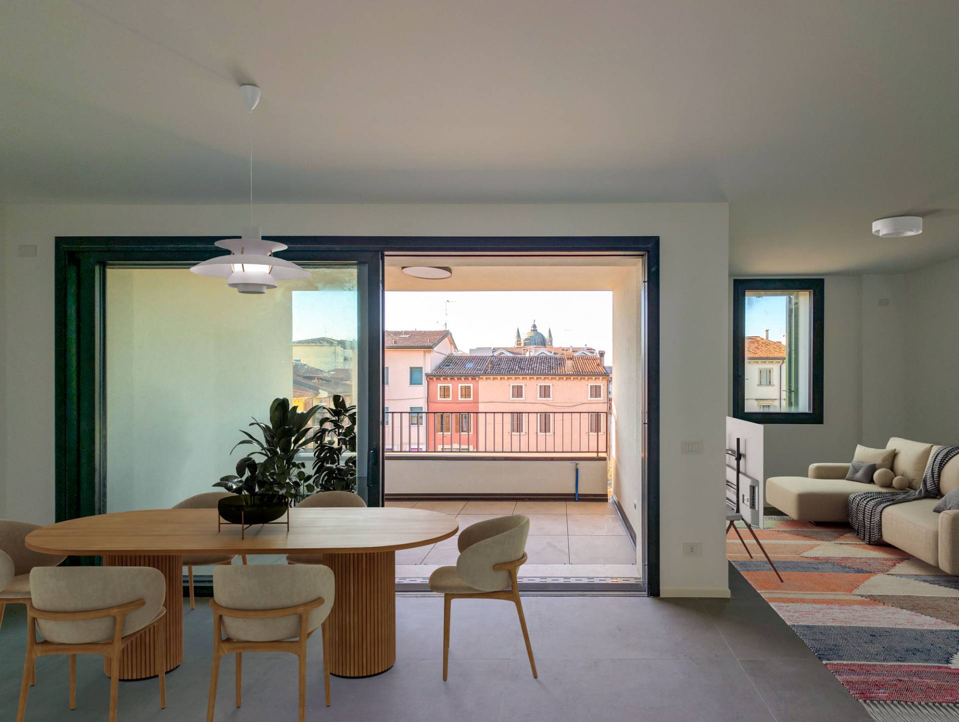Appartamento al secondo e ultimo piano, servito da ascensore, composto da: soggiorno - cucina (30 mq) con terrazzo di 10 mq con vista sul duomo, due camere (14 e 12 mq), doppi servizi e zona lavanderia.