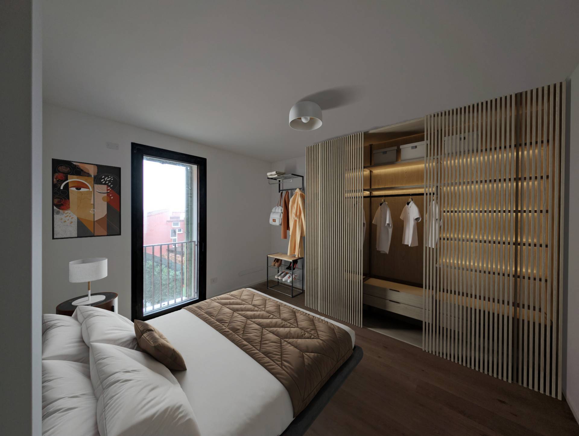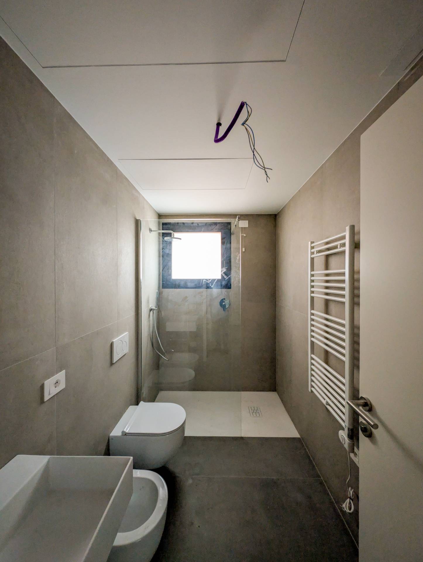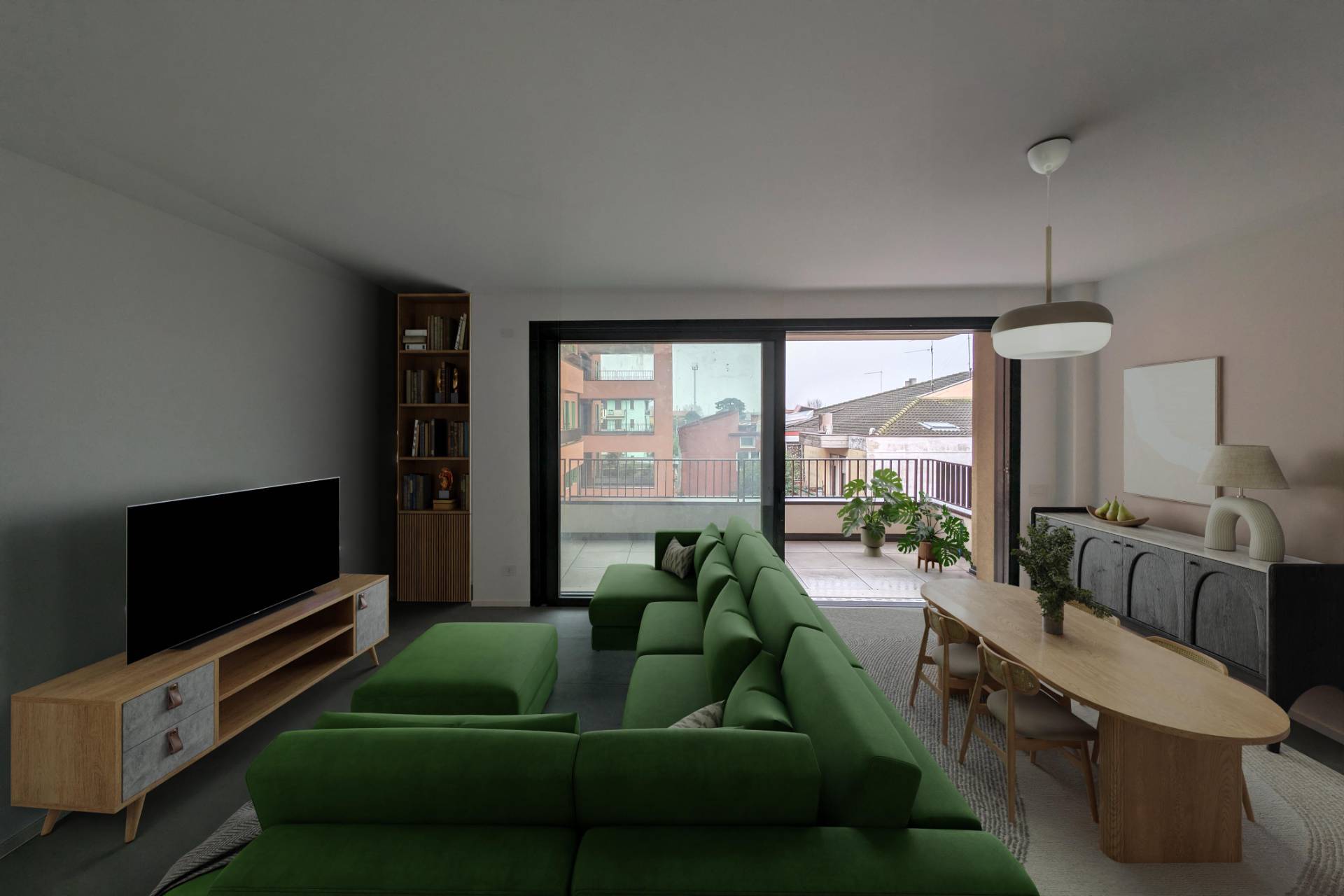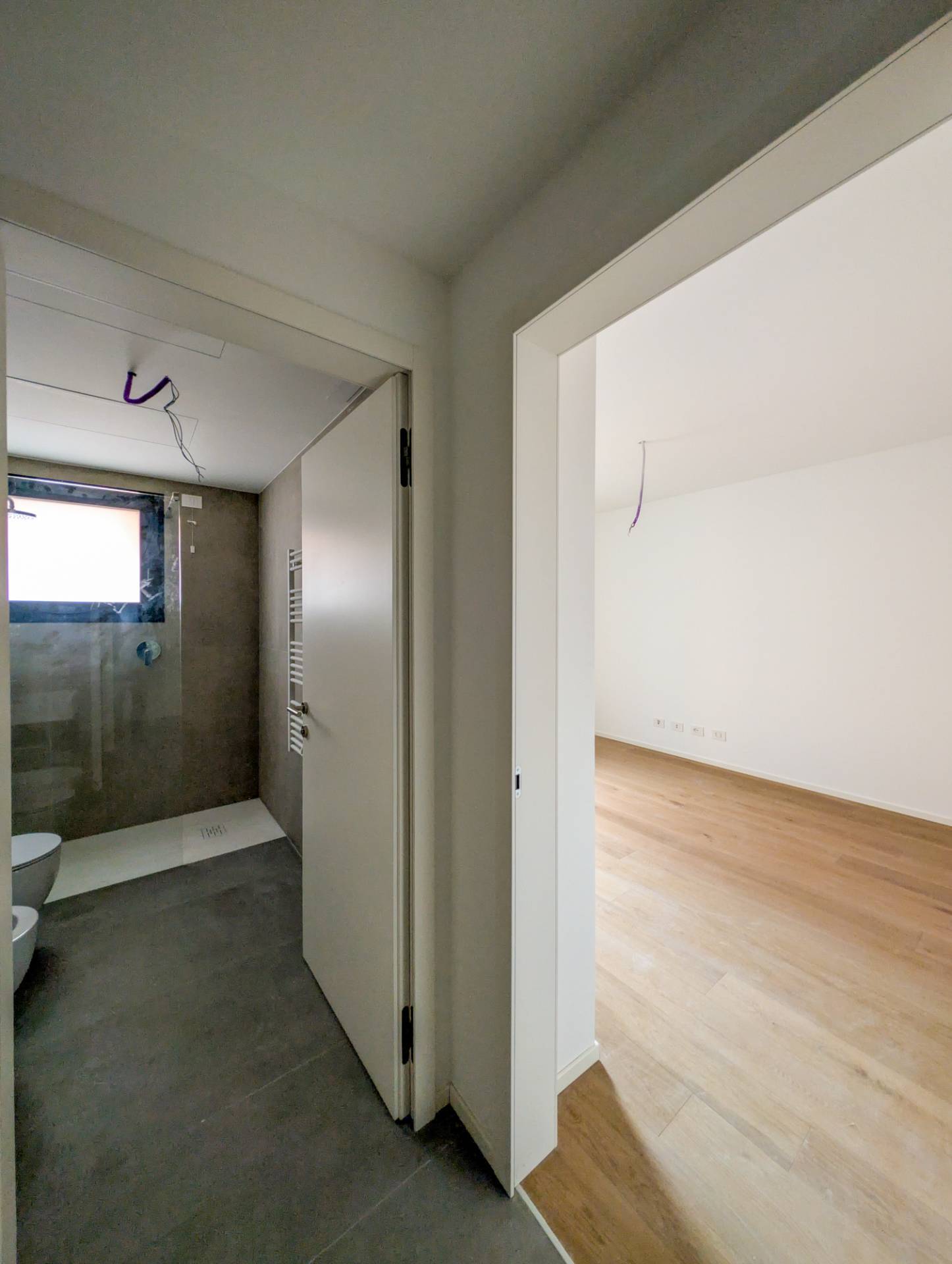 Le finiture e tecnologie di quest'immobile comprendono: - Riscaldamento e raffrescamento a pavimento con pompa di calore; - Pannelli fotovoltaici (autoconsumo collettivo); - Placche elettriche di alta gamma (Vimar serie Linea); - Impianto canalizzato di ventilazione meccanica controllata: - Predisposizione per impianto d'allarme; - Finiture Marazzi di alta gamma nella zona giorno - Parquet Berti in rovere naturale nella zona notte; - Bagni con rivestimento ceramica Marazzi e box doccia gi installato; - Porte interne in legno laccato bianco; - Serramenti esterni SCHCO in alluminio; - Addolcitore centralizzato condominiale.