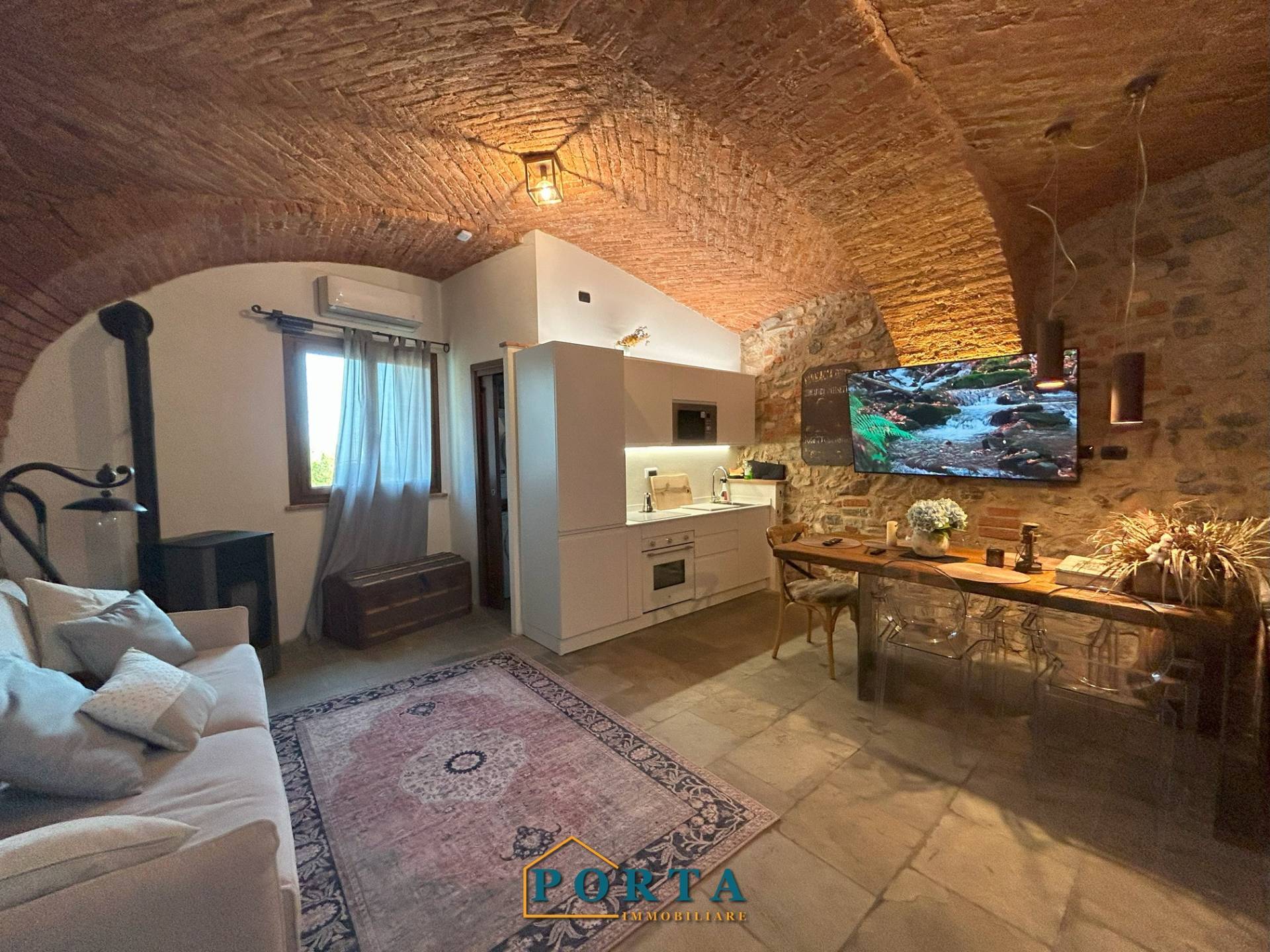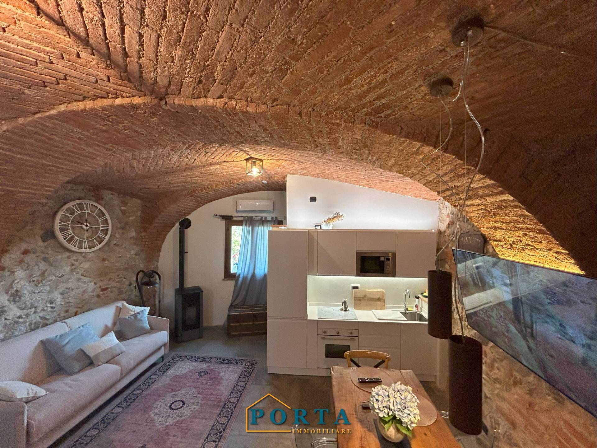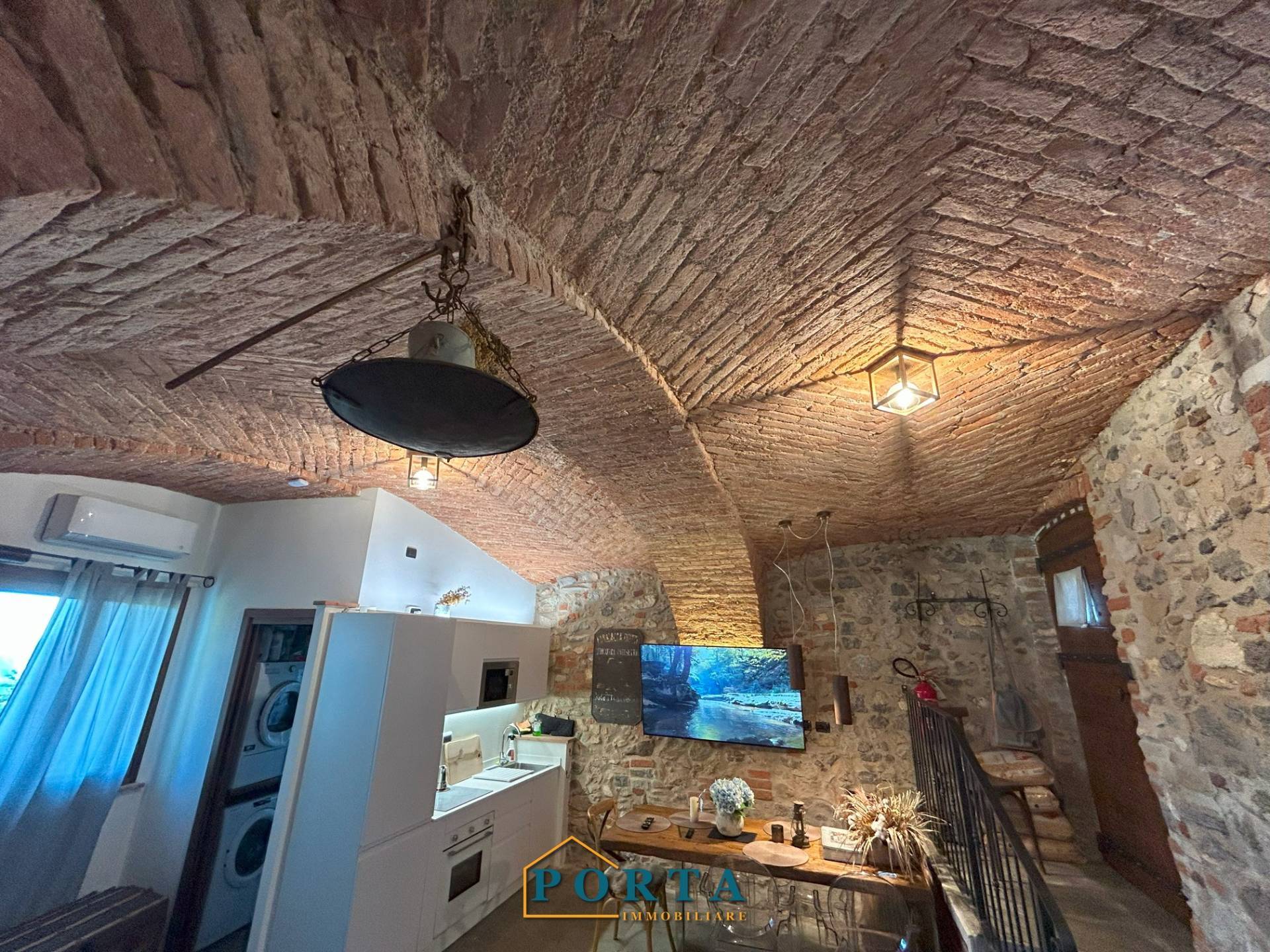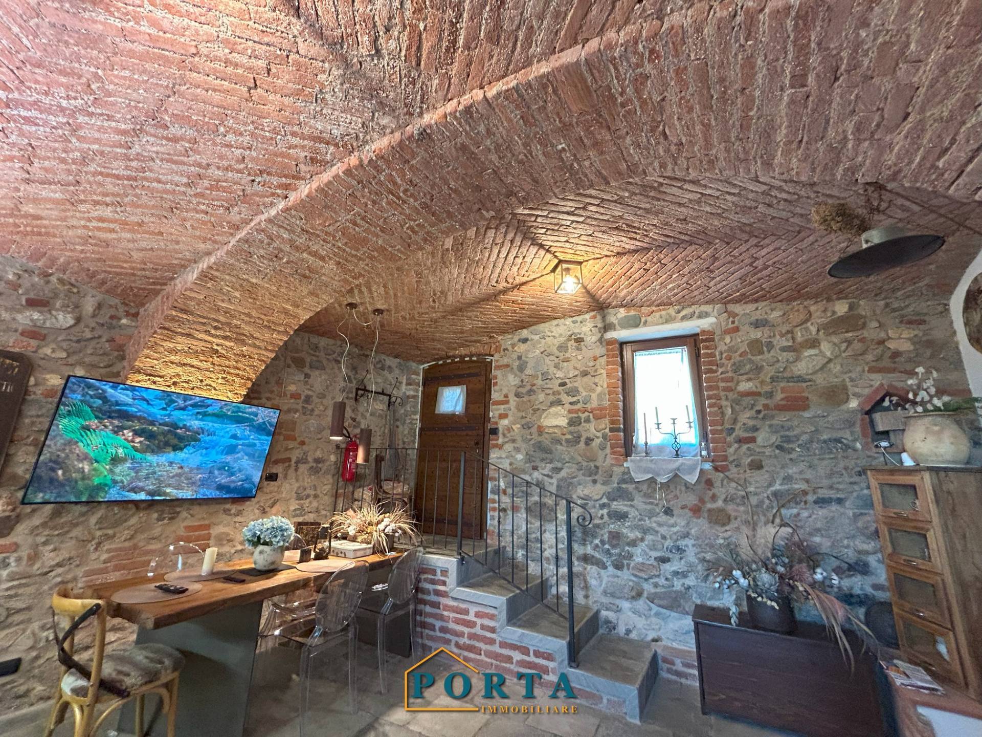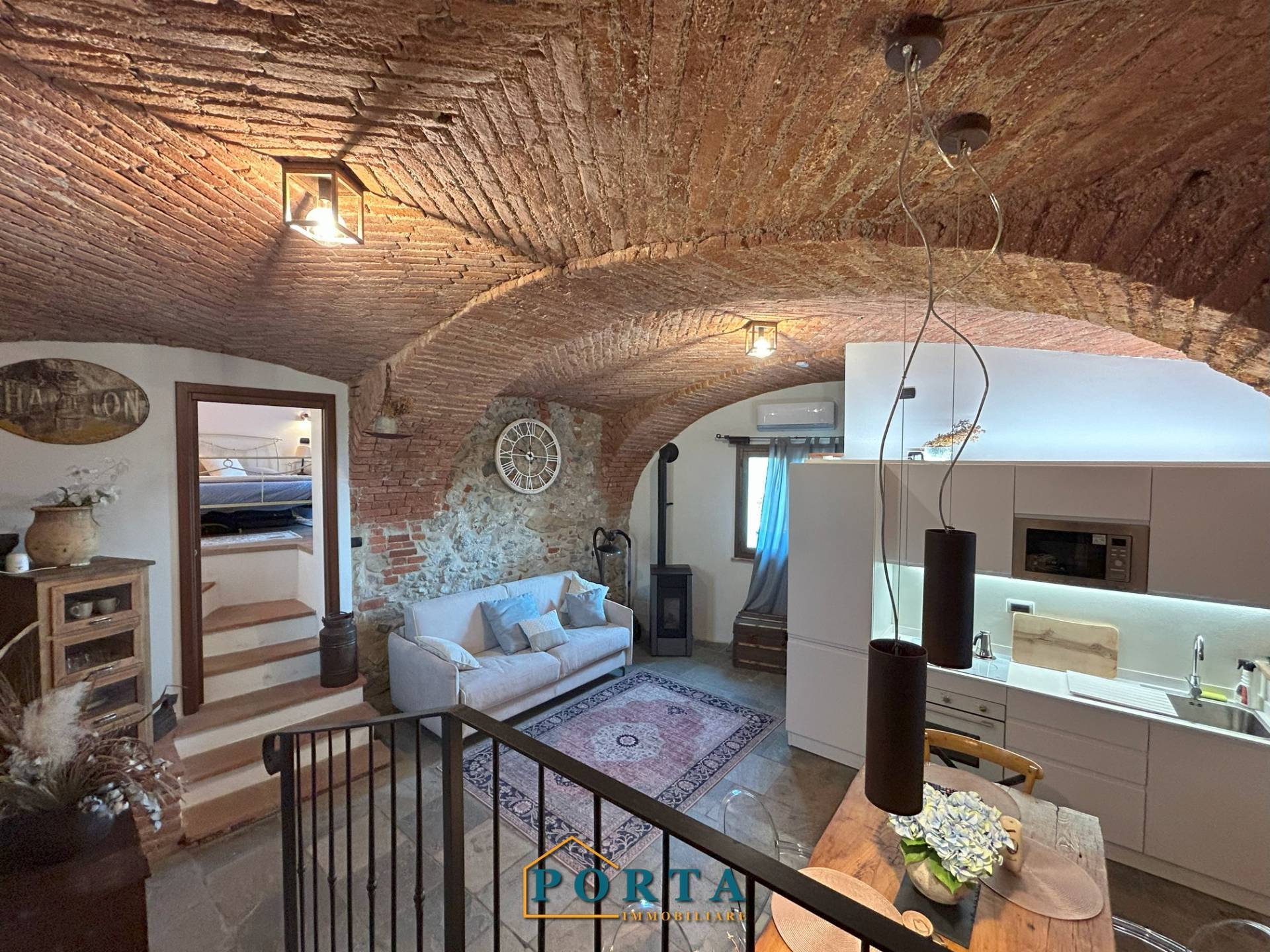 Tramite una scaletta di design si accede alla zona giorno, un ambiente affascinante che unisce eleganza e tradizione: volte in mattoni a vista, pavimenti in pietra naturale e arredi su misura di altissimo pregio creano unatmosfera calda e accogliente, perfetta per rilassarsi dopo una giornata allaria aperta.