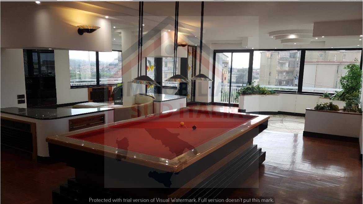 L'appartamento presenta ampi balconi di 102 mq panoramici , oltre un terrazzo di copertura praticabile di 438 mq. Dispone infine di un box auto di 40 mq. L'immobile dotato di ascensore interno alla casa. Si presenta finemente ristrutturato con Rifiniture di lusso ed accessoriato di climatizzatori in ogni ambiente, riscaldamento autonomo, pavimentazione in marmo e parquet.