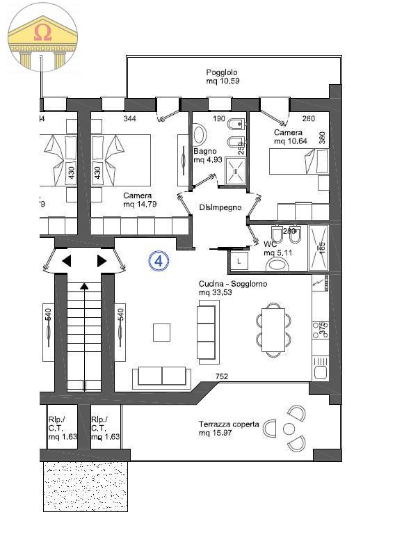 E' cos disposto: spazioso soggiorno-cucina con grande vetrata che affaccia sul terrazzo abitabile, due camere grandi, due bagni.