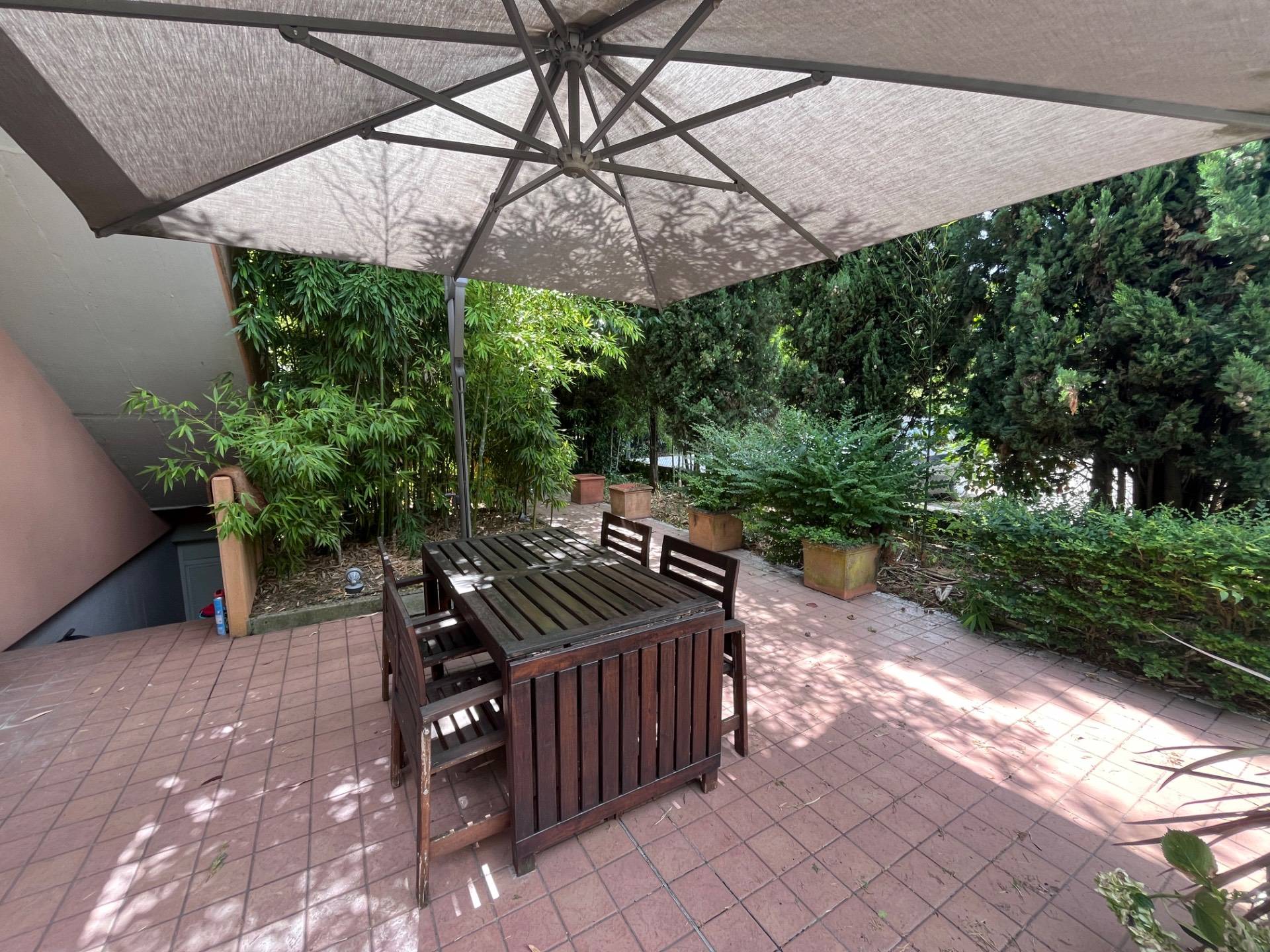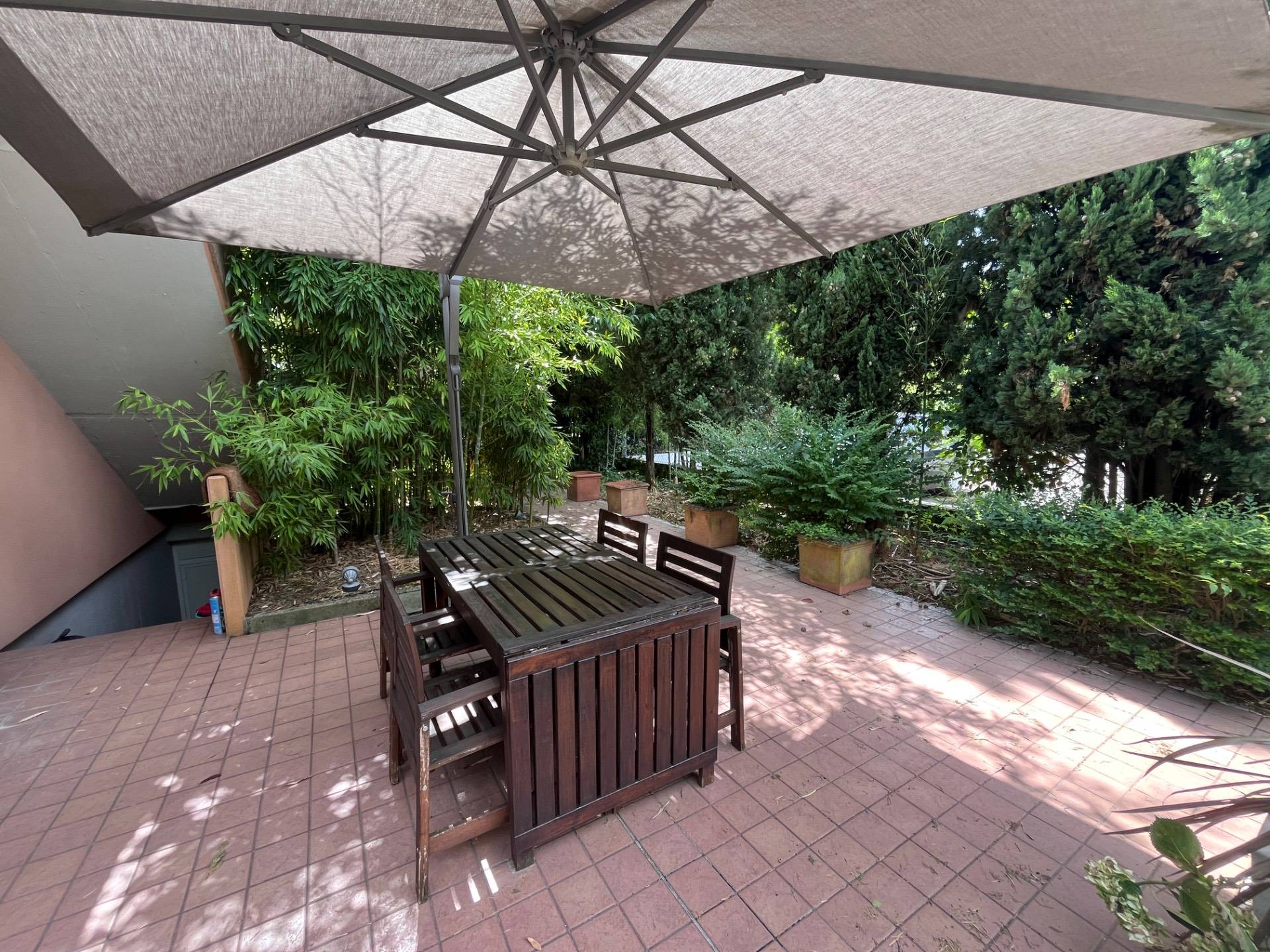 Lingresso si apre direttamente sulla zona giorno particolarmente accogliente e luminosa, completamente arredata sia di cucina che di soggiorno, con accesso diretto a un pratico giardino privato dotato di pompeiana che ospita un tavolo con delle sedie perfetto per godersi momenti di relax allaria aperta.
