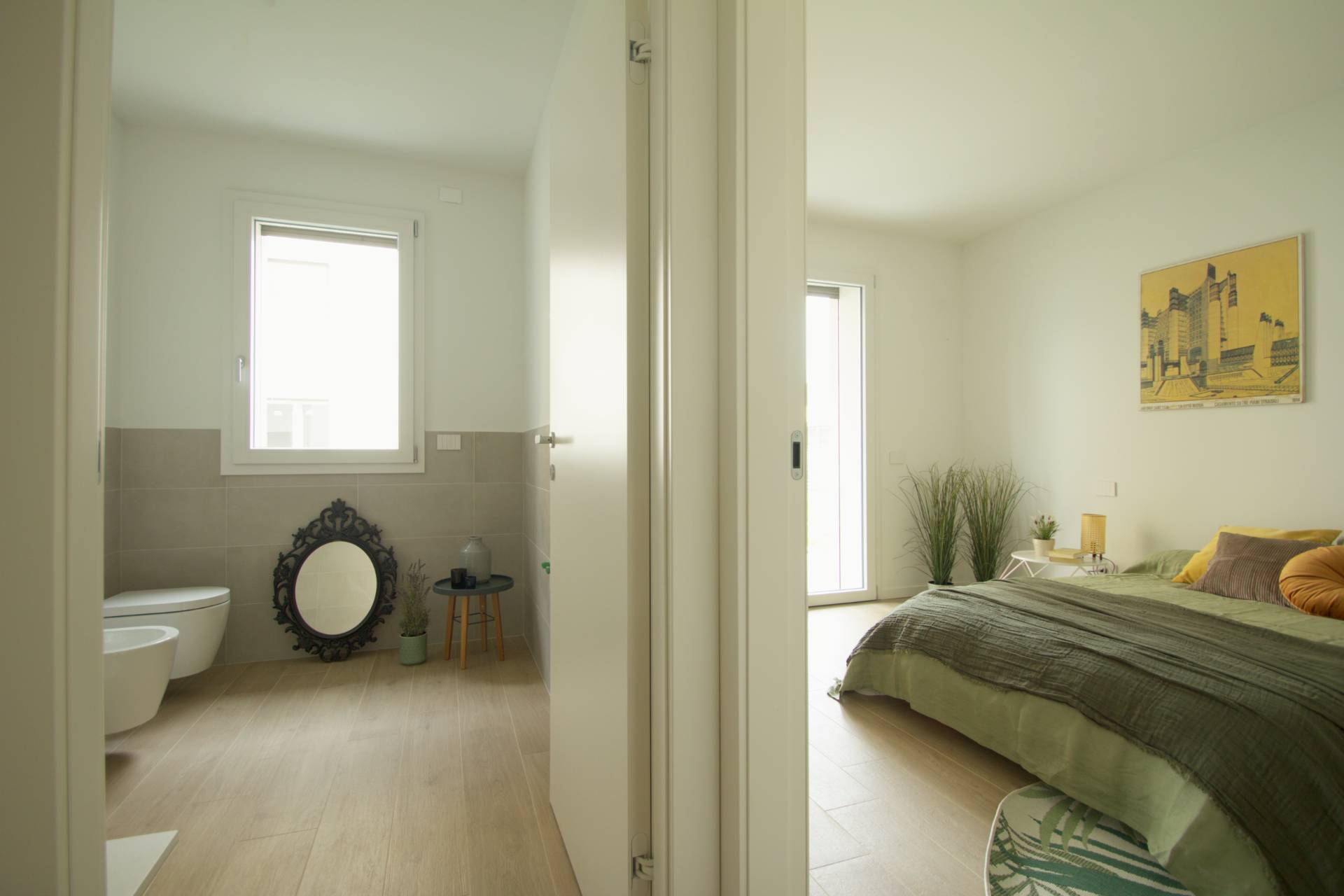 La residenza ospiter 5 edifici, per un totale di 62 soluzioni abitative di diverse metrature, tutte caratterizzate da un design moderno con parapetti di cristallo e pareti vetrate, per una perfetta integrazione tra interno ed esterno.