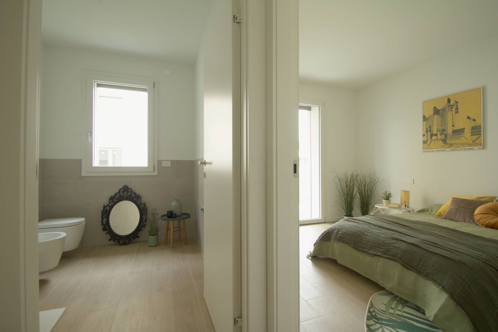 La residenza ospiter 5 edifici, per un totale di 62 soluzioni abitative di diverse metrature, tutte caratterizzate da un design moderno con parapetti di cristallo e pareti vetrate, per una perfetta integrazione tra interno ed esterno.