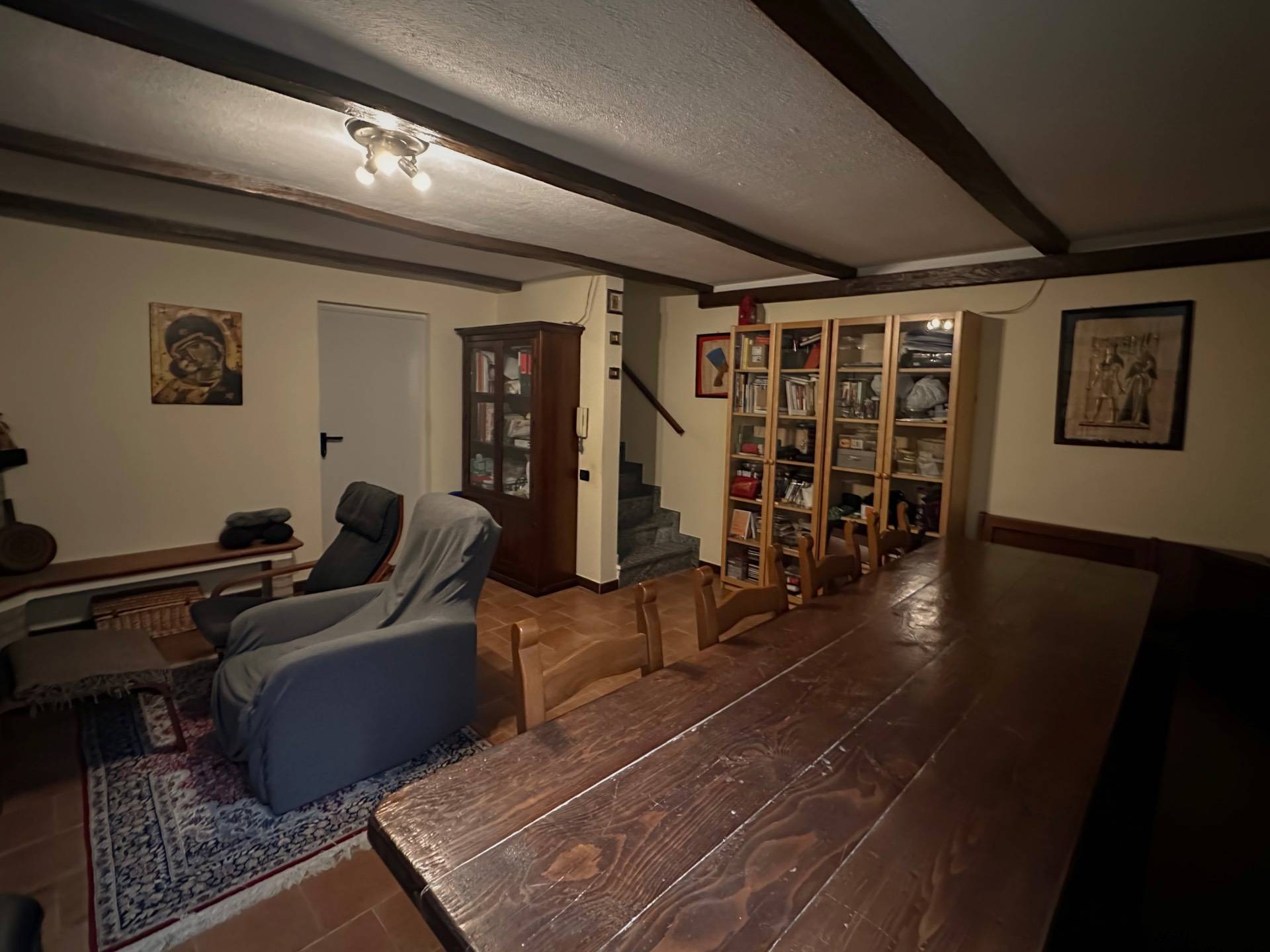 Nel seminterrato una grande taverna con camino crea un'atmosfera calda e accogliente, perfetta per le serate invernali, direttamente collegato troviamo il box di 25 mq che pu ospitare comodamente due macchine, garantendo sicurezza e comodit.