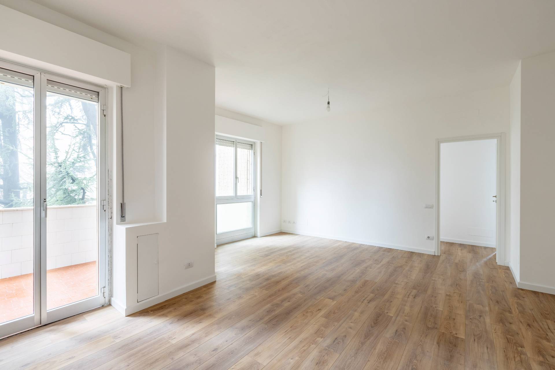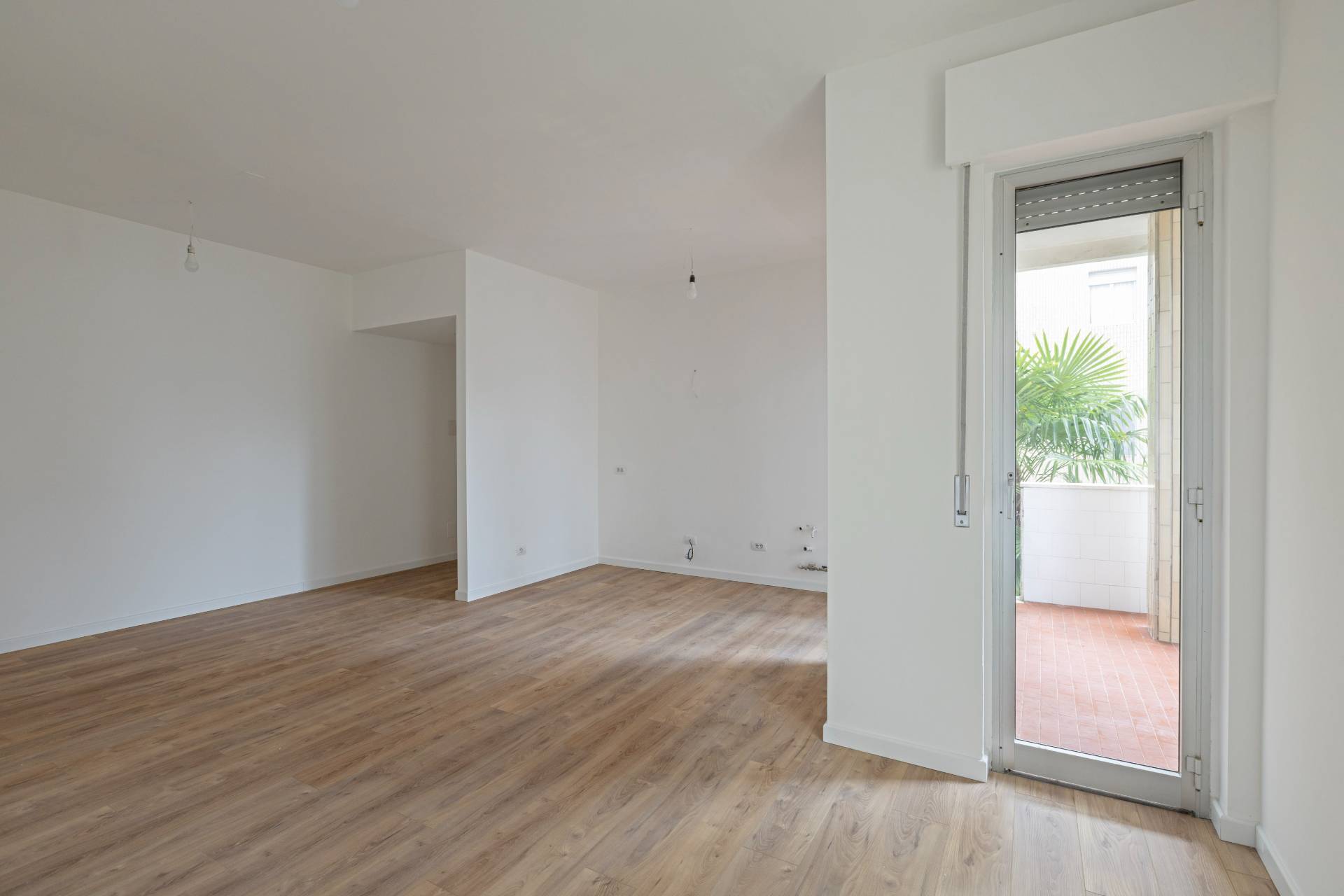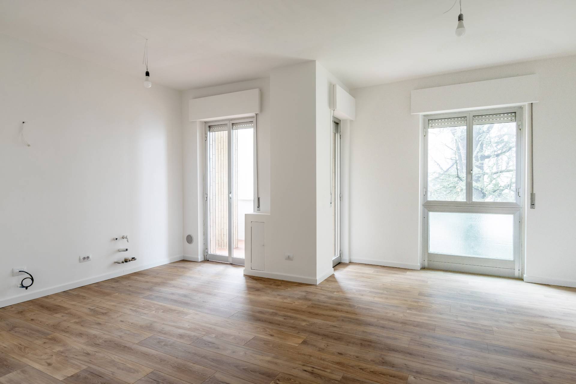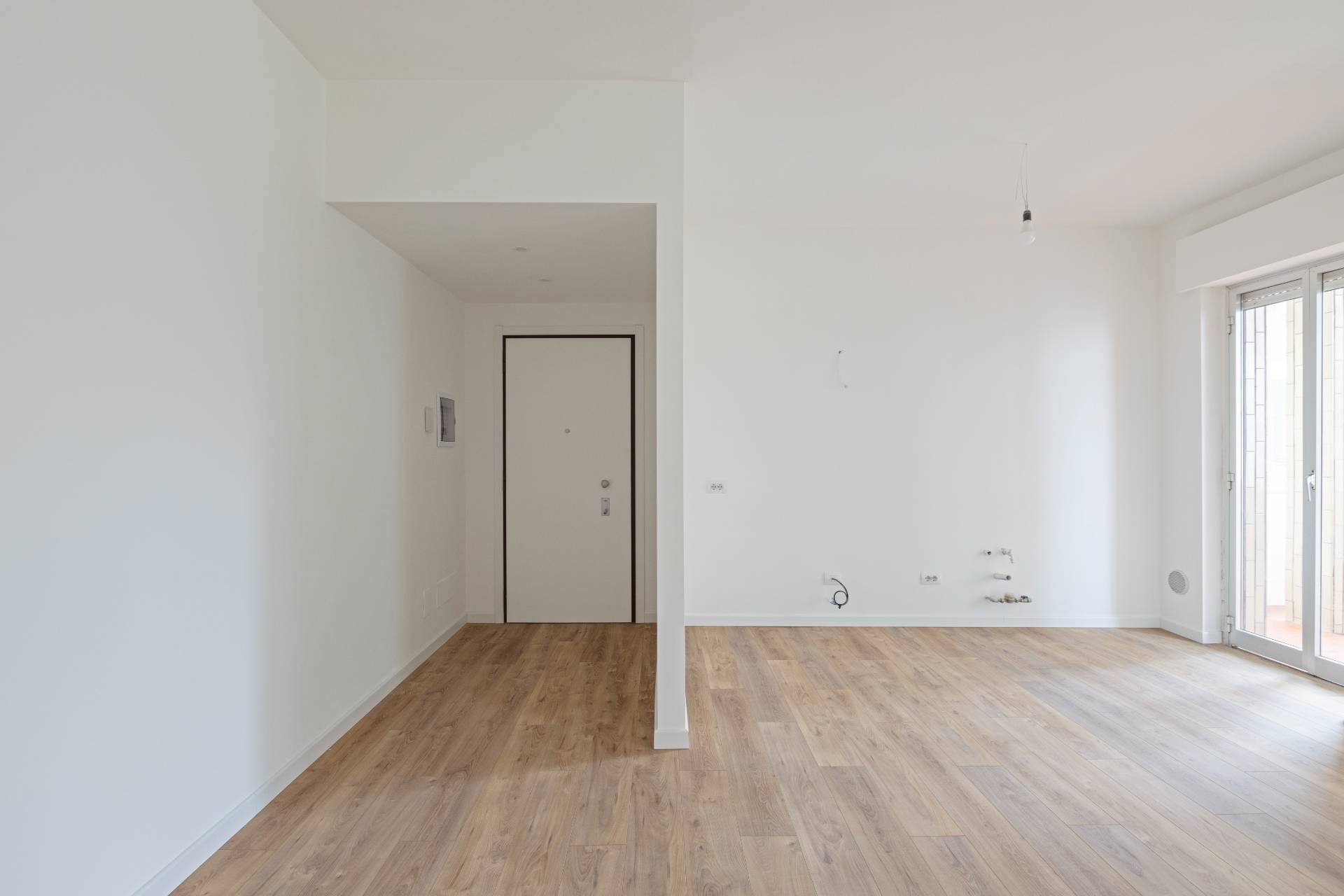 Lingresso, dotato di porta blindata, accompagna nellampia zona giorno con cucina a vista, uno spazio luminoso e conviviale, con accesso al balcone affacciato sul giardino condominiale, perfetto per godere di un affaccio verde e riservato.