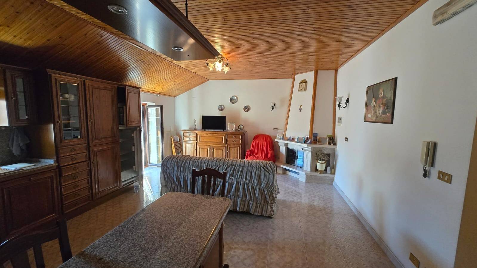 La zona giorno accoglie una sala con cucina a vista in legno massello, ampia e funzionale.