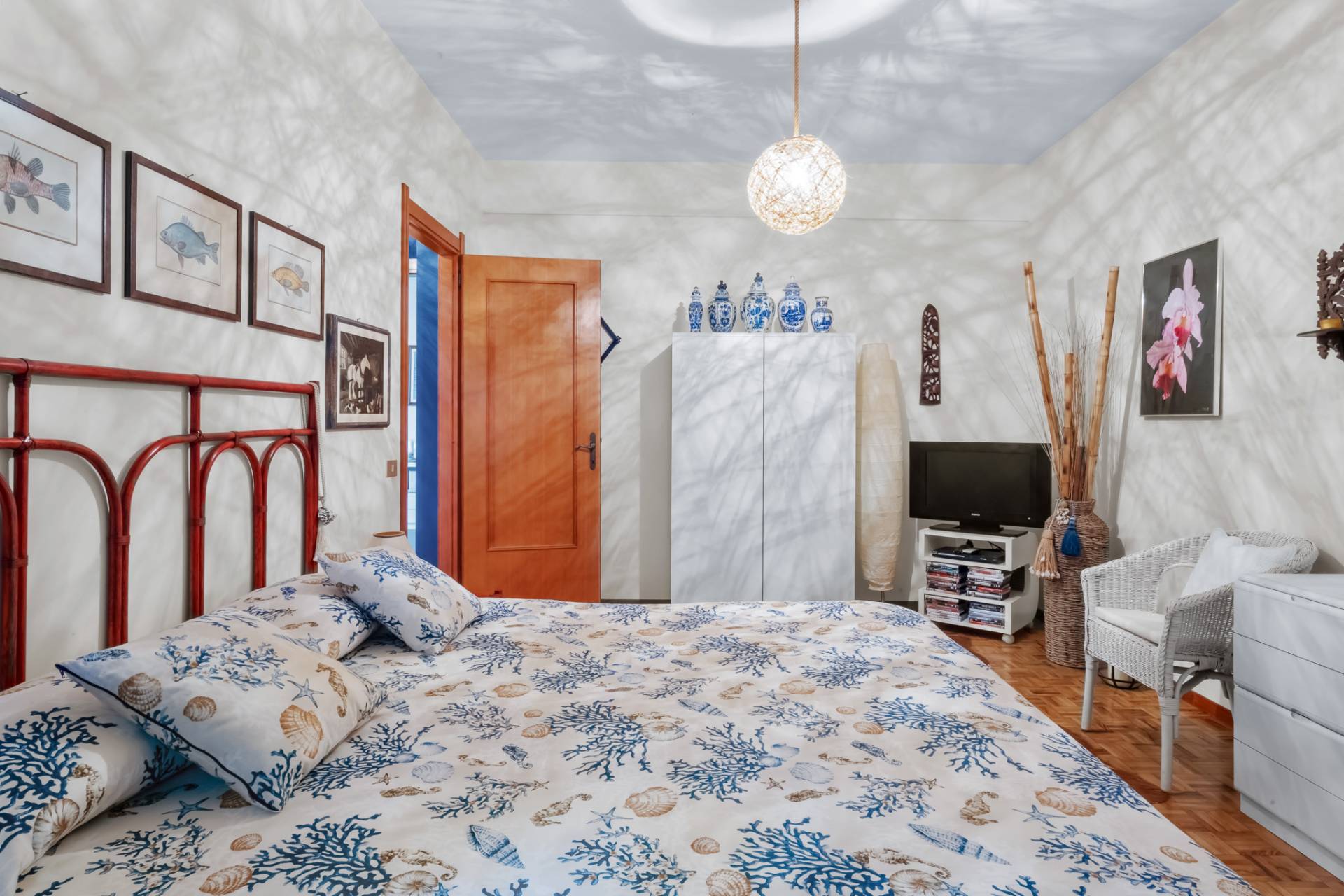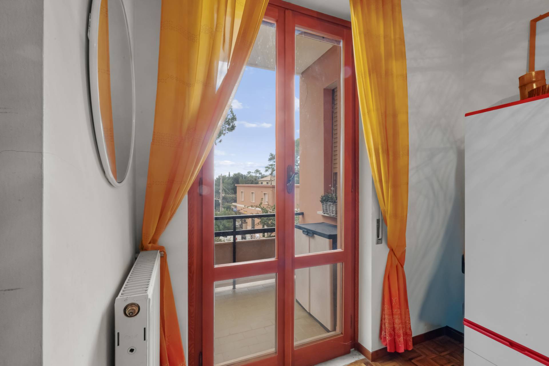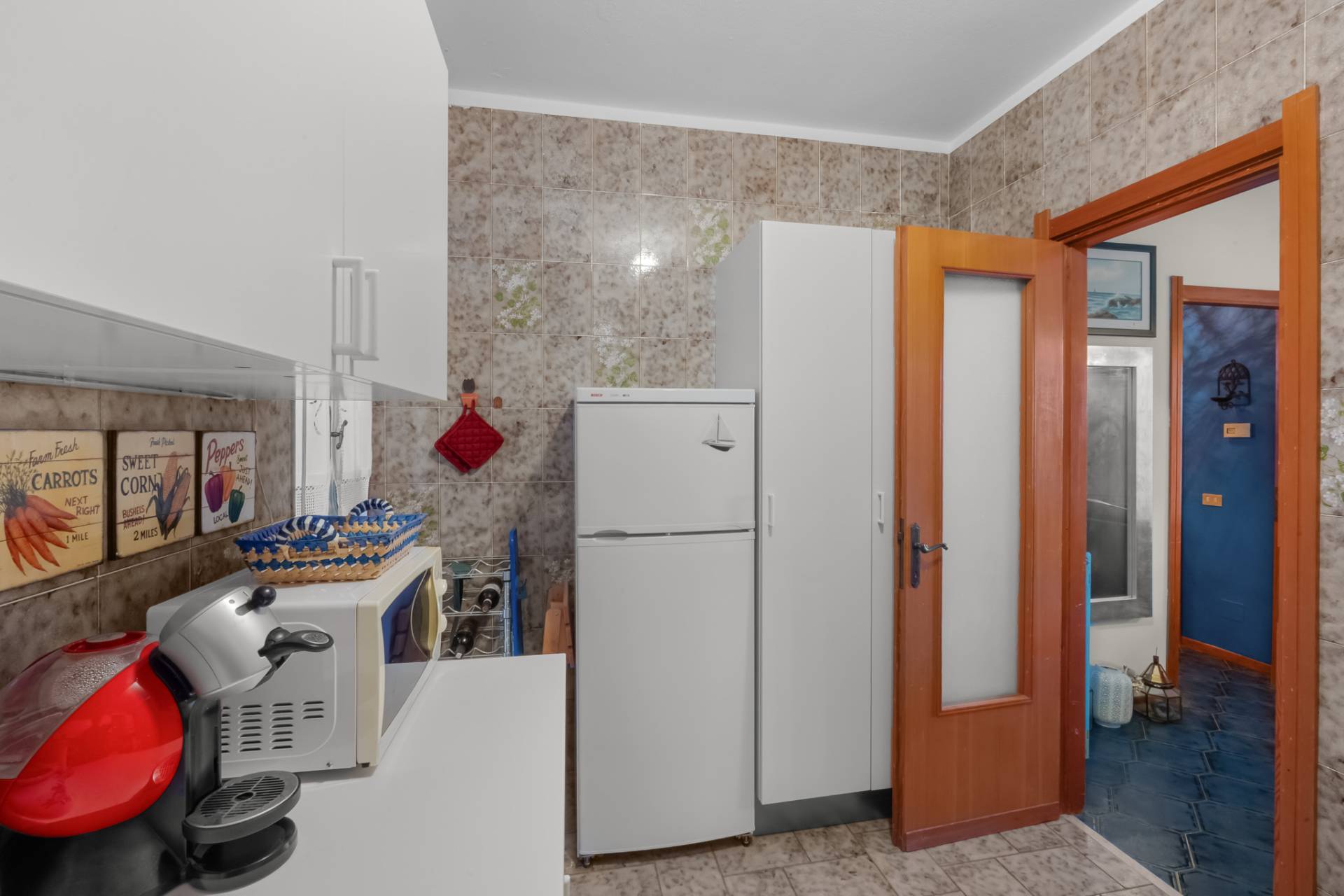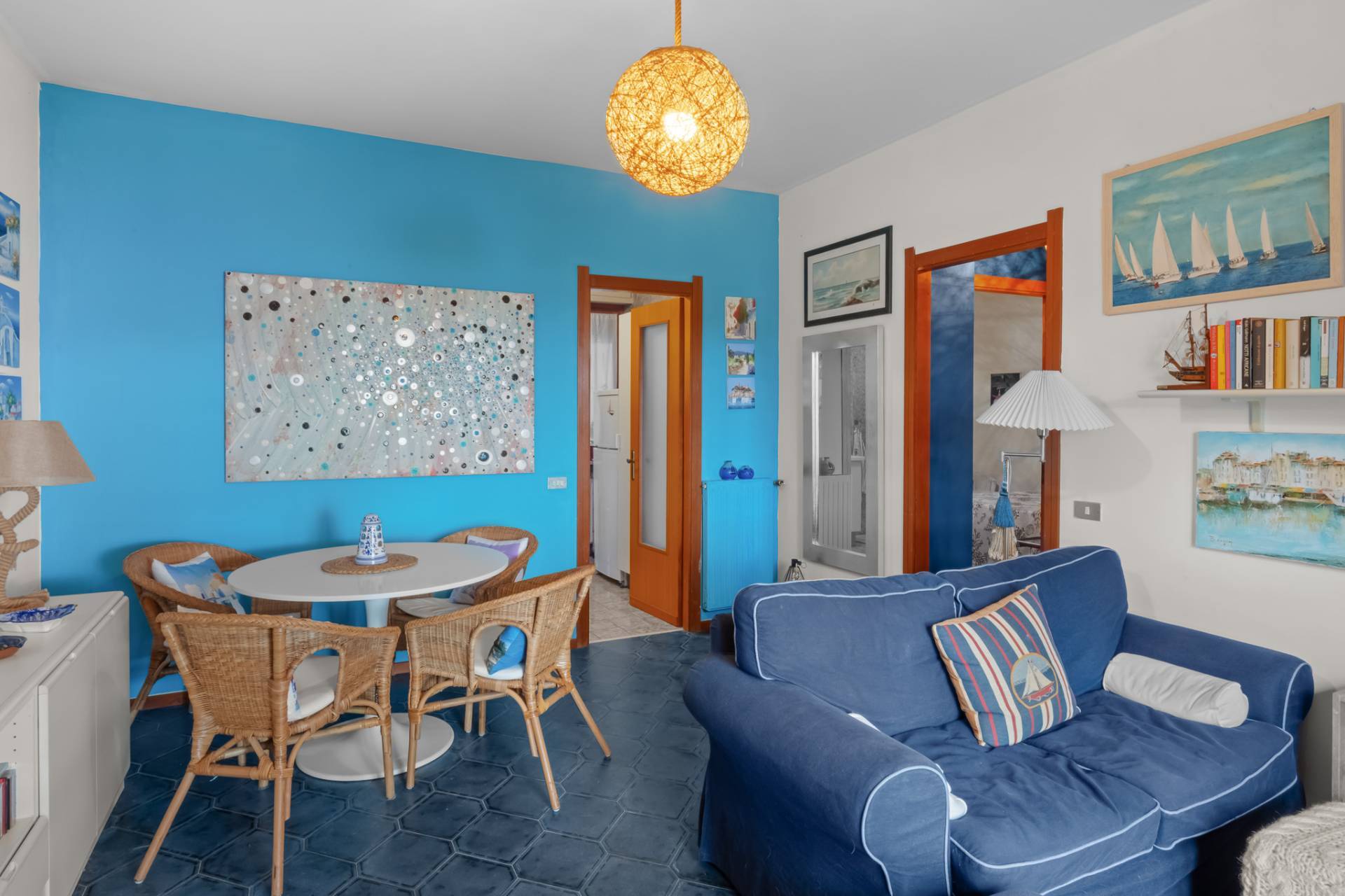 Lingresso conduce a un soggiorno luminoso impreziosito da una portafinestra con vista mare, che accompagna al balcone: uno spazio esterno piacevole, ideale per accogliere un tavolino e godere di pranzi e cene allaperto con il mare sullo sfondo.