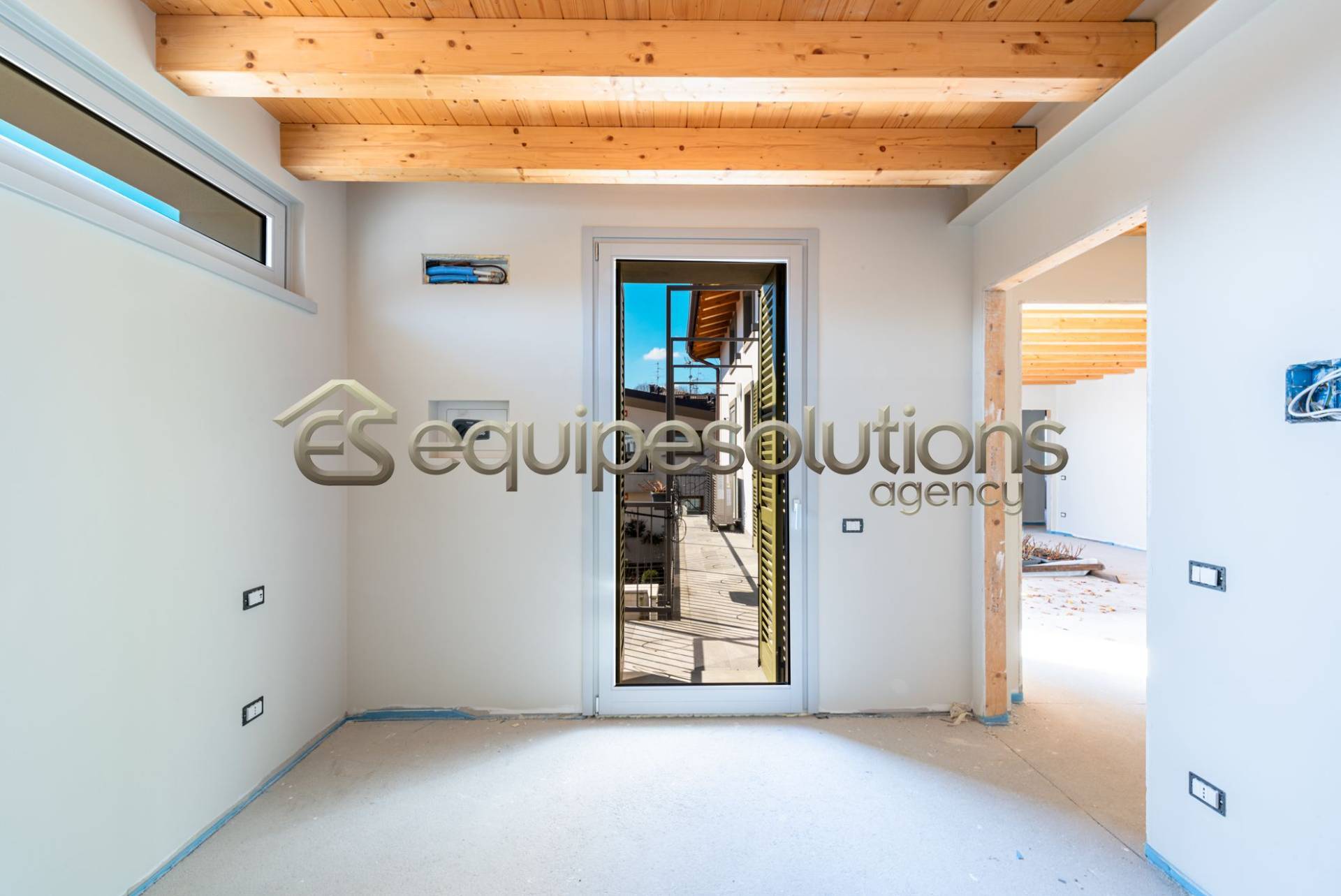 Internamente l'appartamento composto da ingresso, soggiorno, cucina, terrazzo, disimpegno, camera matrimoniale con cabina armadio e bagno, due camere da letto con due bagni.