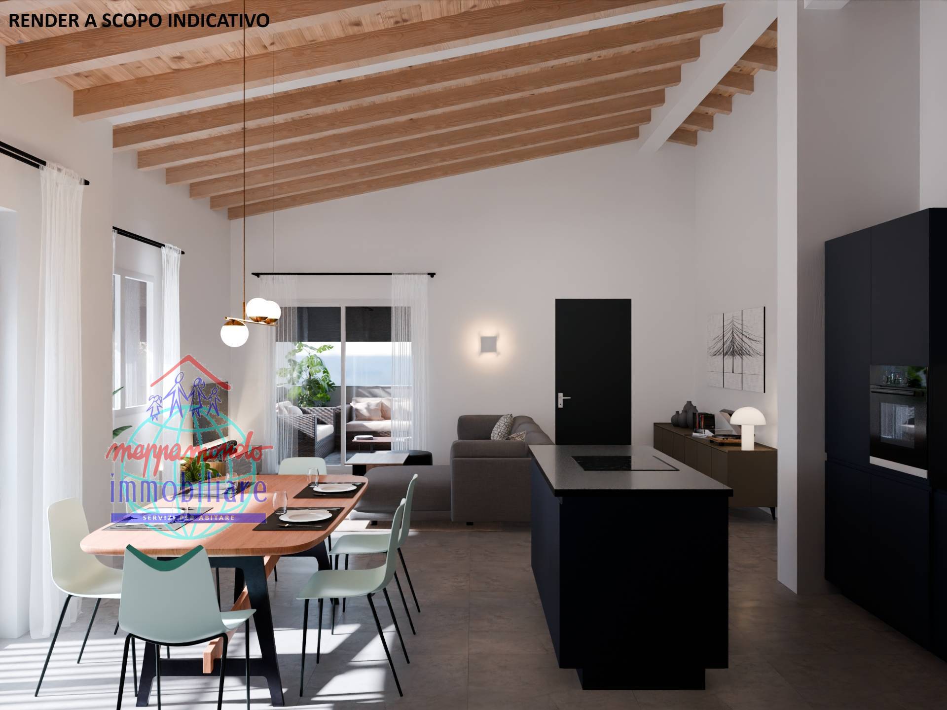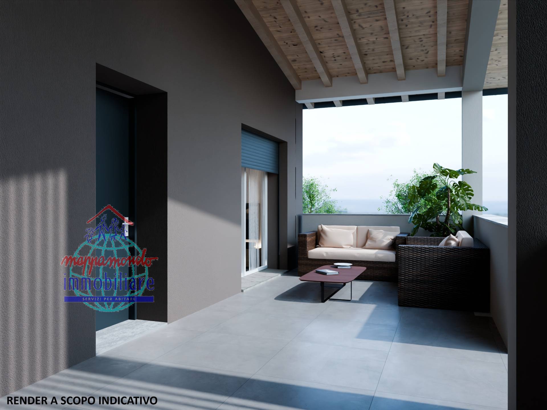Piano primo con accesso da scala esterna privata ingresso su ampia zona giorno con cucina a vista di circa 40mq e terrazzo abitabile Disimpegno 3 Camere di cui una con balcone 2 bagni Alcune caratteristiche: costruzione antisismica fondazioni in cemento armato e ferro ,con vespaio d'areazione dotato di isolamento riscaldamento a pavimento in pompa di calore tetto in legno con travi a vista predisposizione climatizzazione pannelli fotovoltaici per la produzione di energia elettrica struttura coibentata con mattone isolato infissi ad alto risparmio energetico doppio vetro PVC bianco con apertura anti-ribalta tapparelle motorizzate Il design moderno ed innovativo, unito alla eco-compatibilit, danno vita a queste esclusive abitazioni uniche nel loro genere! Questa monofamiliare ha la possibilit per i futuri proprietari di personalizzare gli interni secondo i propri gusti e necessit.