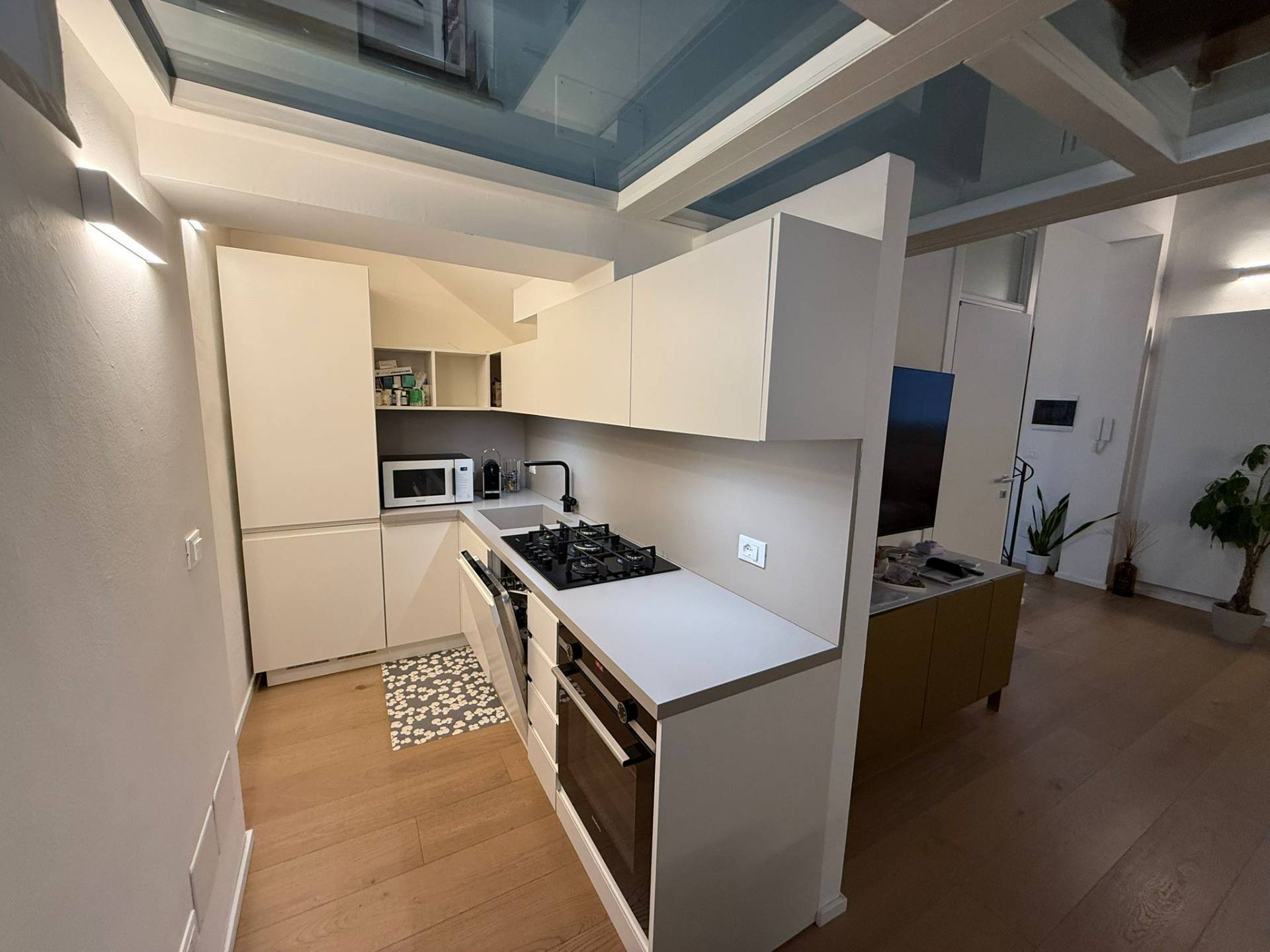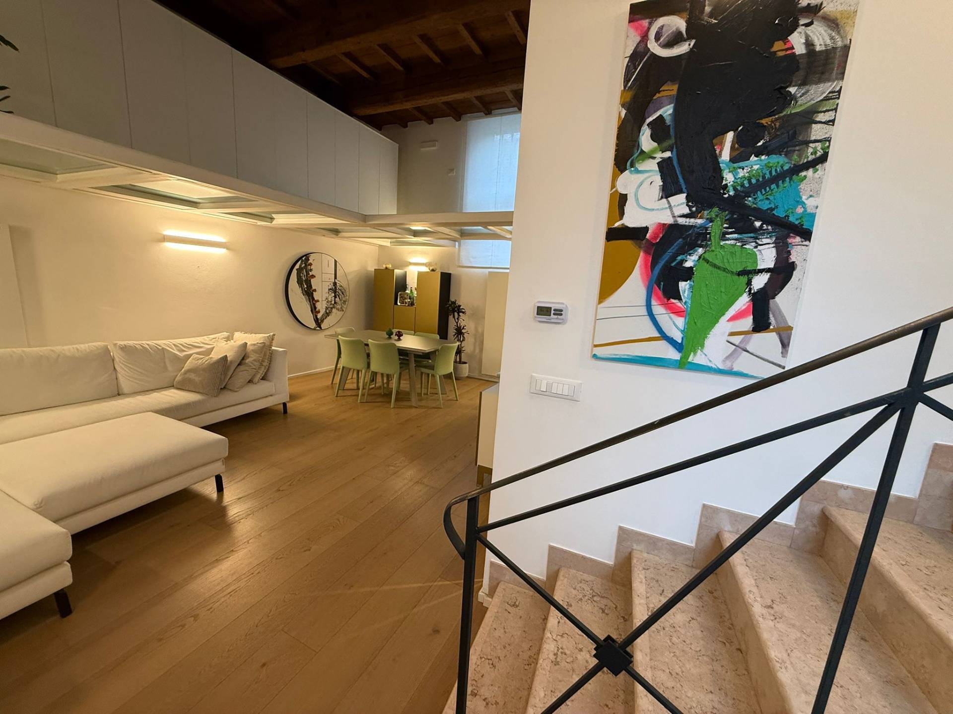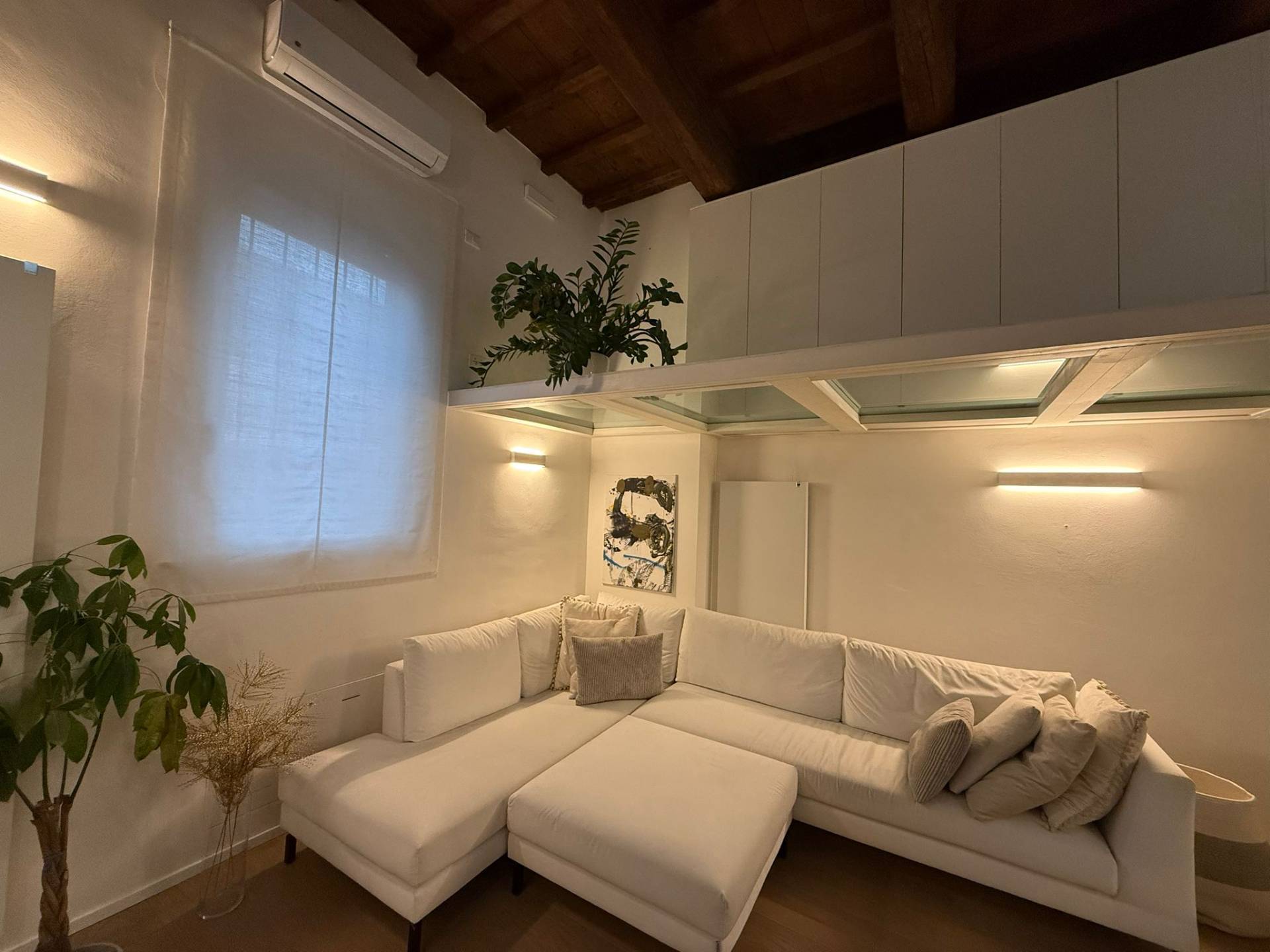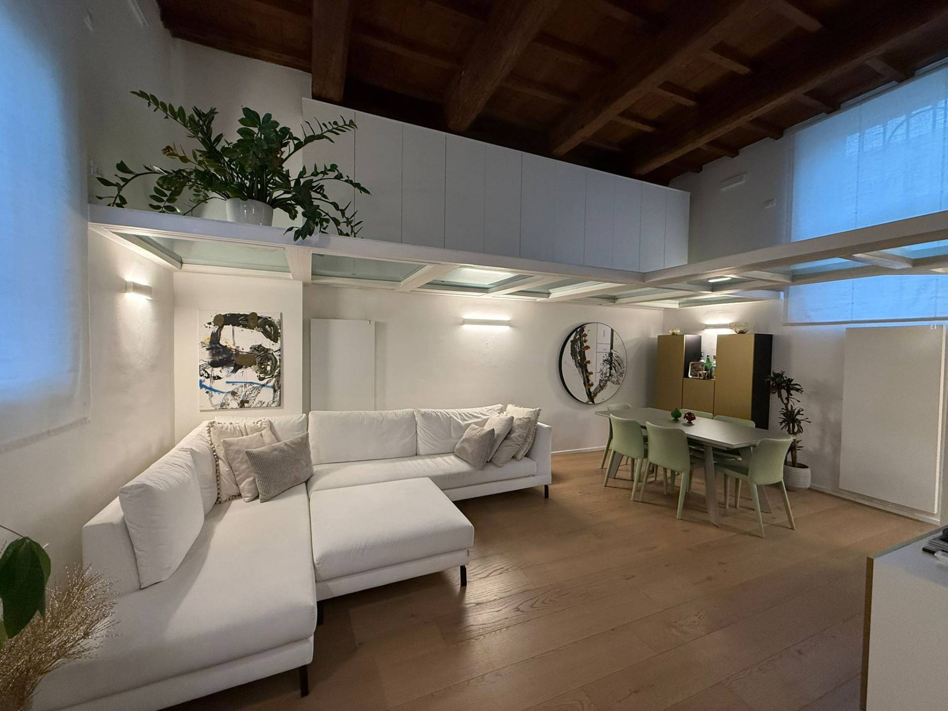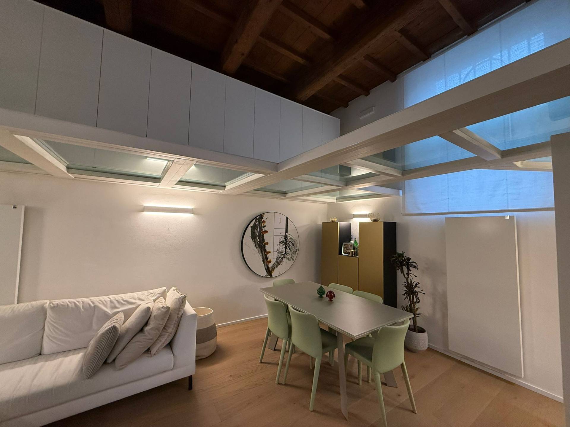 Ingresso su luminosa zona living open space, angolo pranzo, cucina a vista, bagno con box doccia rivestito completamente in resina, soppalco in vetro ideale come zona armadiatura o studio, soffitti a cassettoni di 5 mq. di altezza.