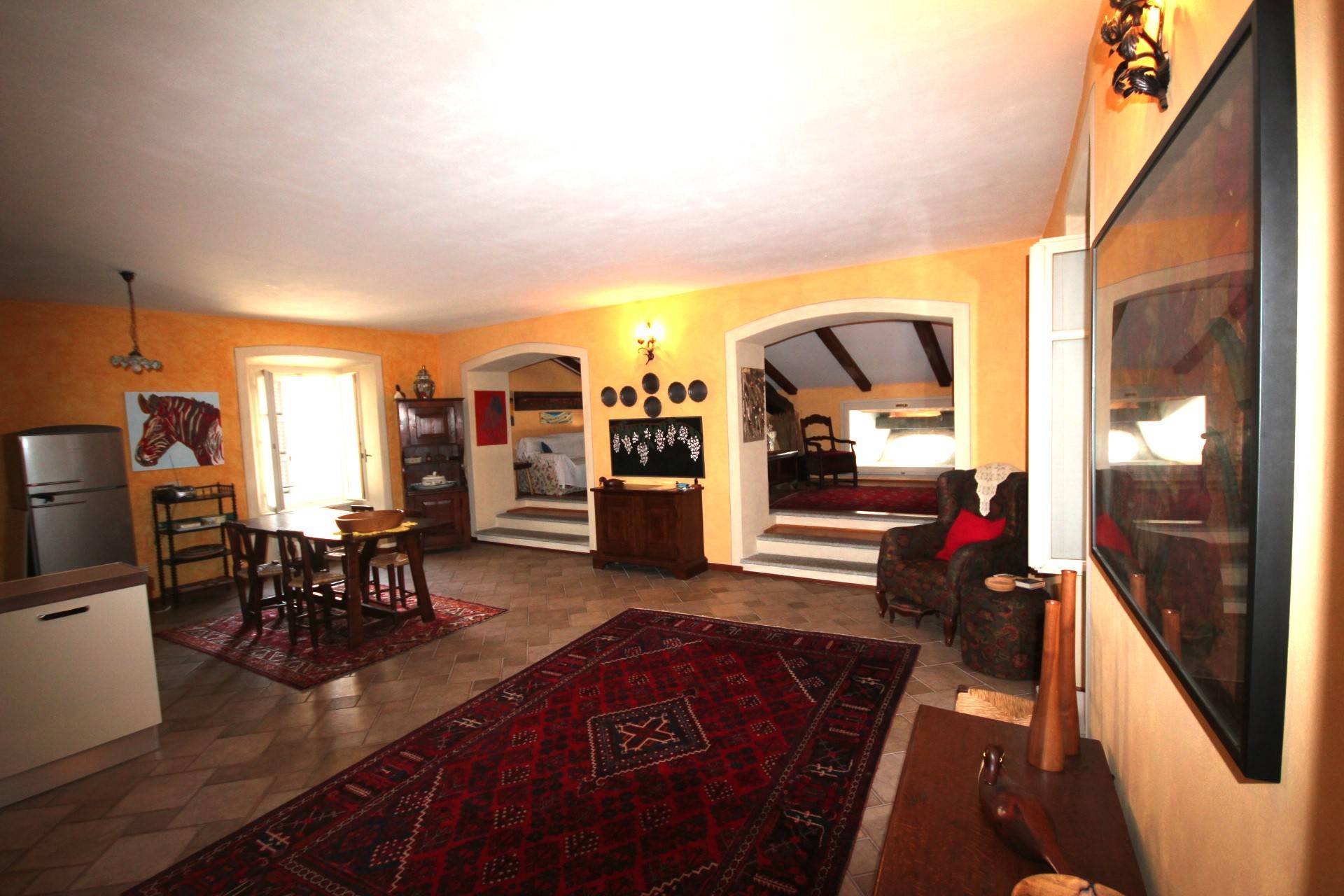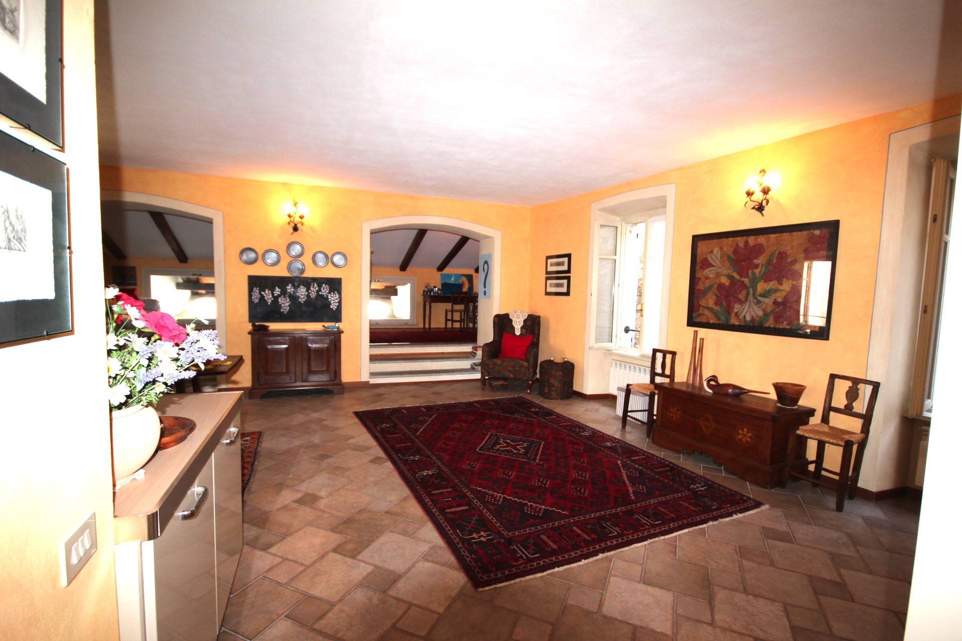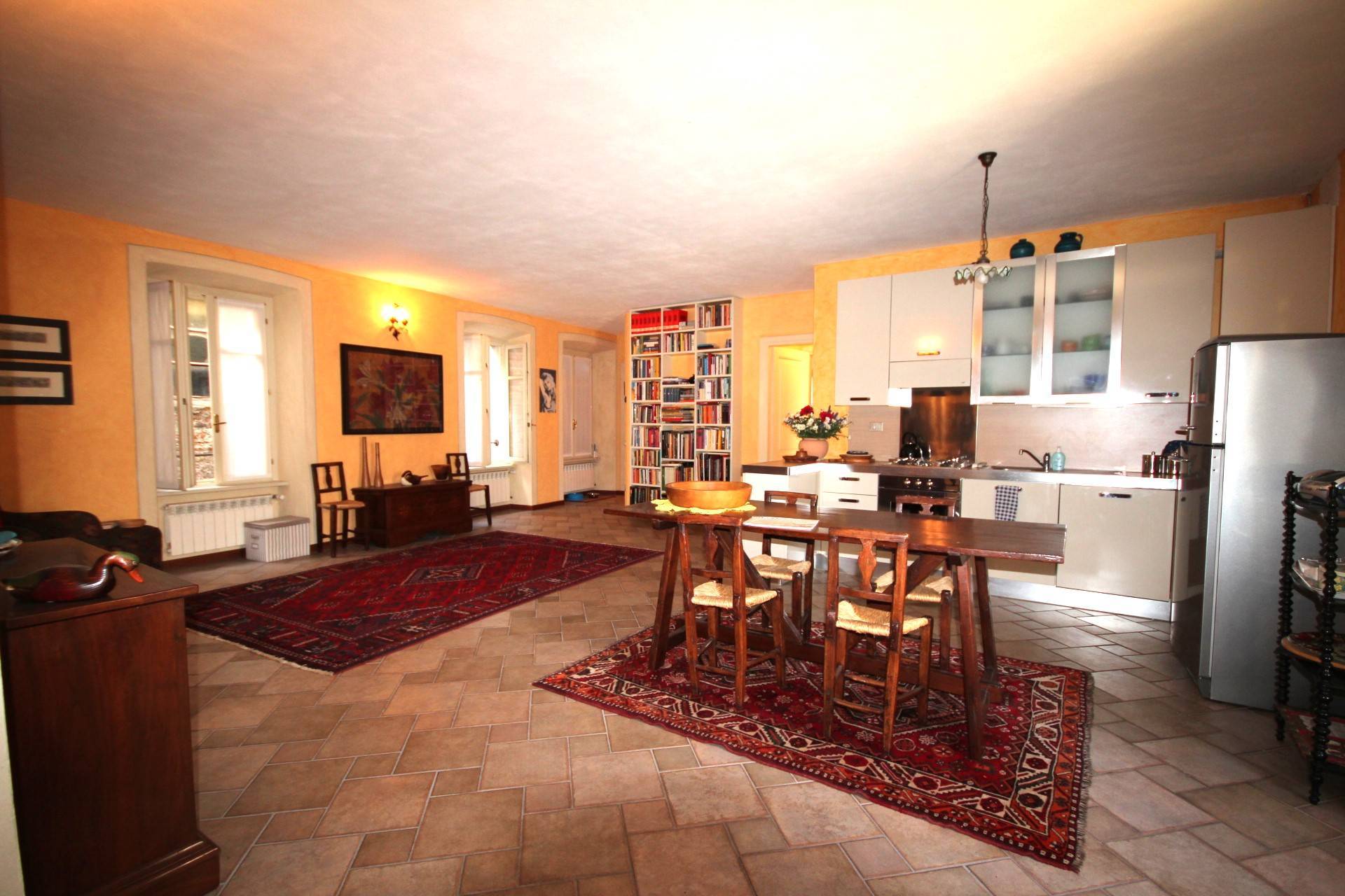 Lampio soggiorno, di circa 50 mq, ricco di finestre e con una moderna cucina a vista completamente accessoria, presenta due arcate simmetriche, al di l delle quali posizionato un accogliente salotto, con pavimenti in parquet, caratterizzato da antichi oblo dai quali si scorge la piazza ed il lago. Sul lato opposto, si trova una spaziosa camera da letto, con pavimento in parquet, che dispone di un grazioso vano da adibire a cabina armadio e di un balconcino con vista sulle case storiche del lungolago.