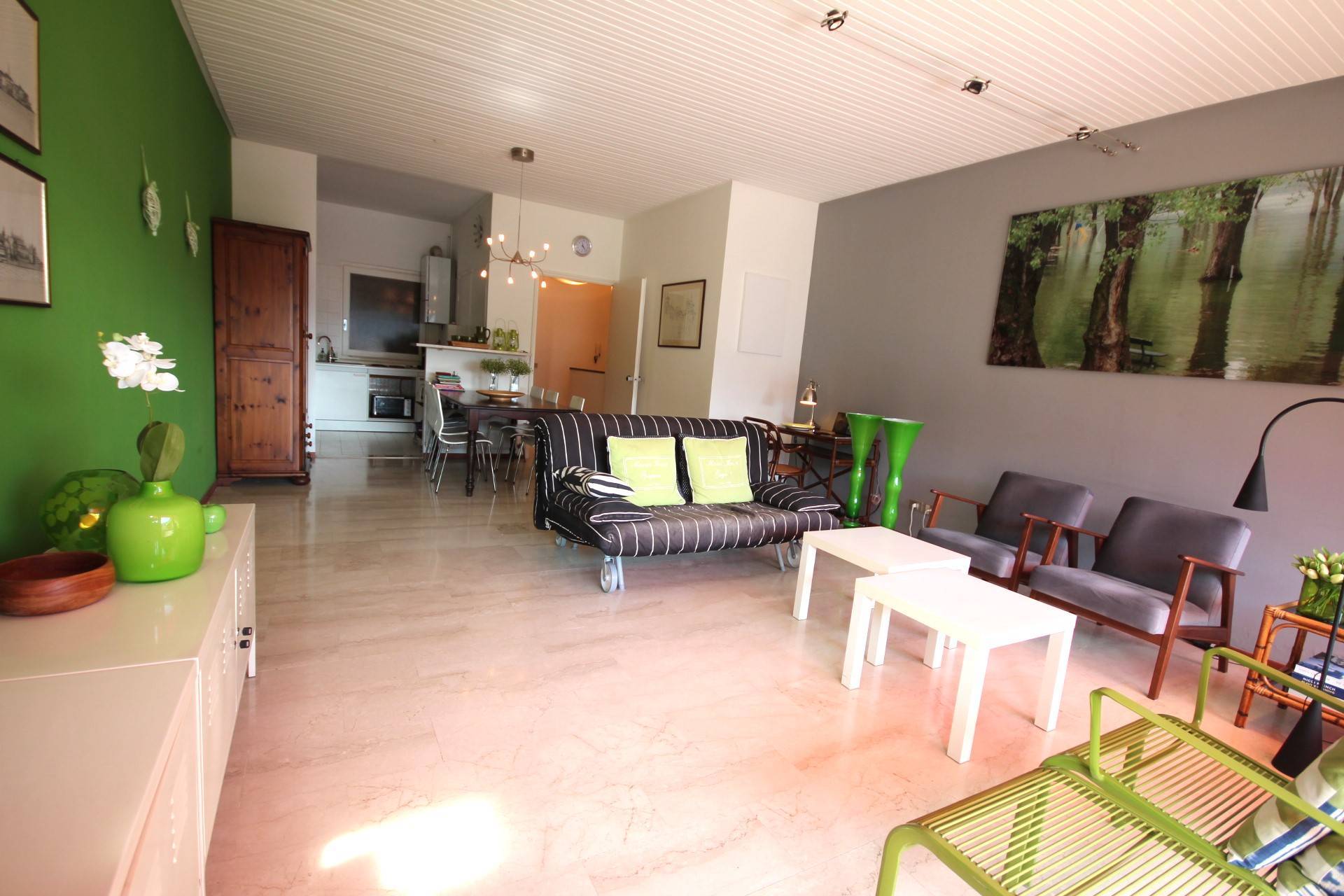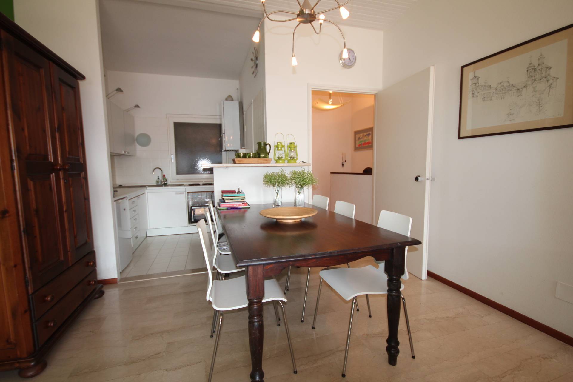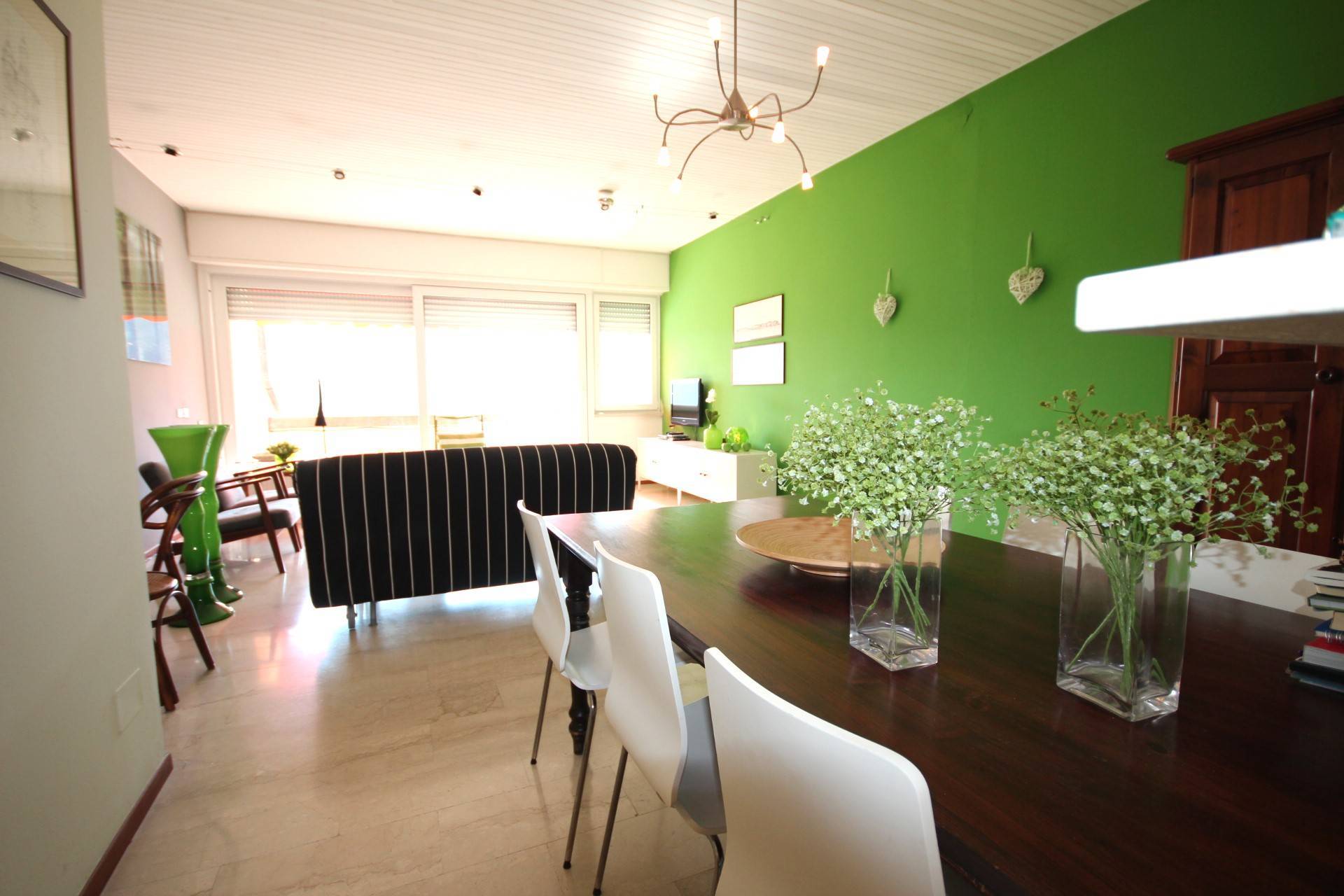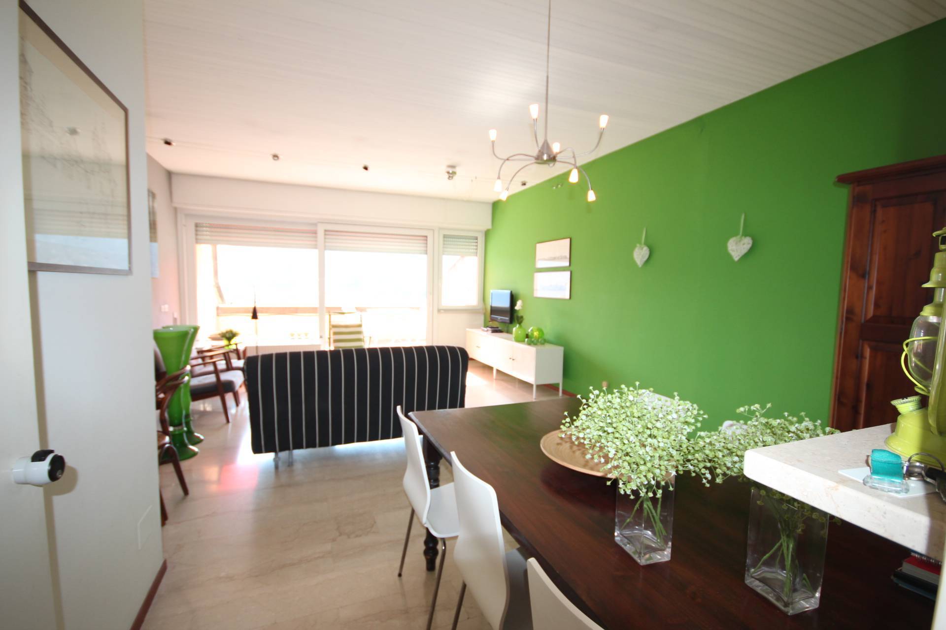 Lappartamento, che completamente arredato, molto piacevole ed caratterizzato da pavimenti in travertino chiaro, finestre scorrevoli in pvc con doppio vetro, tende da sole recentemente sostituite.