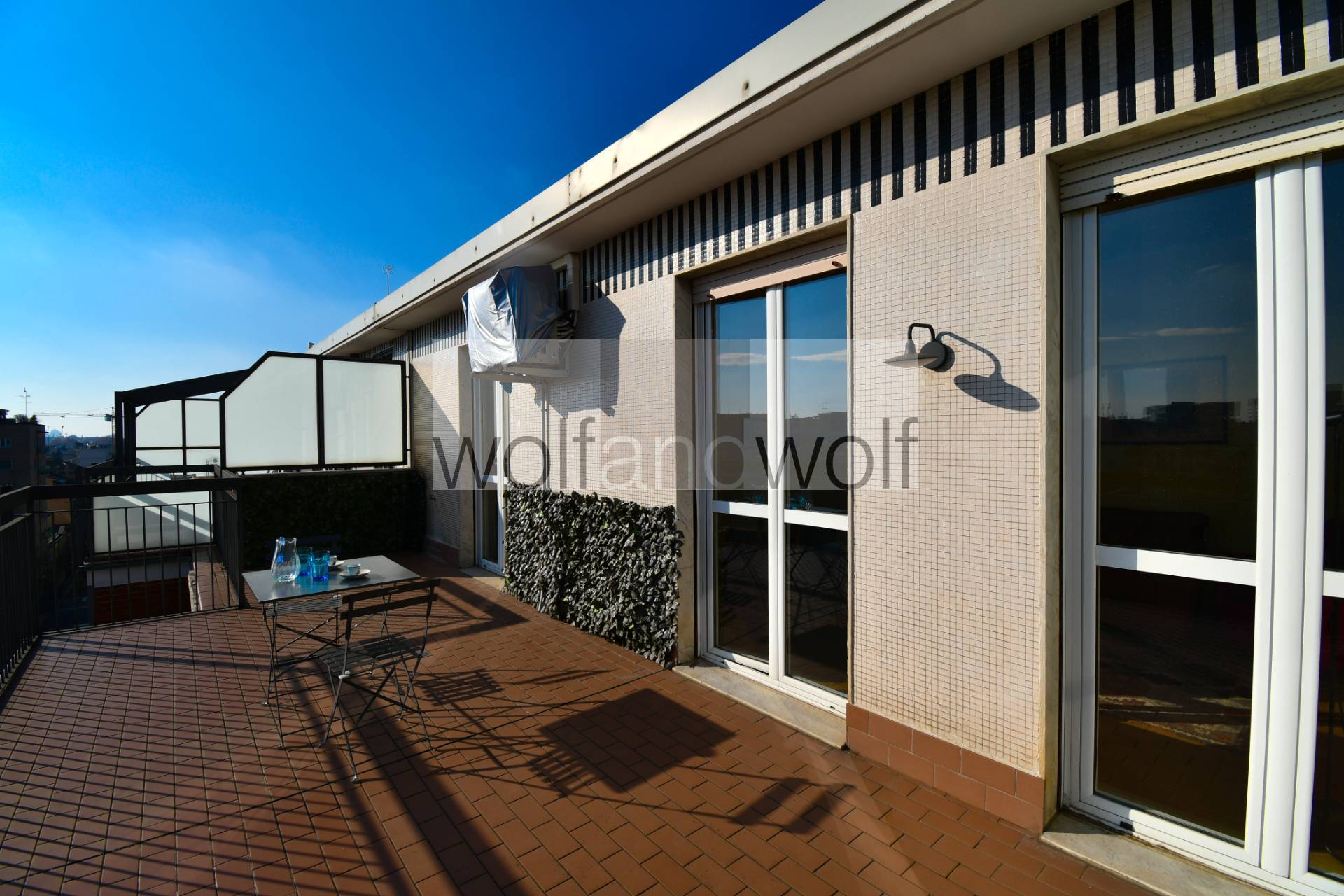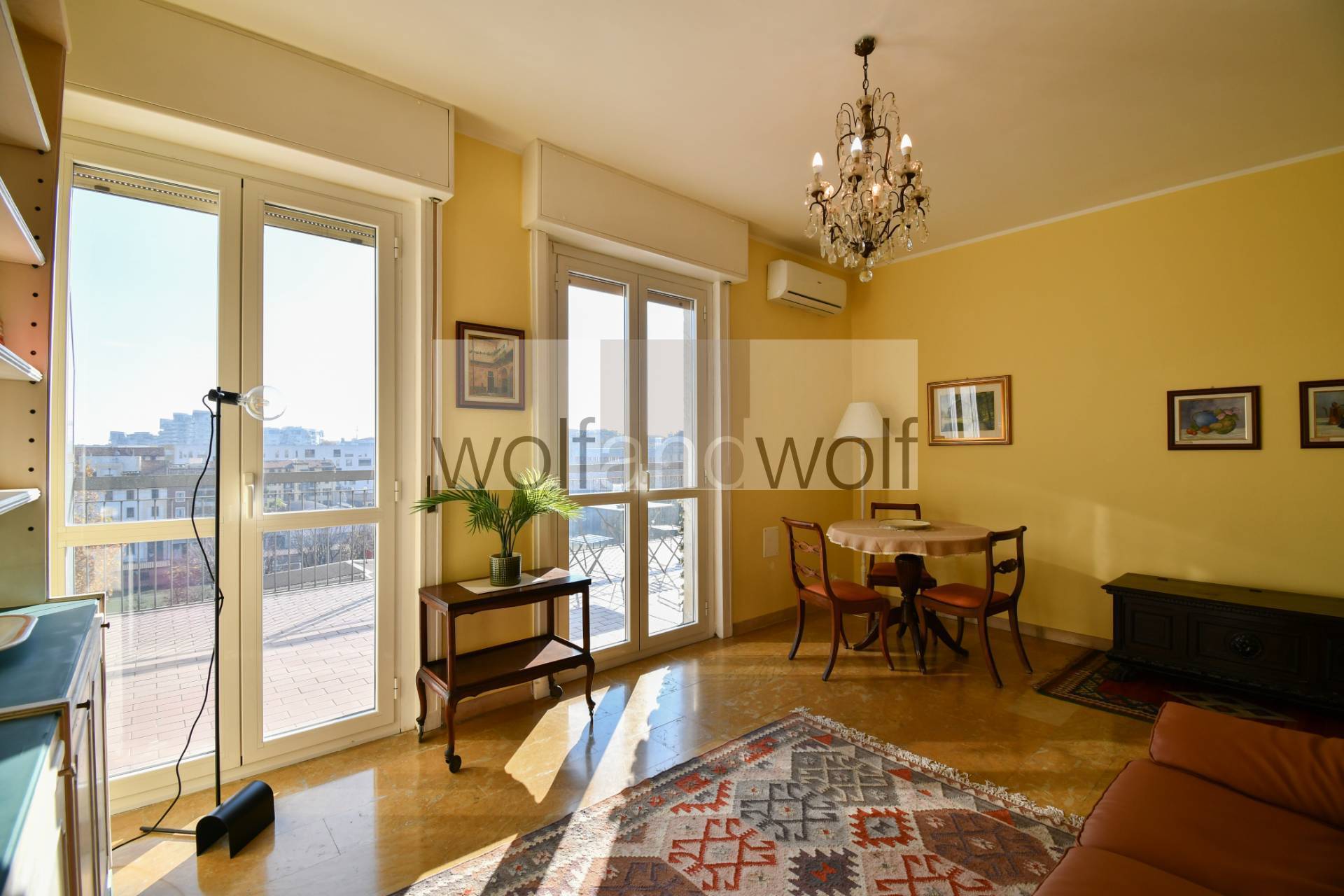 Attico trilocale con ampio terrazzo Zona Tre Torri / ex Fiera In locazione Proponiamo in affitto un luminoso trilocale arredato con grande terrazzo al piano, situato al sesto e ultimo piano di uno stabile medio-signorile degli anni 60 in ottimo stato, dotato di ascensore.