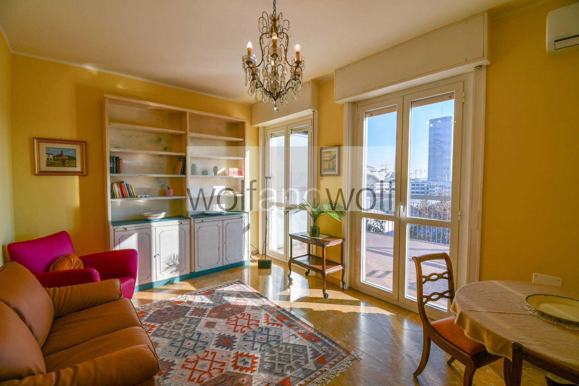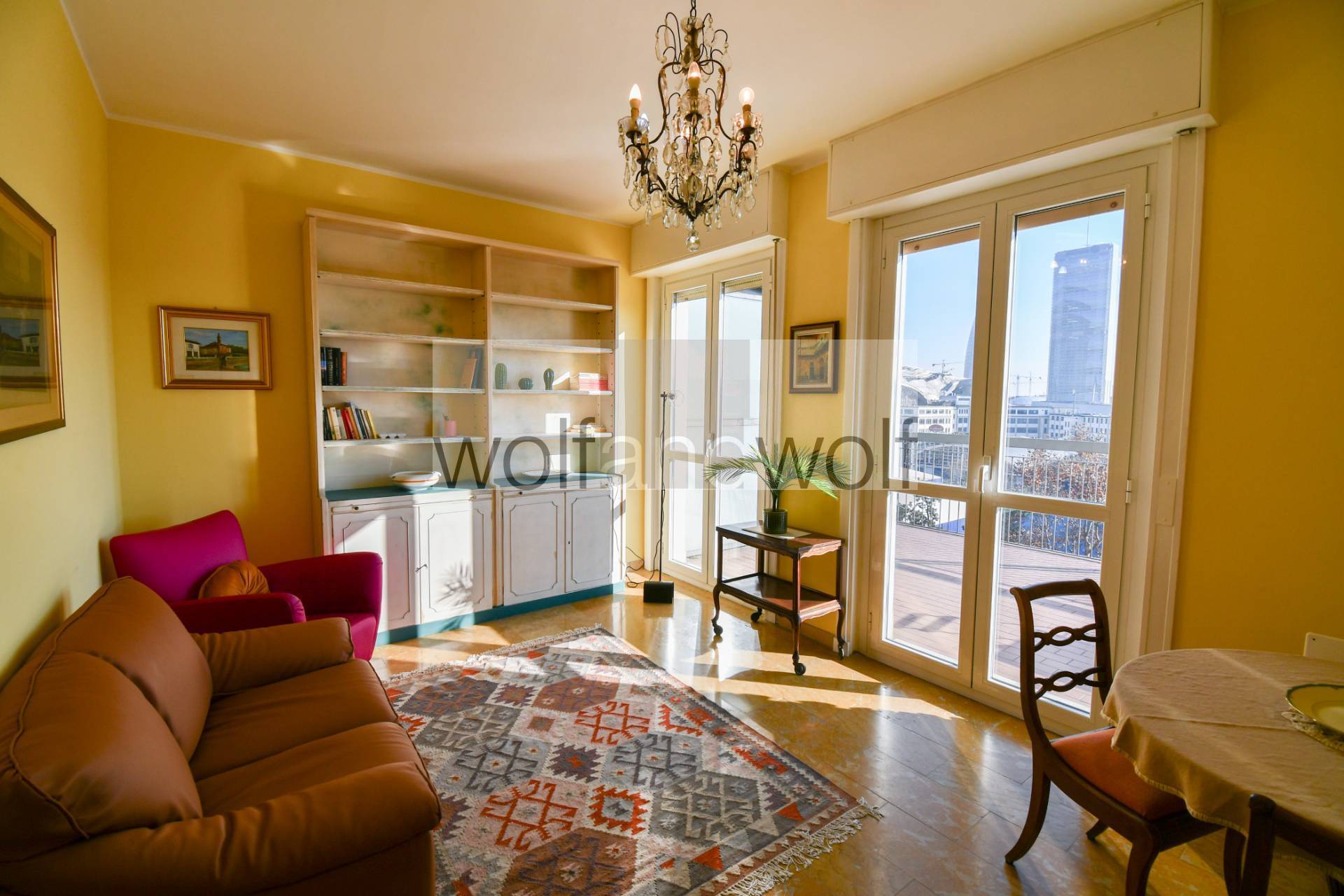 Appartamento composto da : ingresso, soggiorno con doppia apertura sul grande terrazzo vivibile con vista sulle Tre Torri di City Life, cucina semi - abitabile con balcone, due camere da letto e bagno finestrato con doccia.