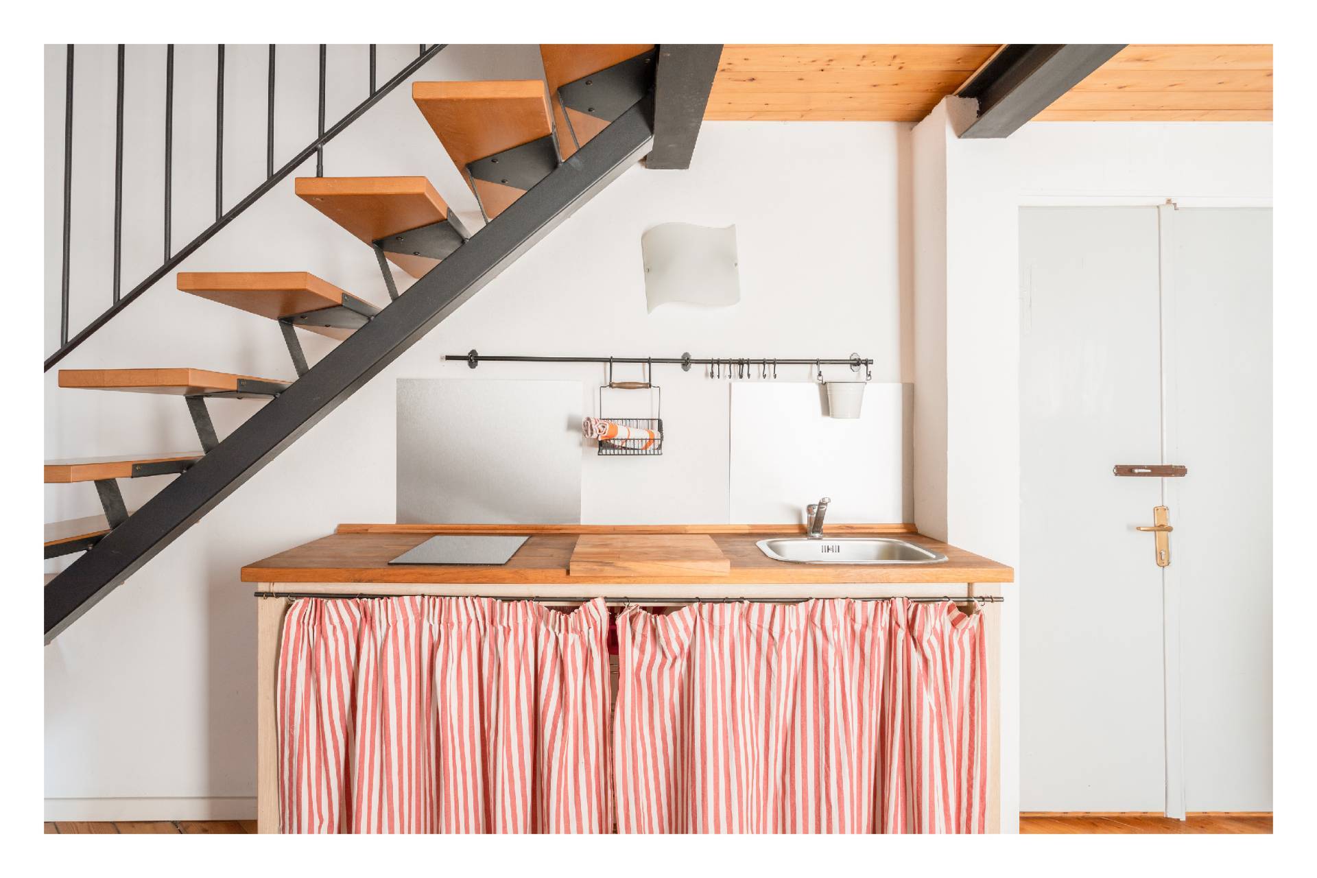 La terrazza organizzata con tavoli, sedie e sdraie per godersi le giornate di sole. Langolo cottura dotato di piastra a induzione, frigo, macchina da caff, stoviglie necessarie a preparare le pietanze per i pasti.