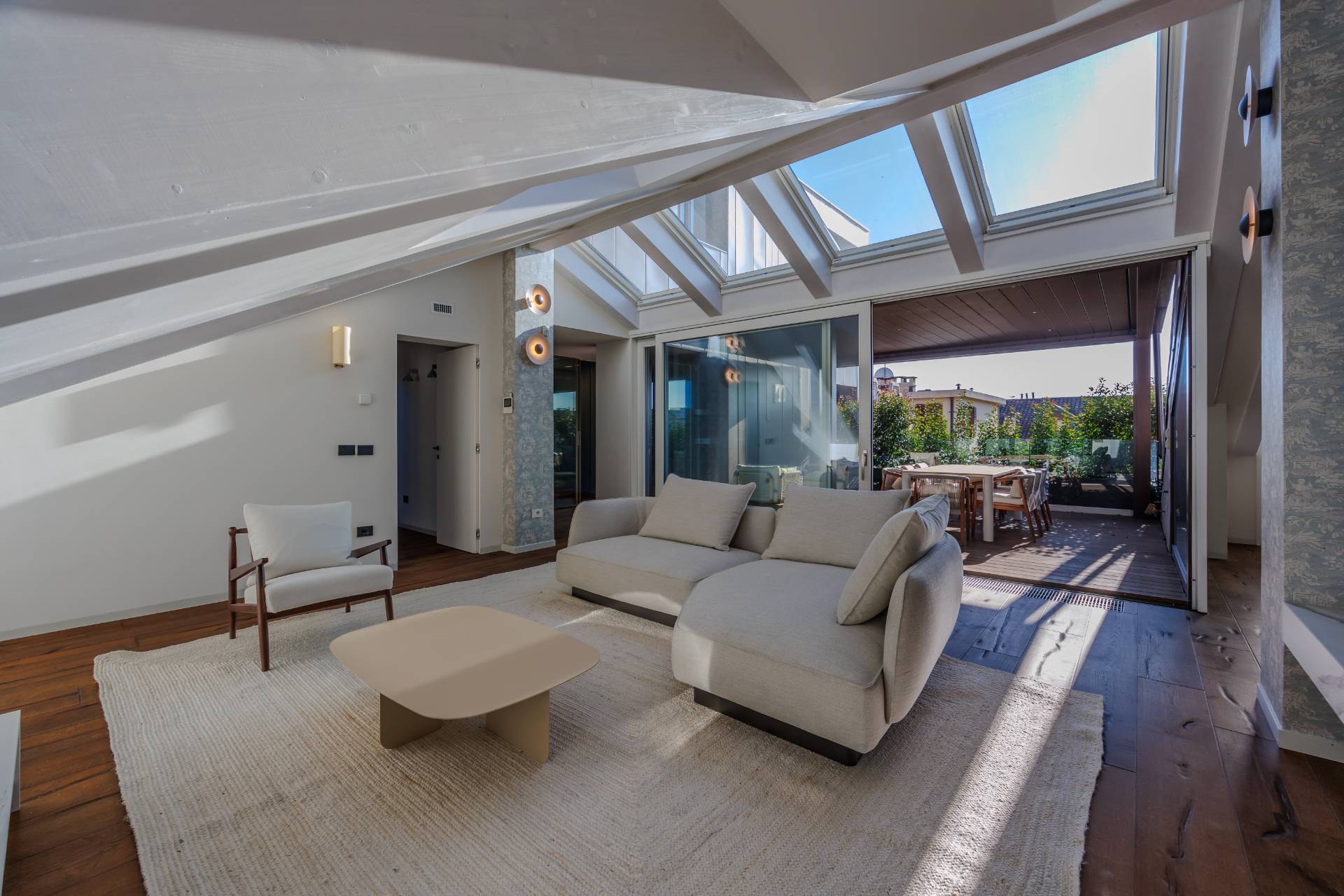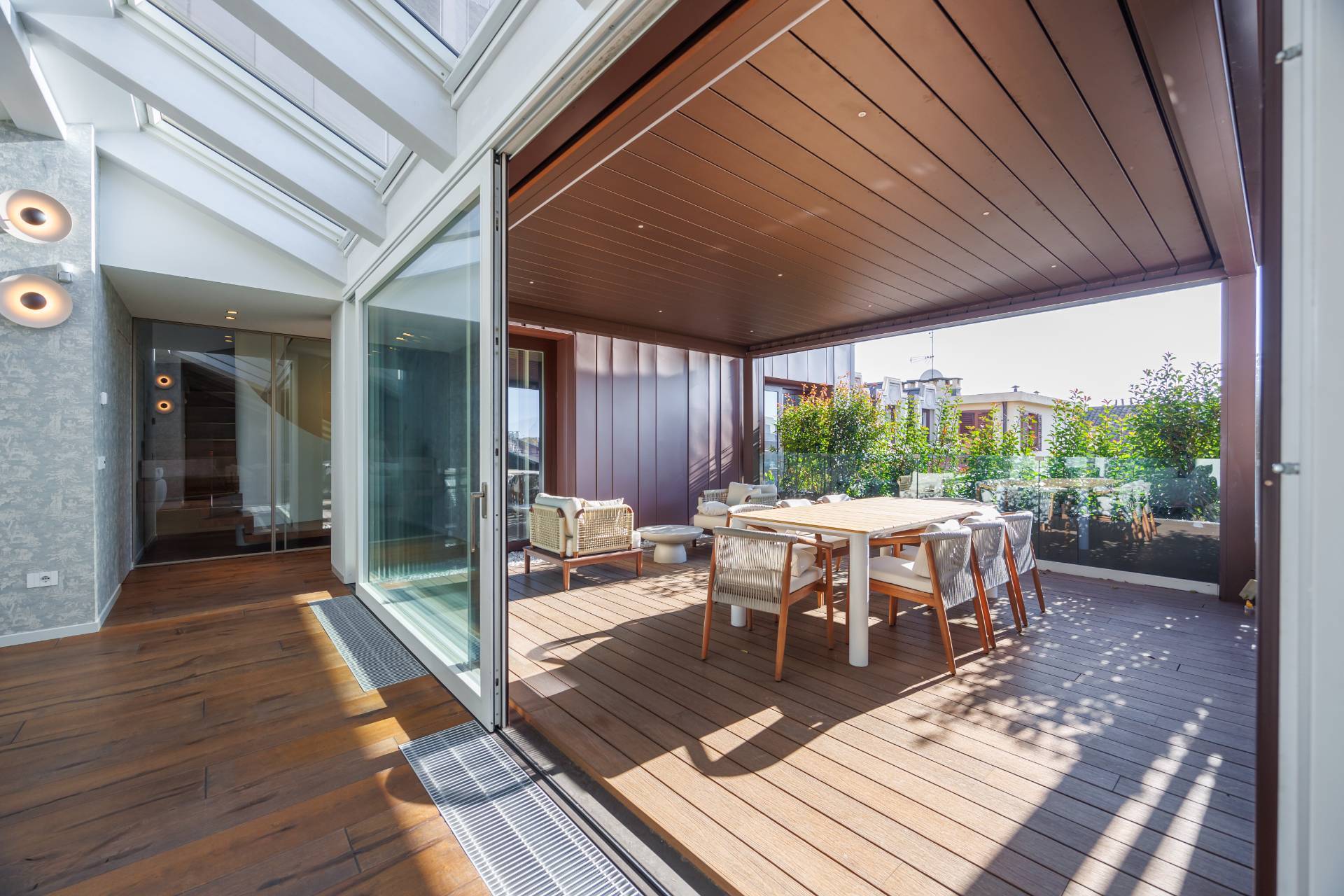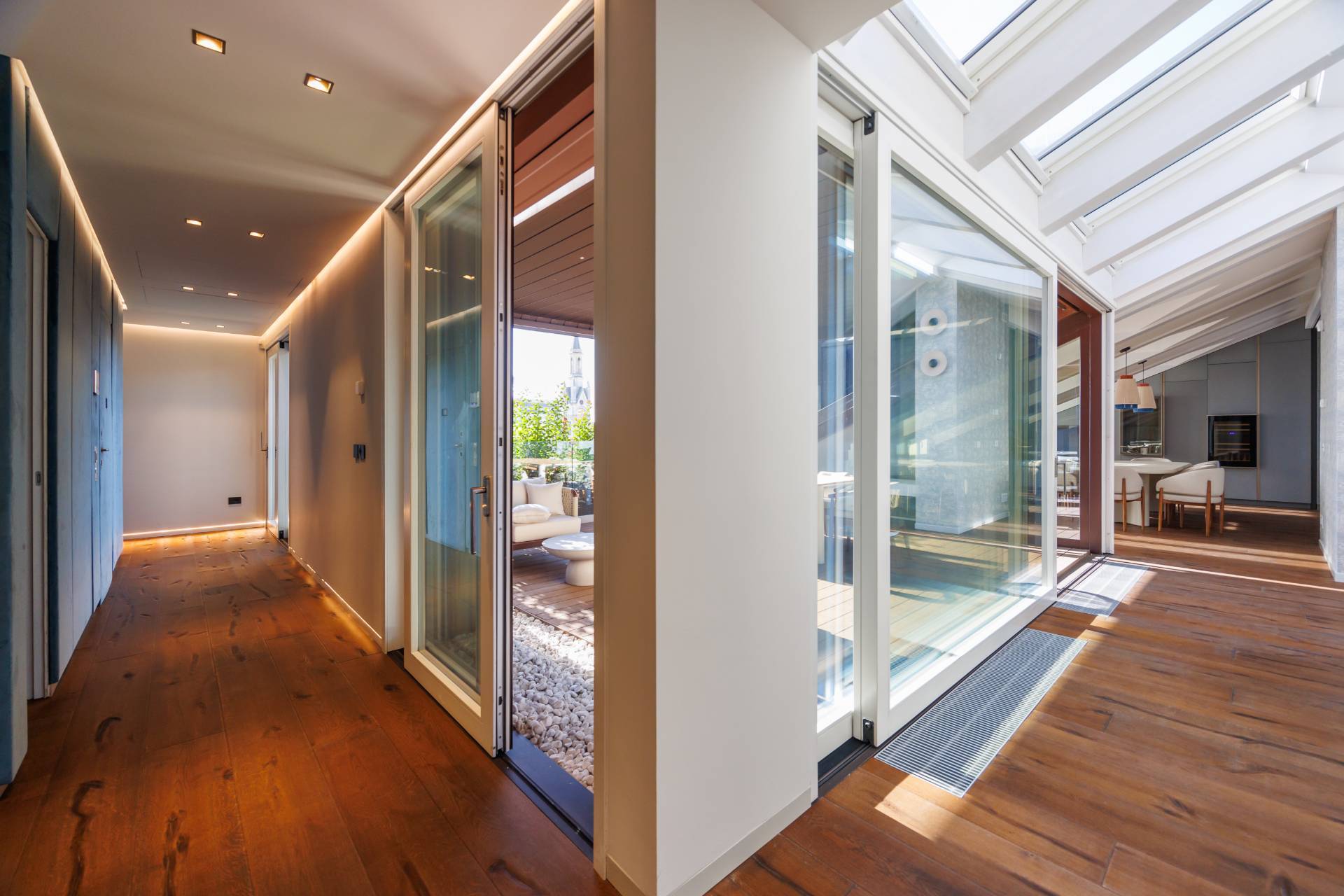 Lappartamento si sviluppa attorno alla grande terrazza panoramica, separata da un ampia parete vetrata.