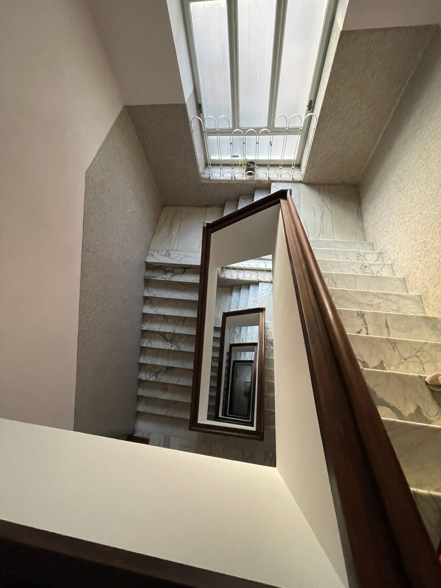 La superficie di 400 metri quadrati circa articolata su pi piani: al piano principale (4° ed ultimo con ascensore) la grande zona giorno distribuita a corona del terrazzo; al piano superiore mansardato si trovano le camere da letto e al sesto piano lo studio con la soprastante torretta.