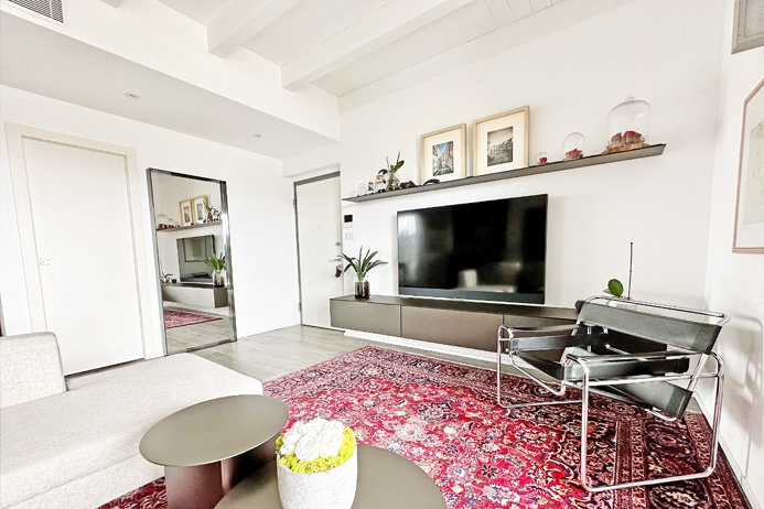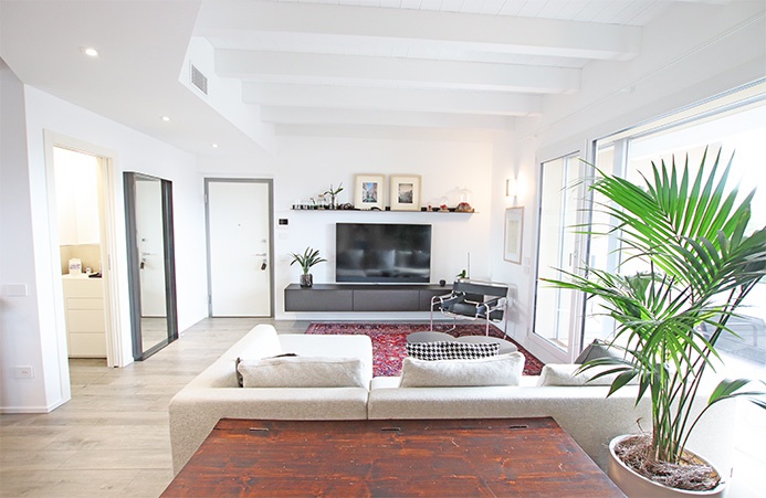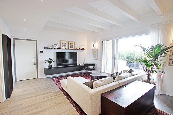 Internamente l'appartamento perfettamente rifinito in ogni dettaglio, pavimentazioni in gres simil legno dalla massima durabilit e semplicit di manutenzione, eleganti bagni moderni con sanitari sospesi, doccia e vasca da bagno, oscuranti glisser motorizzati, antifurto, rifiniture di design, impianto di riscaldamento e raffrescamento a pavimento, impianto di ventilazione meccanica forzata con deumidificazione.