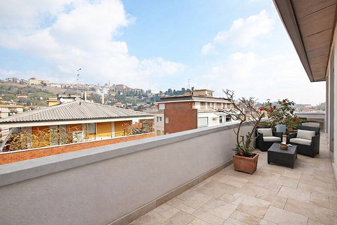 La propriet esposta su 3 lati e gode di una vista della citt, da citt alta, la terrazza lambisce completamente i lati dell'immobile e tutti gli ambienti godono di accesso ad essa. E' stato recentemente deliberato dal condominio il rifacimento completo delle facciate e dei frontalini dei balconi oltre che il rifacimento dei terrazzi all'ultimo piano (compreso il terrazzo dell'immobile oggetto di vendita). ? 750.000,00 Disponibile ampia autorimessa per ? 45.000. Spese condominiali ? 3.800,00 annue comprensive di riscaldamento centralizzato in tele riscaldamento.