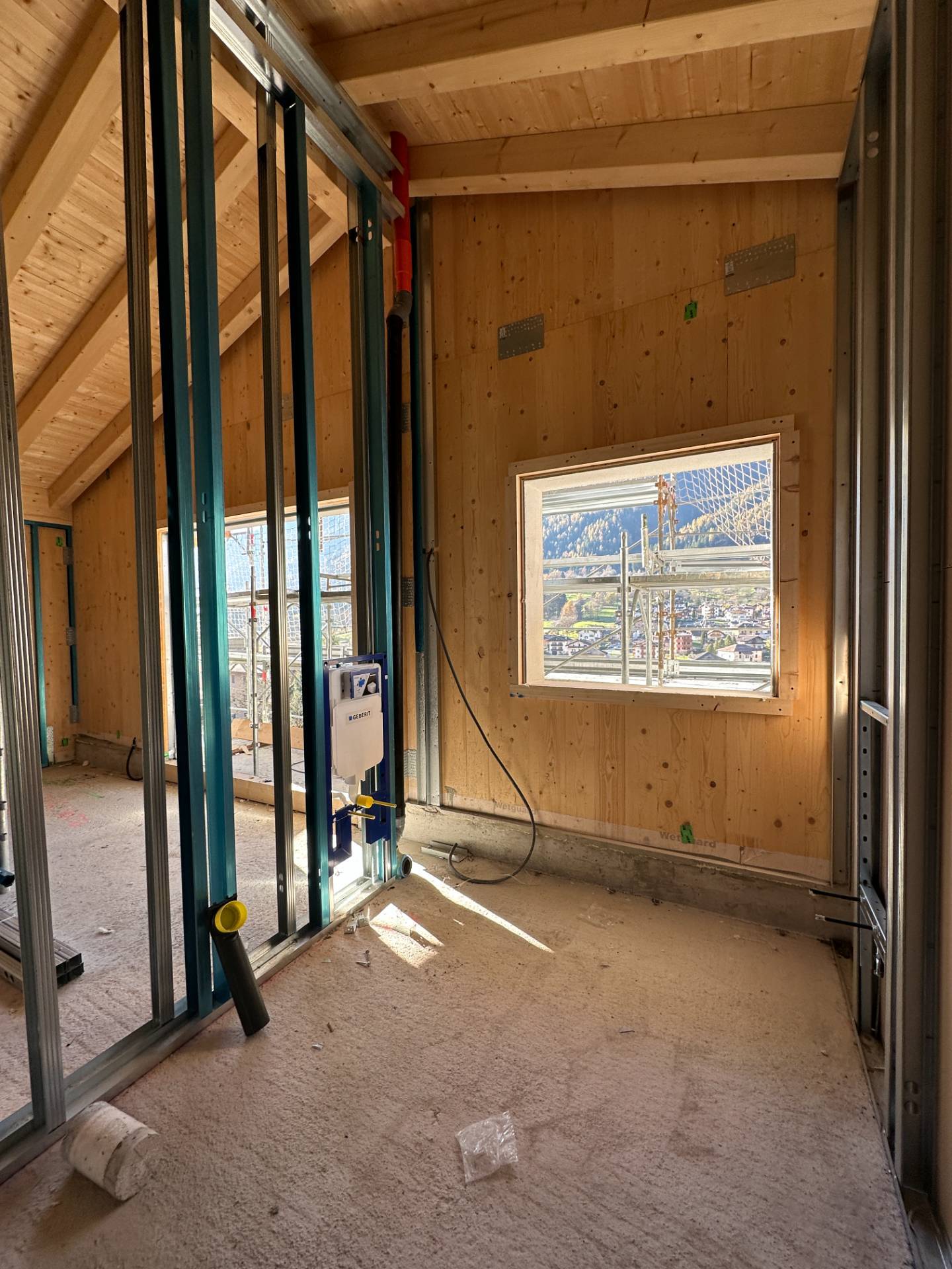 La soluzione E1, qui proposta, un attico con vista panoramica sulla valle, cos composto: ingresso nel living openspace con zona pranzo e angolo cottura, zona relax con accesso all'ampia terrazza esposta a sud, due stanze da letto, una con accesso al balcone esposto ad ovest, un bagno finestrato con doccia.