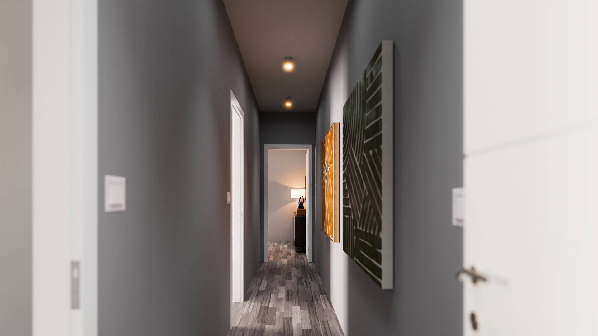 Il disimpegno notte conduce a una prima camera matrimoniale comoda e ben organizzata, con vicino un bagno finestrato.