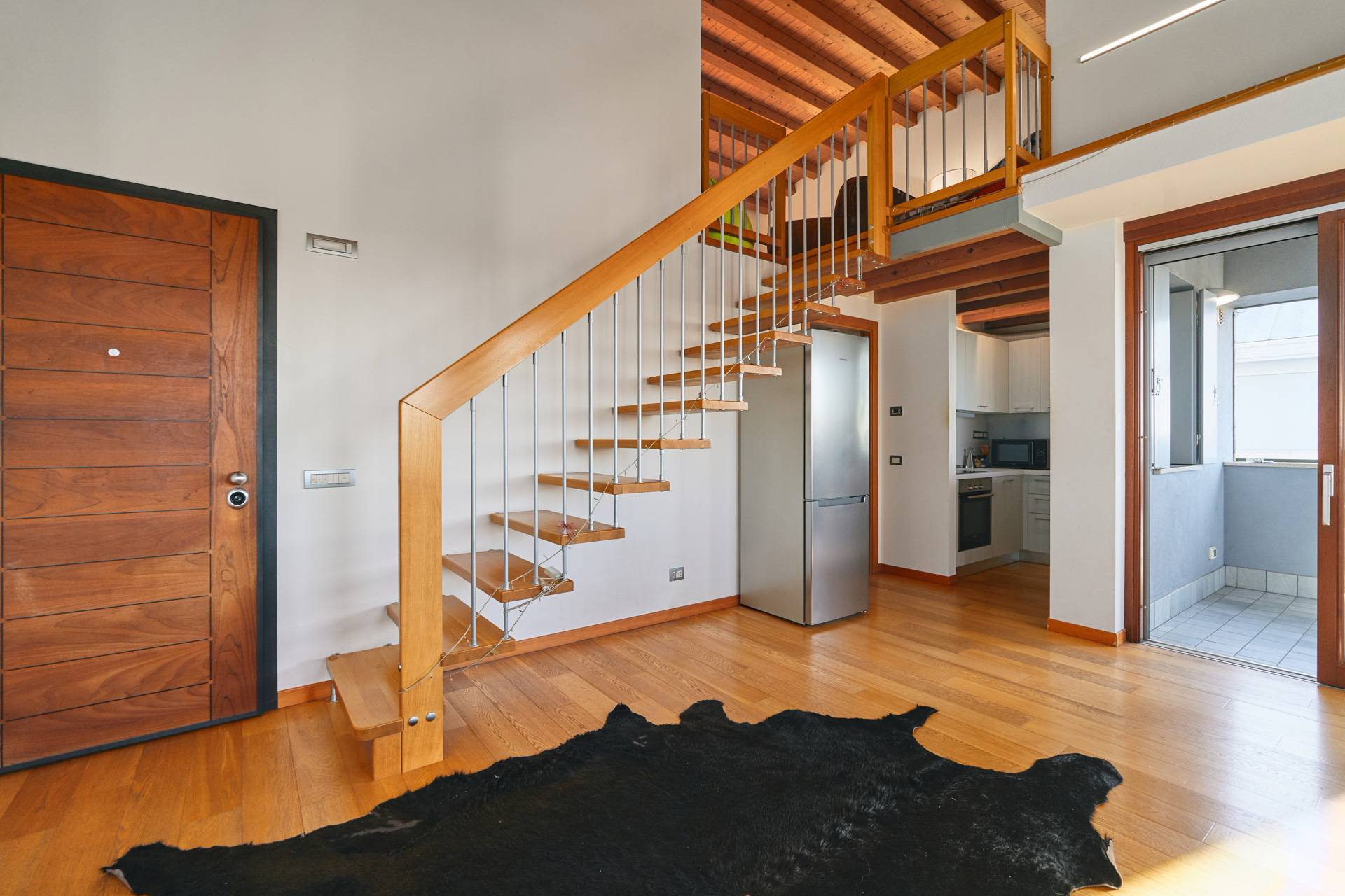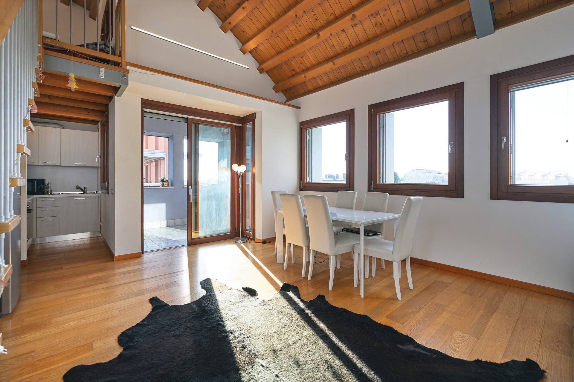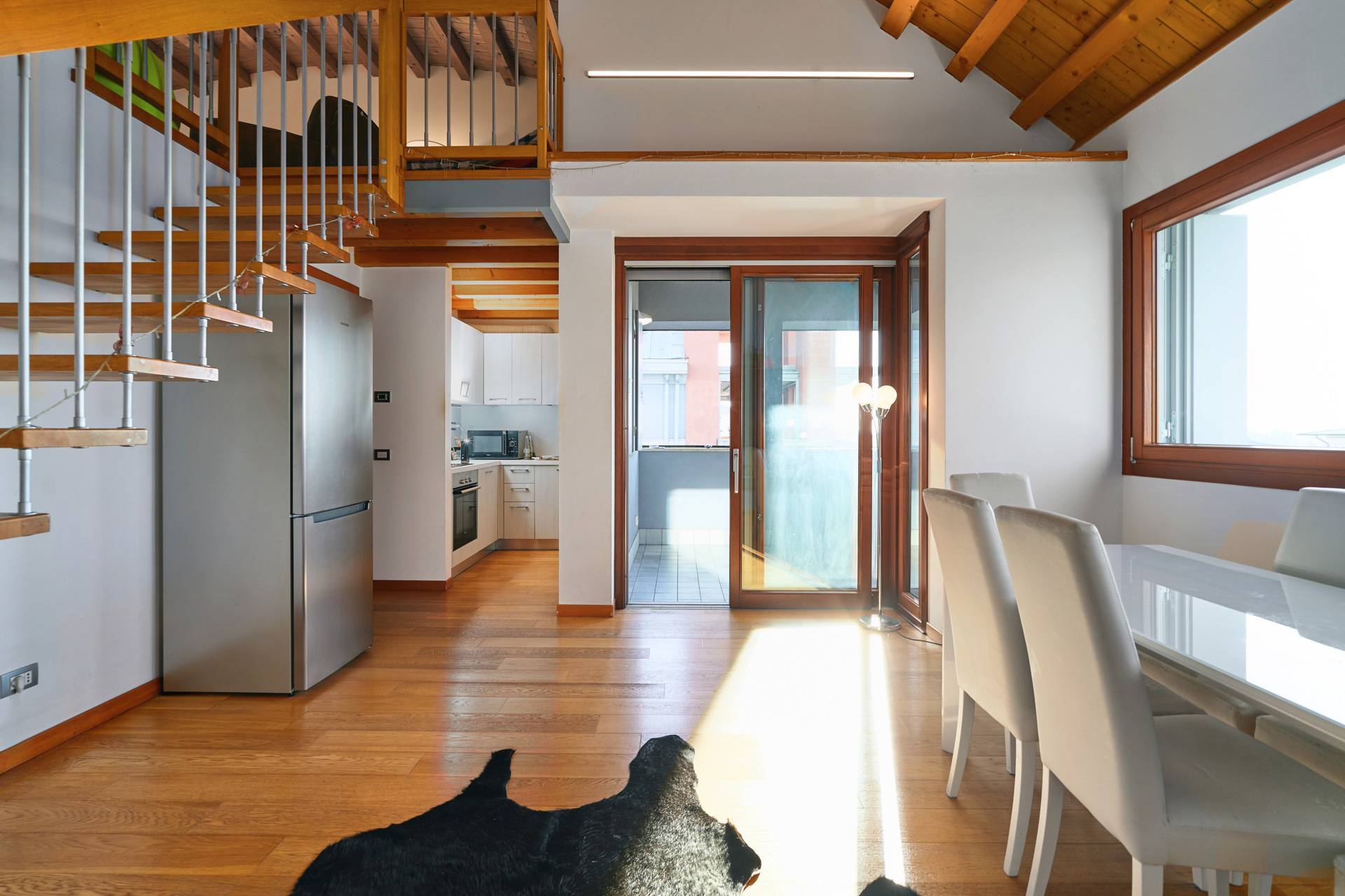 Dal soggiorno si accede, tramite una scala, a un grande soppalco abitabile.