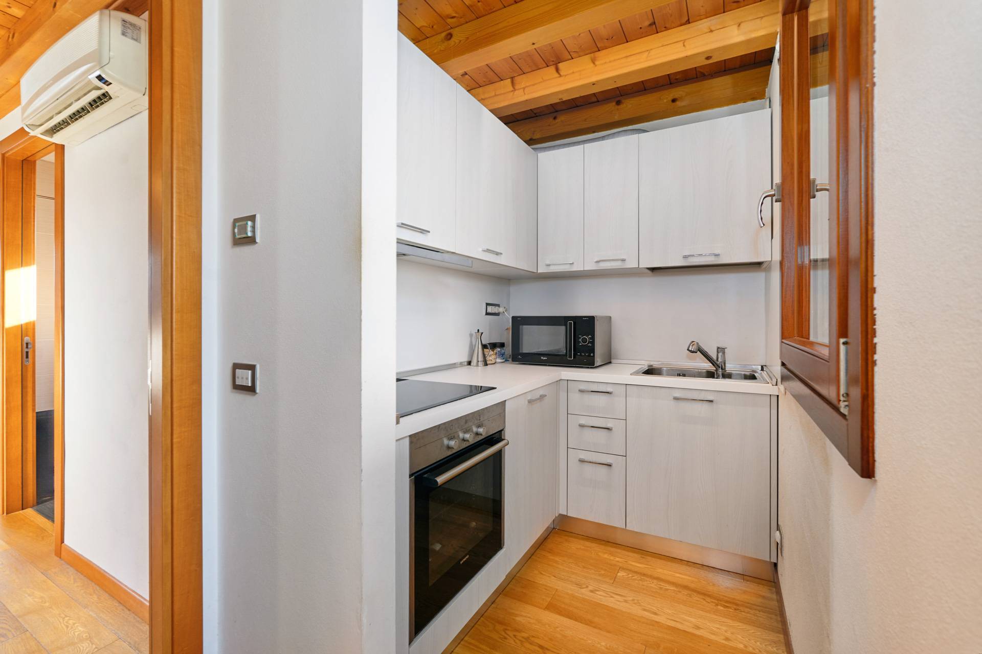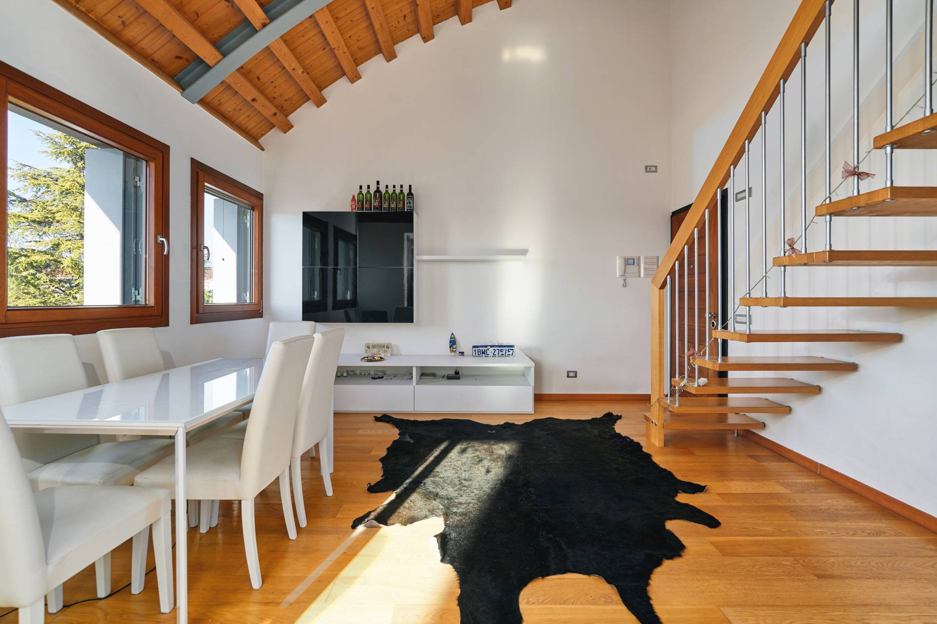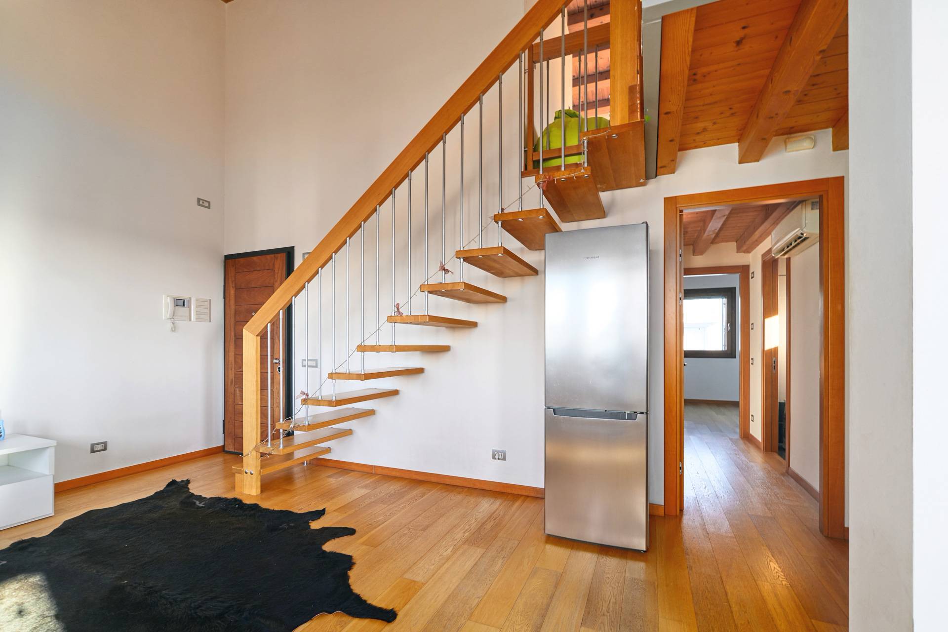 Dal soggiorno si accede, tramite una scala, a un grande soppalco abitabile.