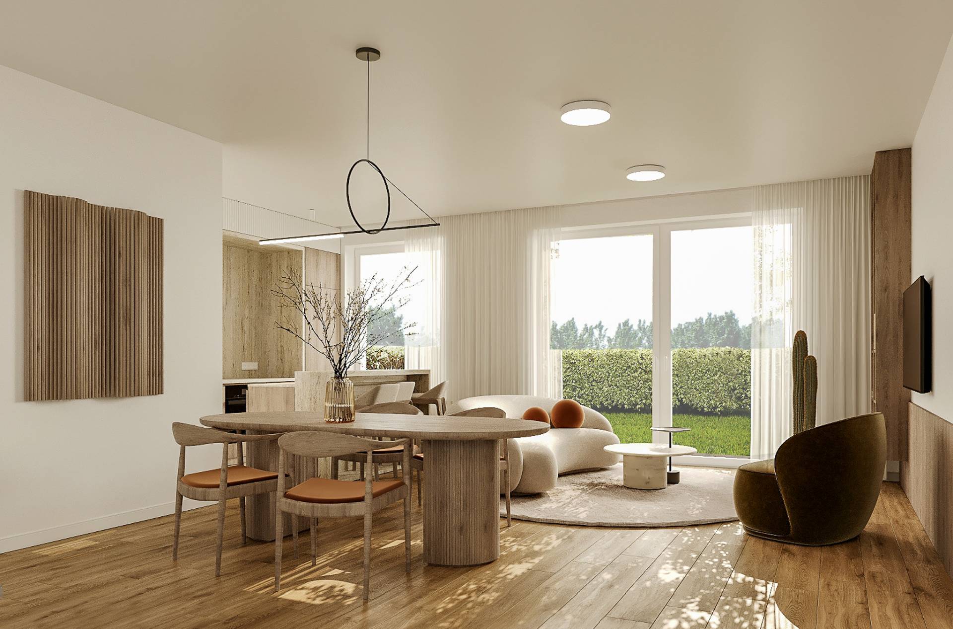 Le ampie vetrate creano un dialogo costante tra linterno delle abitazioni e gli spazi esterni, una piacevole fonte di luce e di colori che cambiano ad ogni ora della giornata.