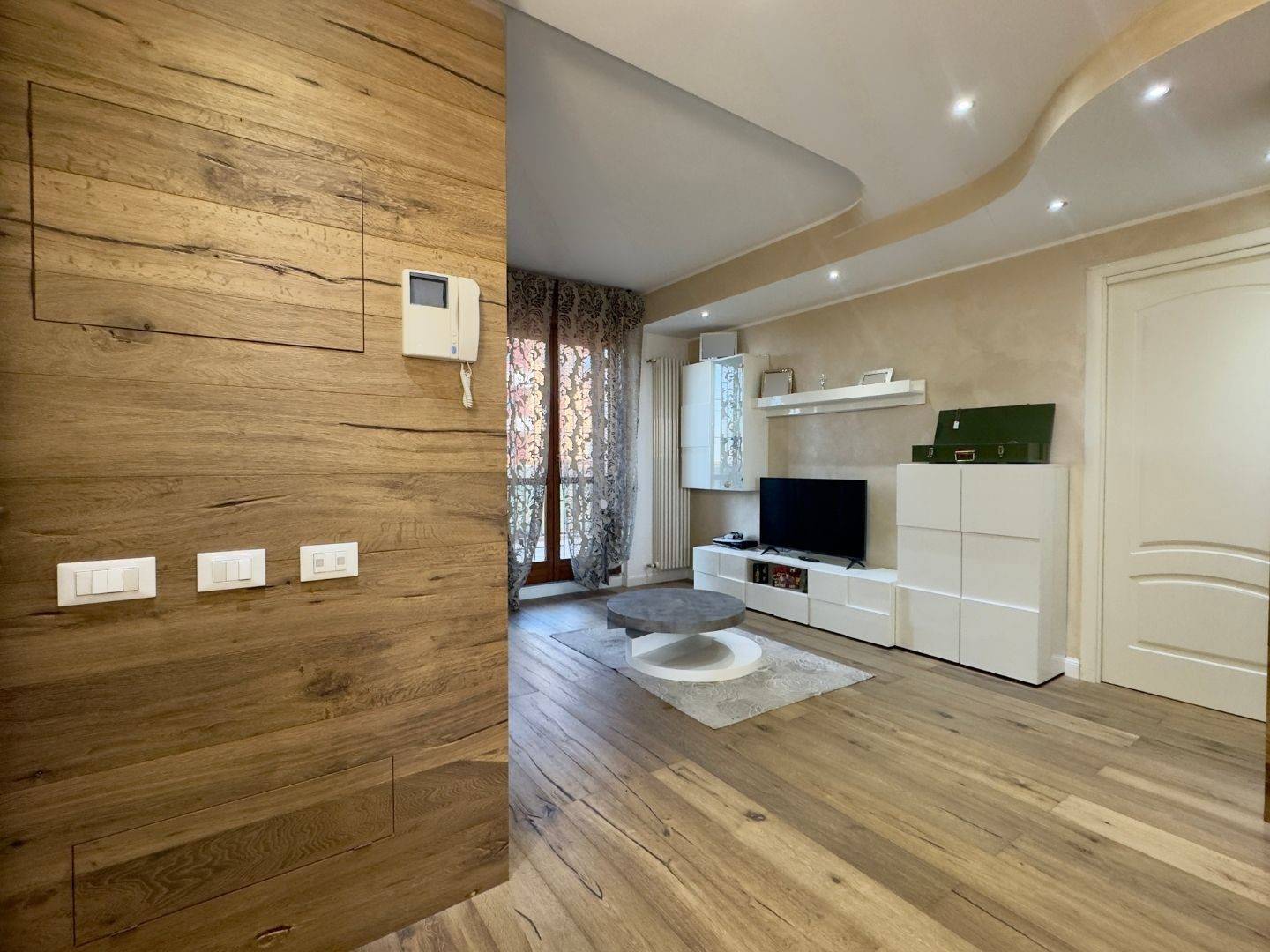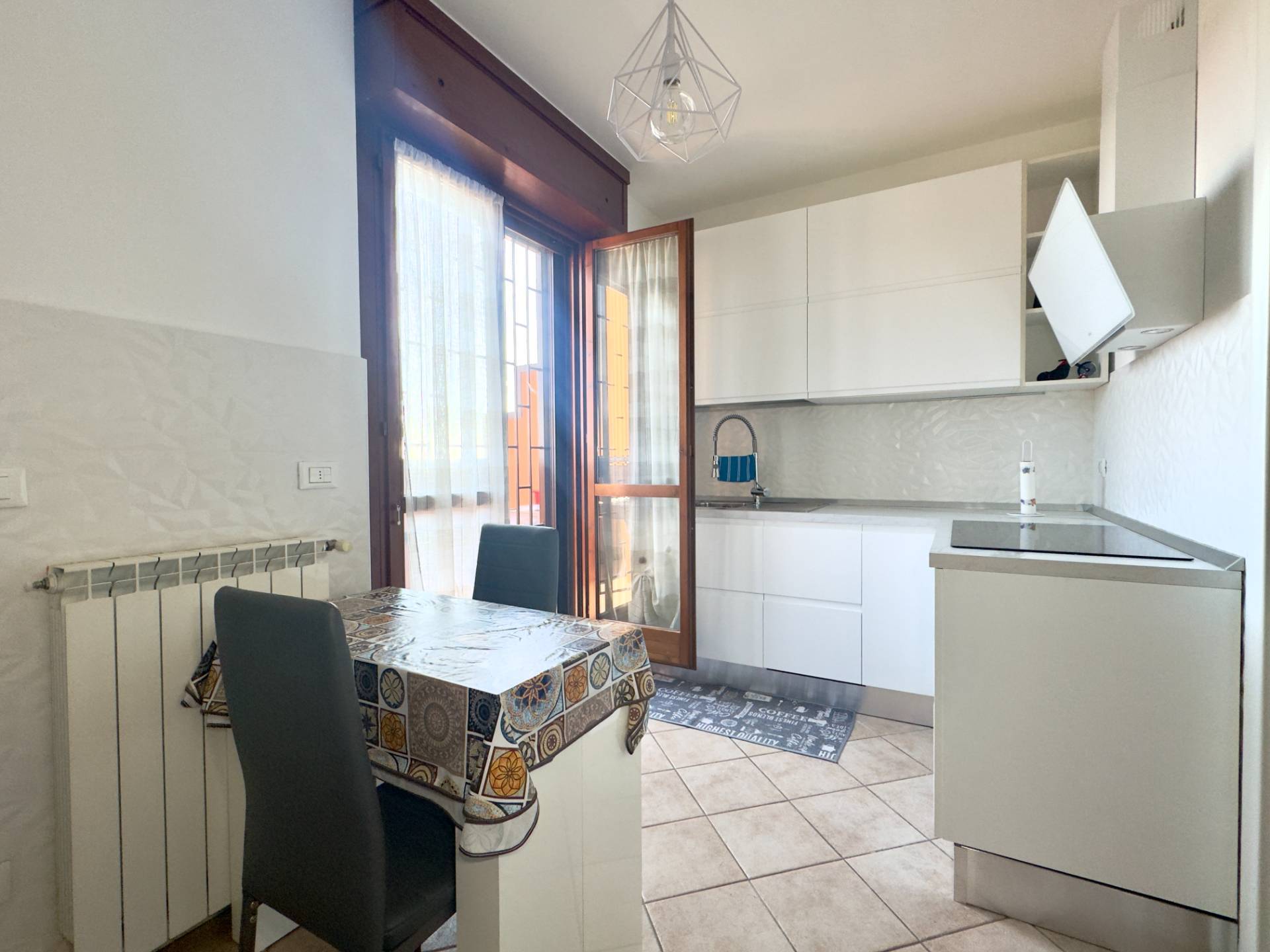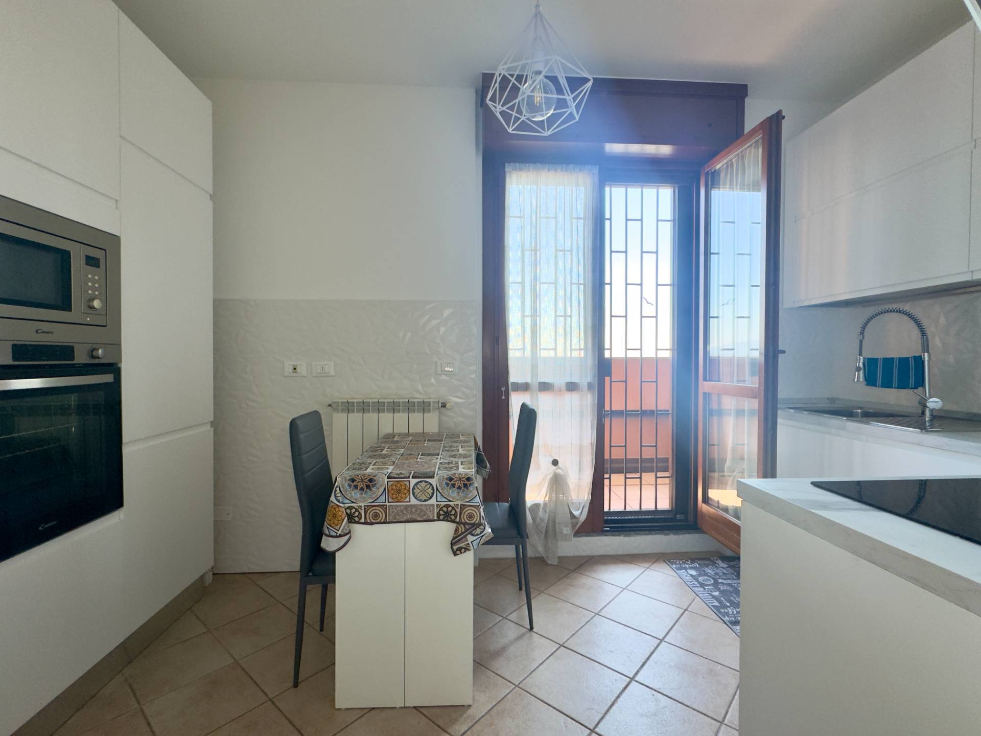 Lingresso conduce al luminoso soggiorno con porta finestra sul terrazzo, affiancato dalla cucina abitabile, anchessa collegata alla balconata.