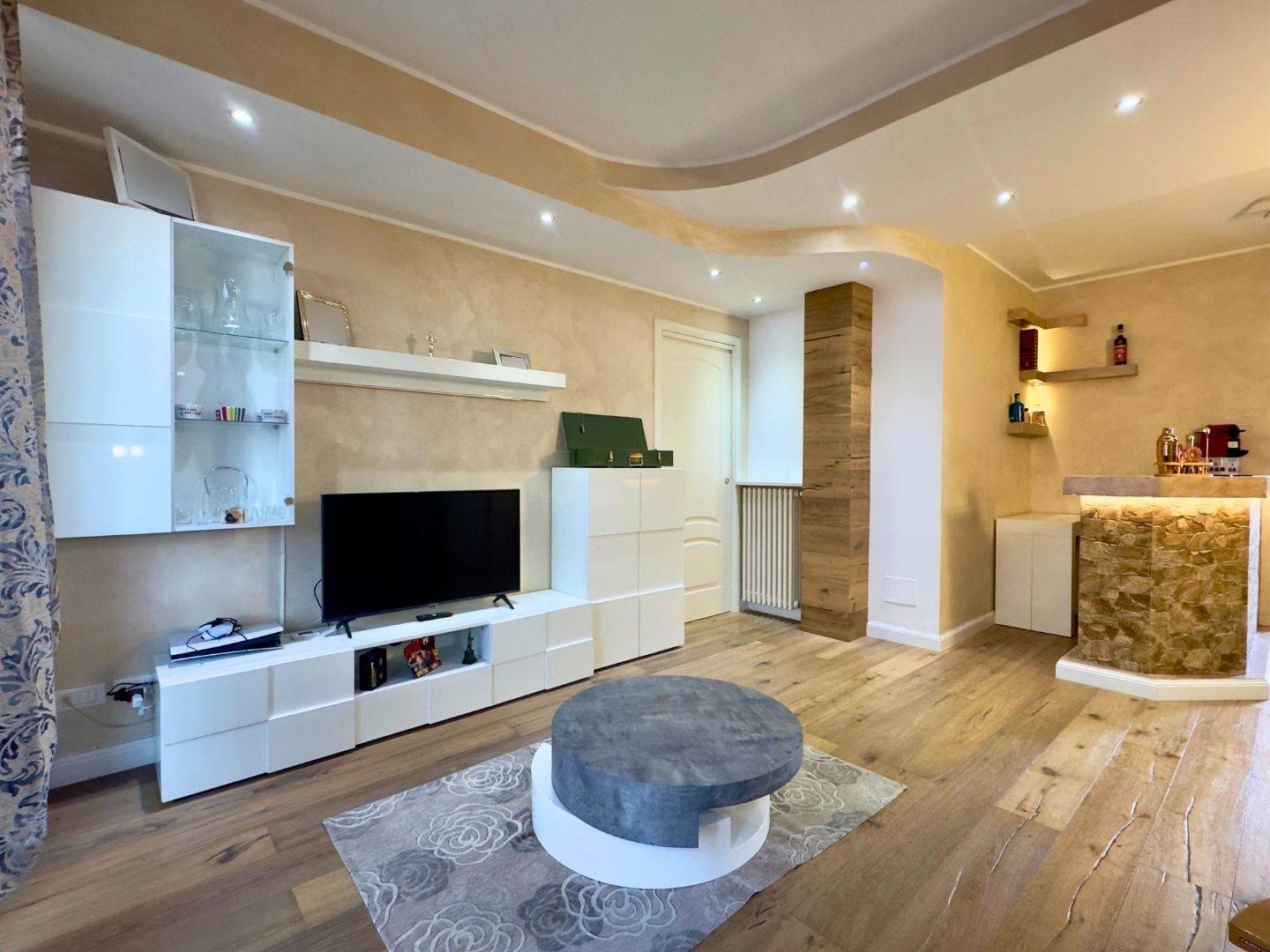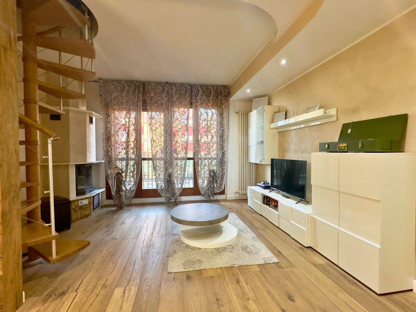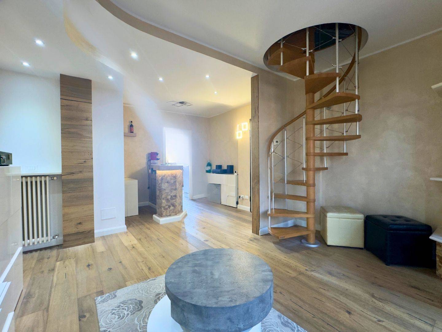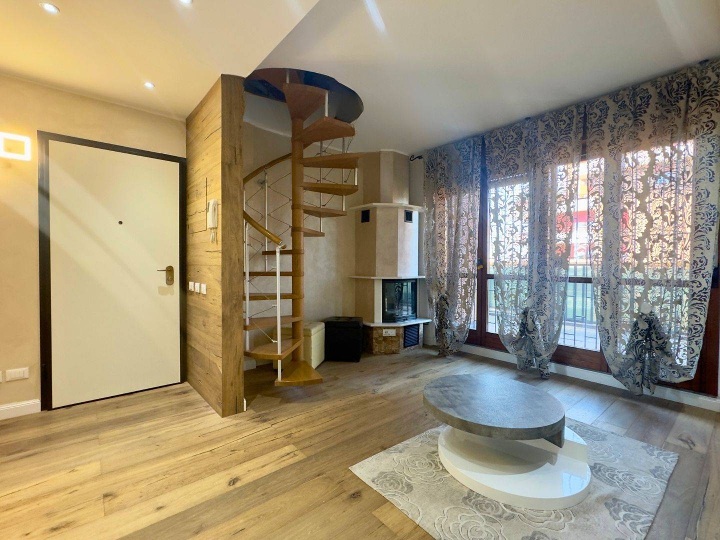 Lingresso conduce al luminoso soggiorno con porta finestra sul terrazzo, affiancato dalla cucina abitabile, anchessa collegata alla balconata.