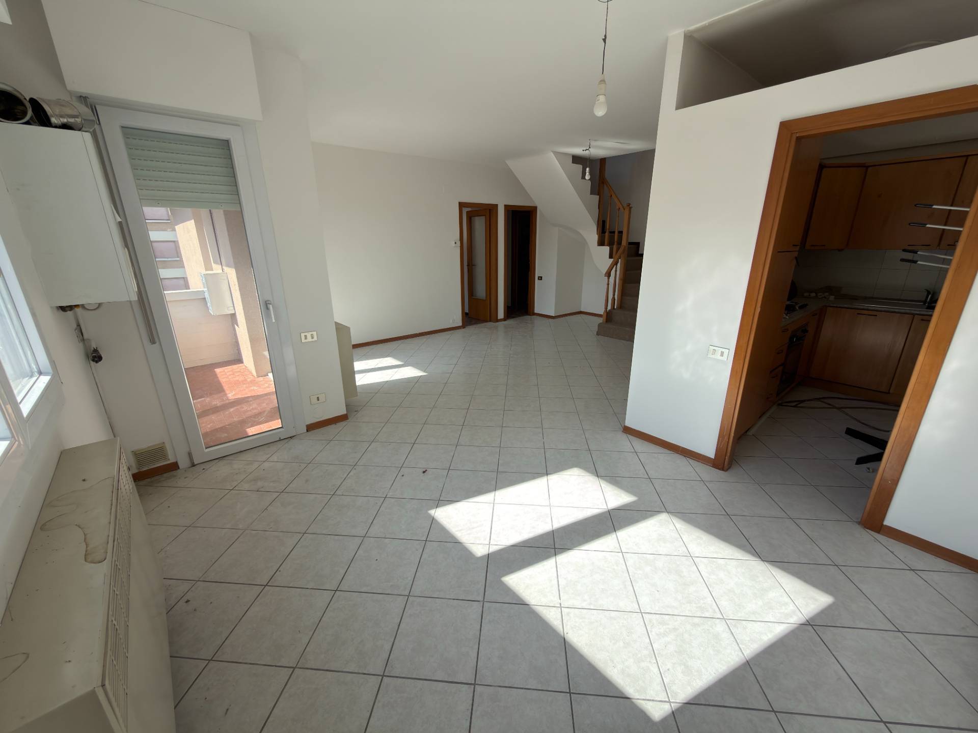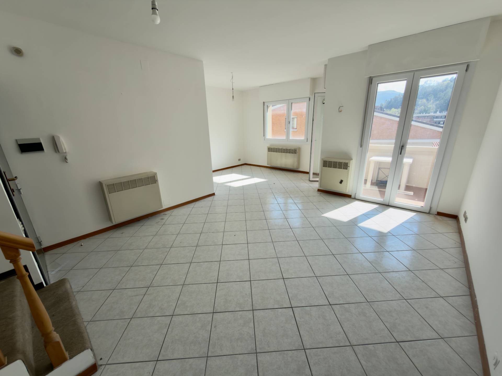 Lingresso si apre su un ampio open space, luminoso e accogliente, caratterizzato da una grande finestra e da un terrazzo con doppia uscita, perfetto per vivere appieno gli spazi esterni.