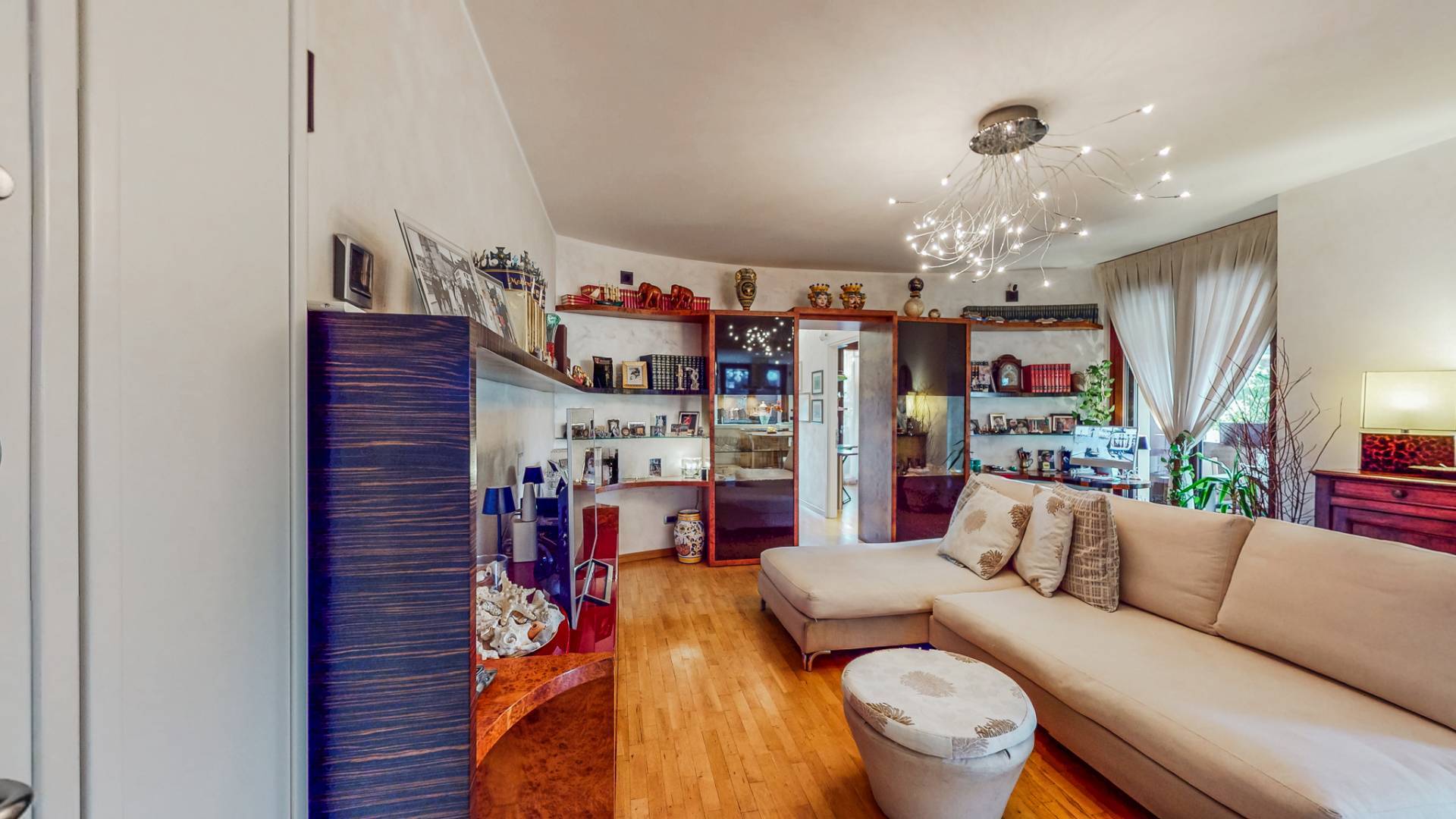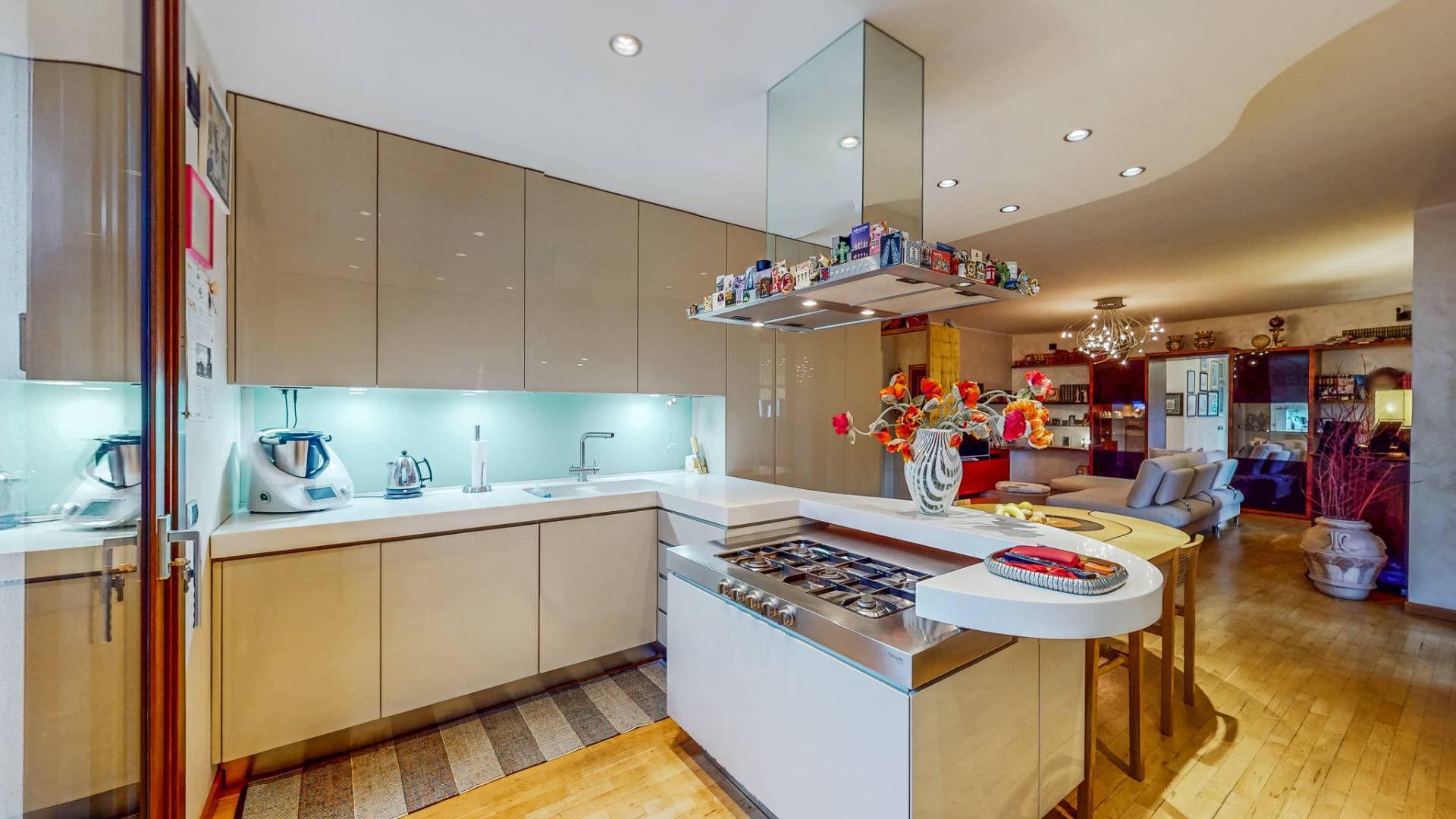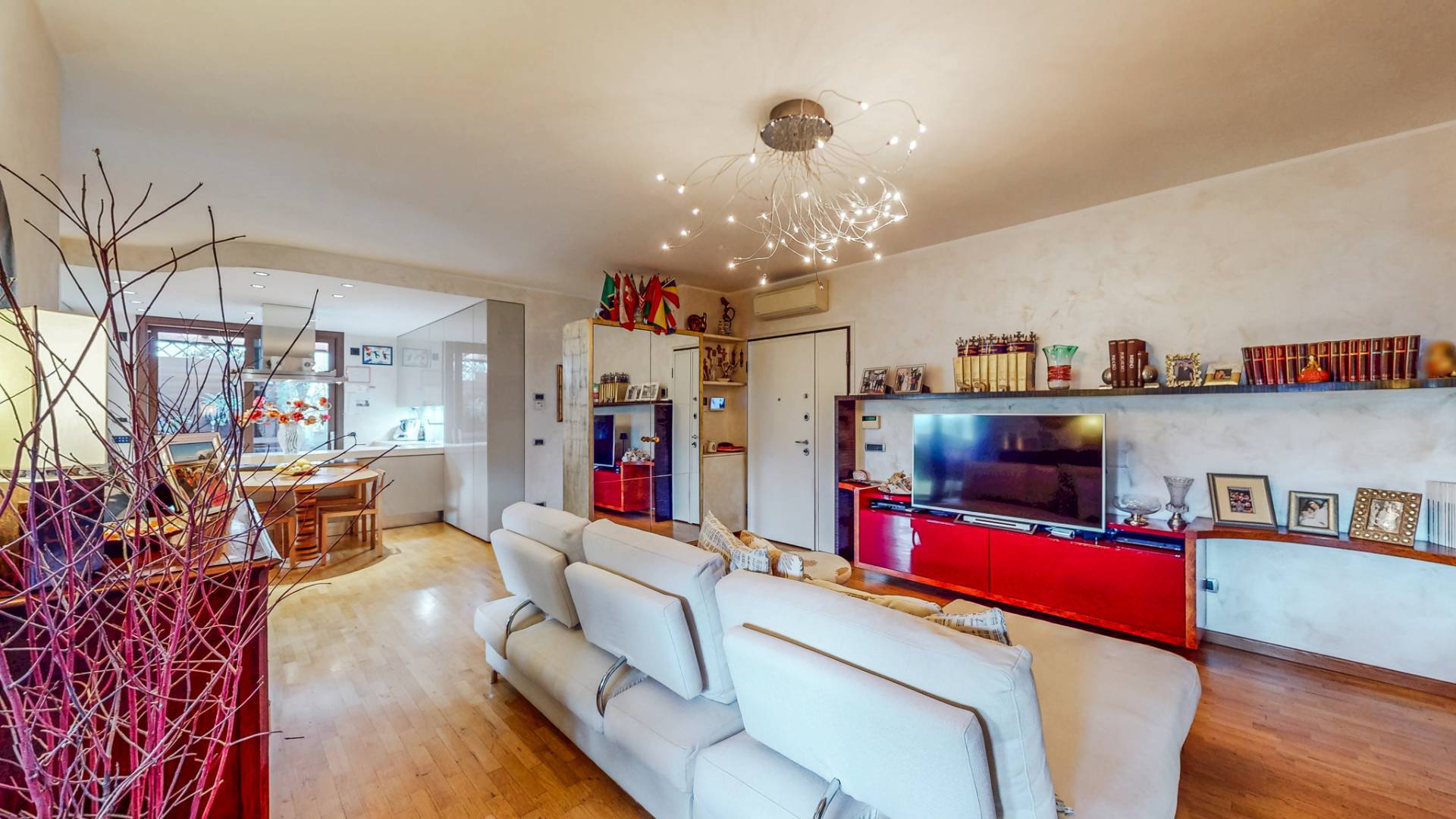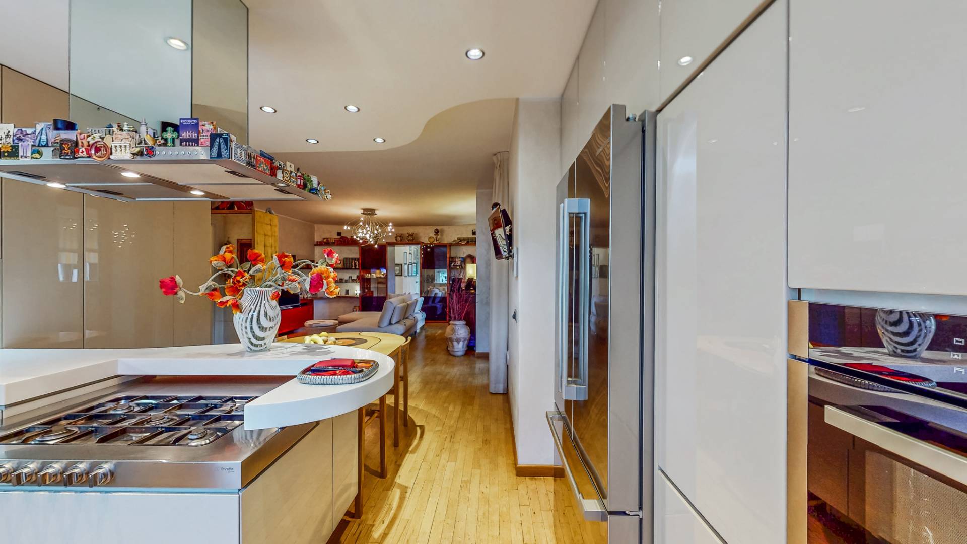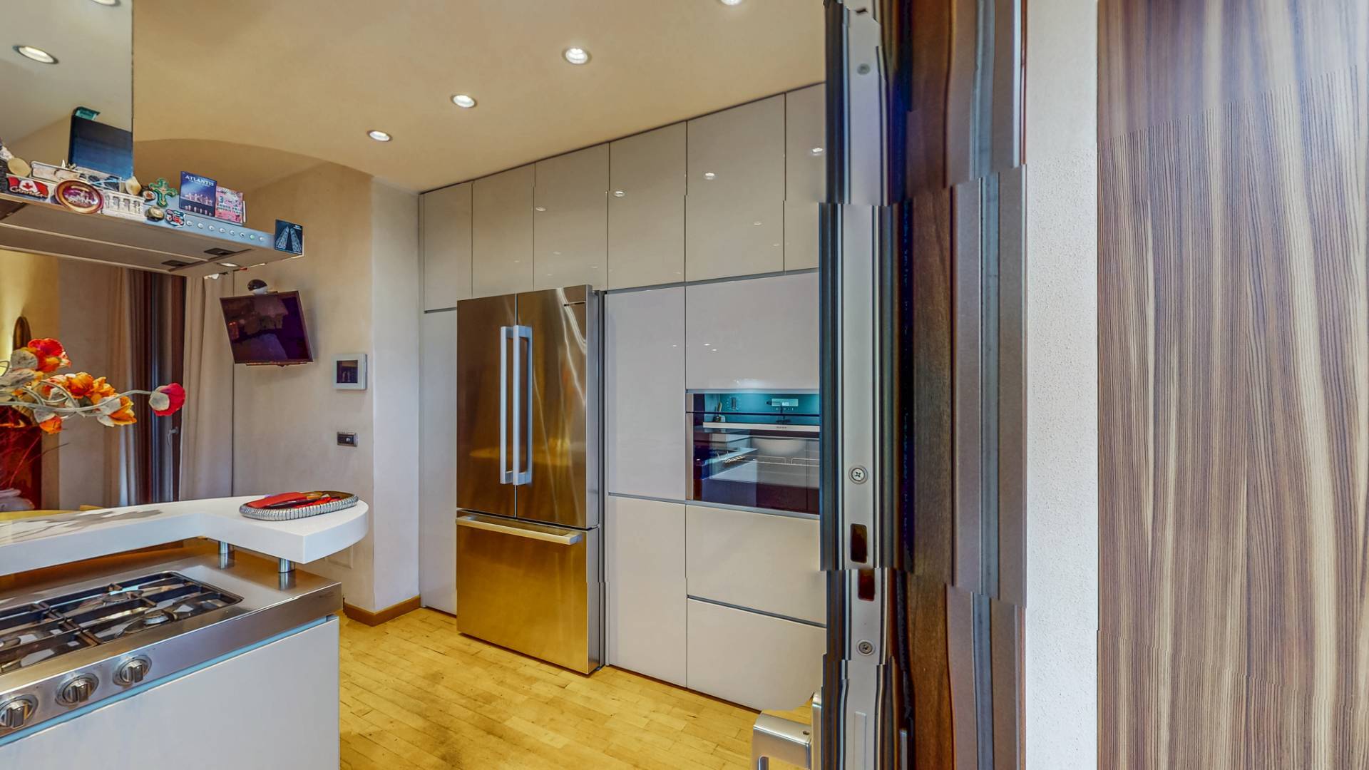 Lascensore con uscita diretta sul pianerottolo conduce allingresso dellabitazione, che si apre su una ampia e luminosa sala con angolo cottura, perfetta per vivere e ricevere in un ambiente moderno e accogliente.