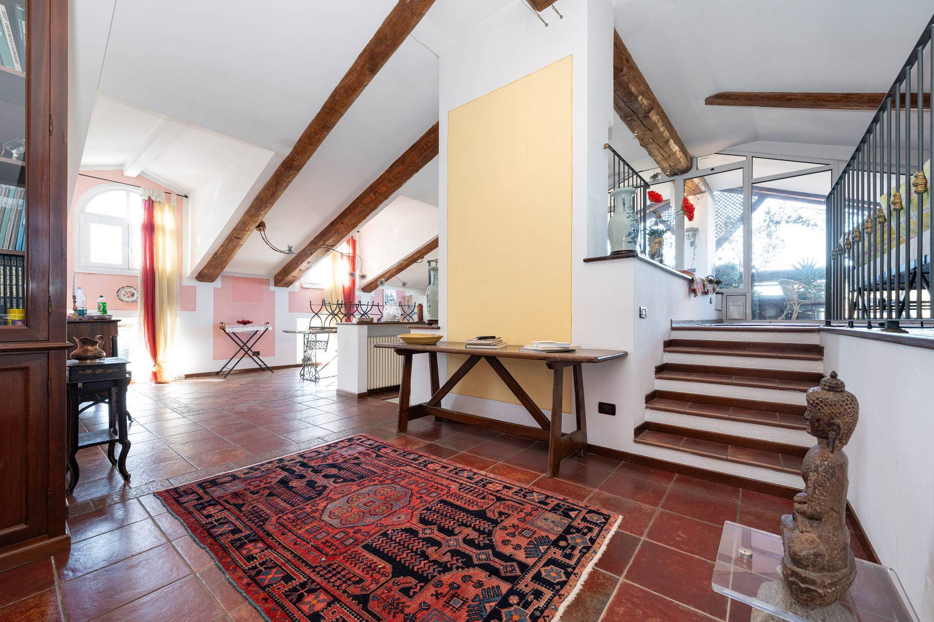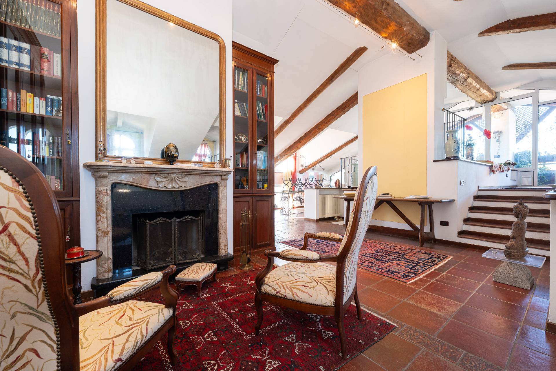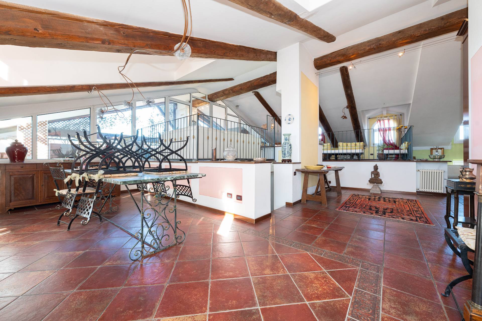 Unelegante scala conduce al piano attico, dove si apre una zona giorno di rappresentanza con salone doppio, sala da pranzo, area relax con camino depoca funzionante, cucina su misura e terrazzo coperto panoramico con splendida vista sulle montagne.