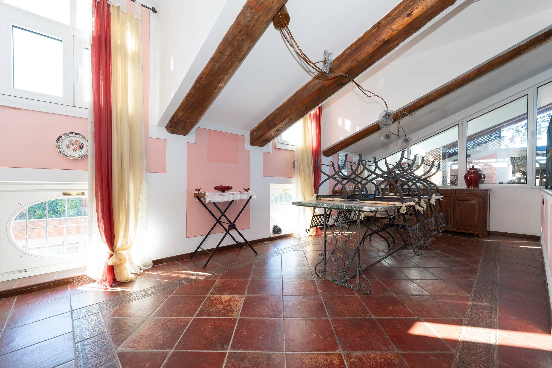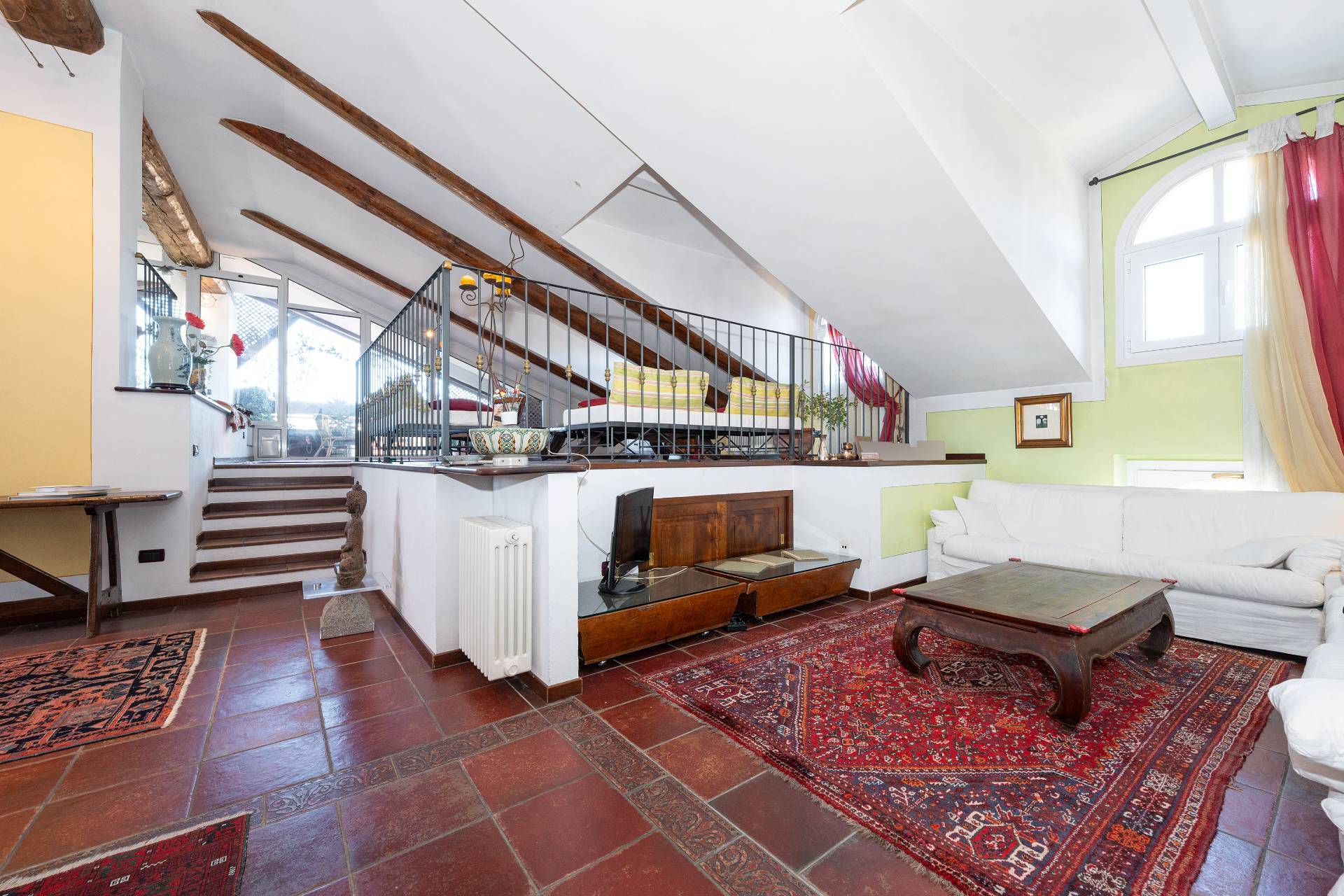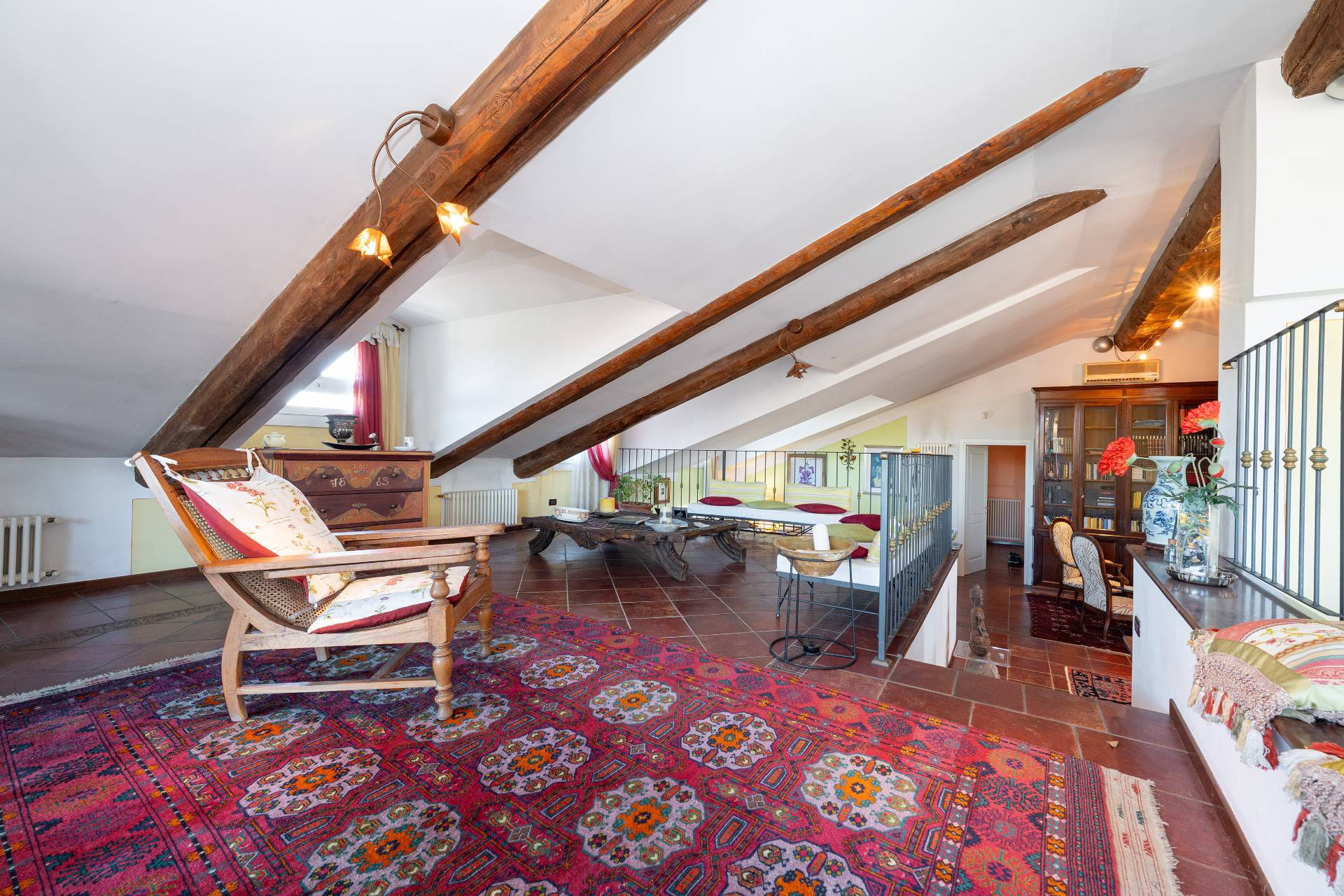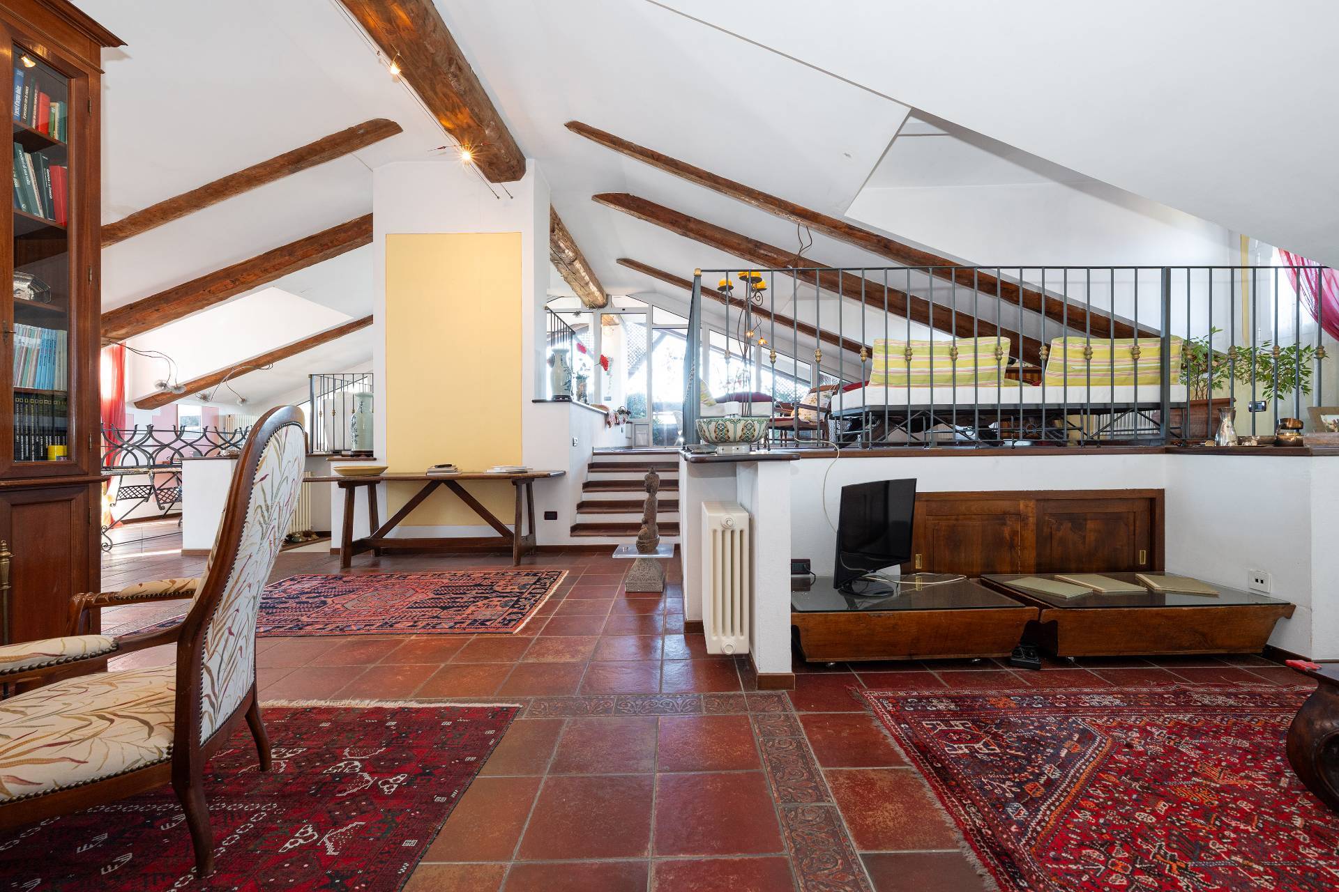 Unelegante scala conduce al piano attico, dove si apre una zona giorno di rappresentanza con salone doppio, sala da pranzo, area relax con camino depoca funzionante, cucina su misura e terrazzo coperto panoramico con splendida vista sulle montagne.