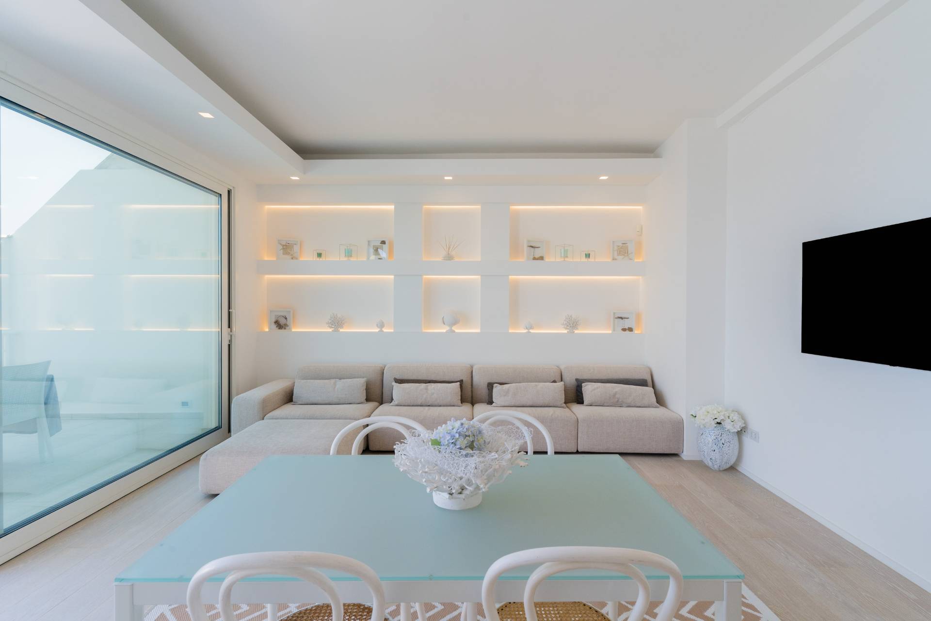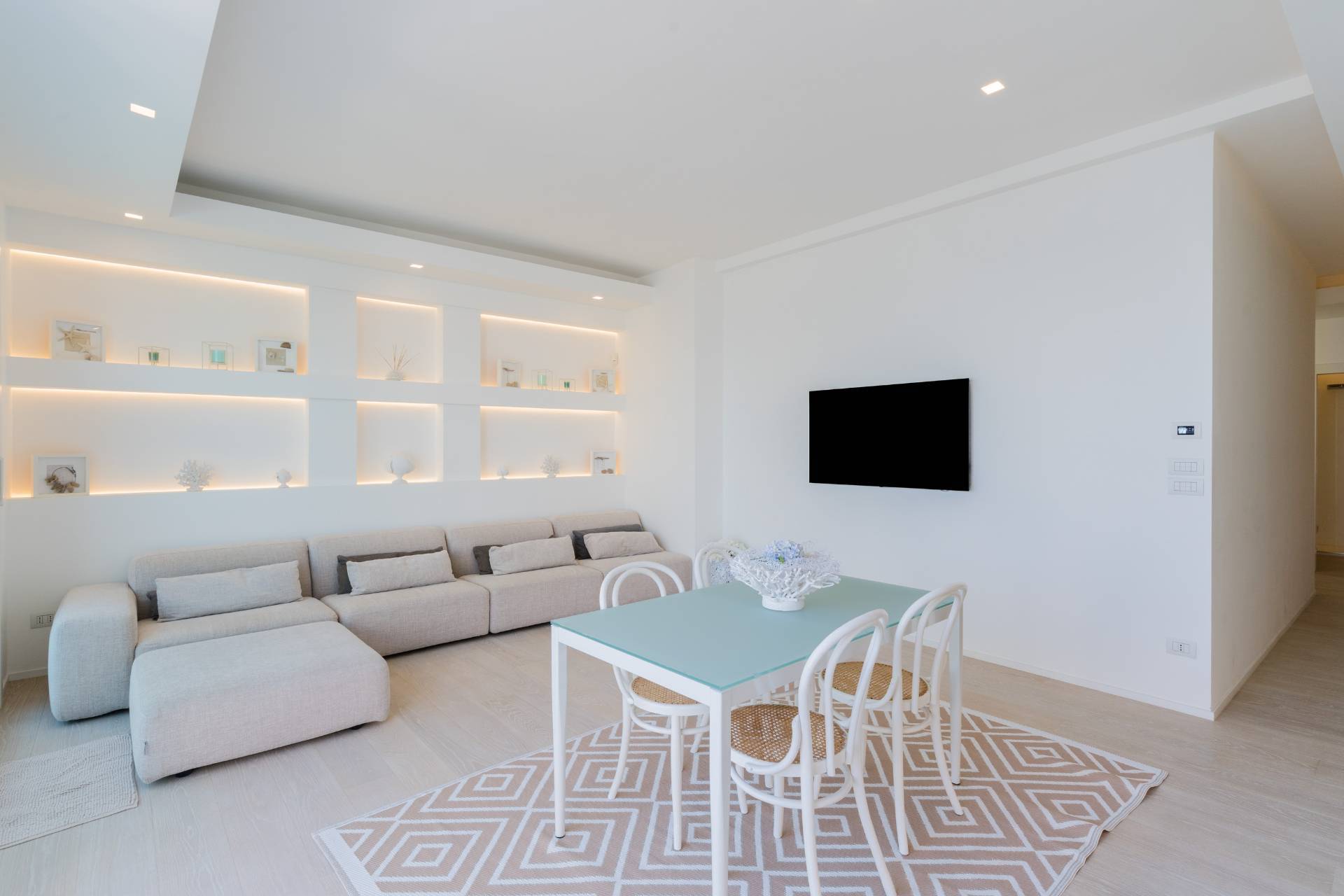 Lattico si compone di luminoso soggiorno con cucina open space e accesso diretto al terrazzino, camera da letto con bagno en suite e secondo terrazzino con affaccio sulla villa comunale, scameretta e secondo bagno.
