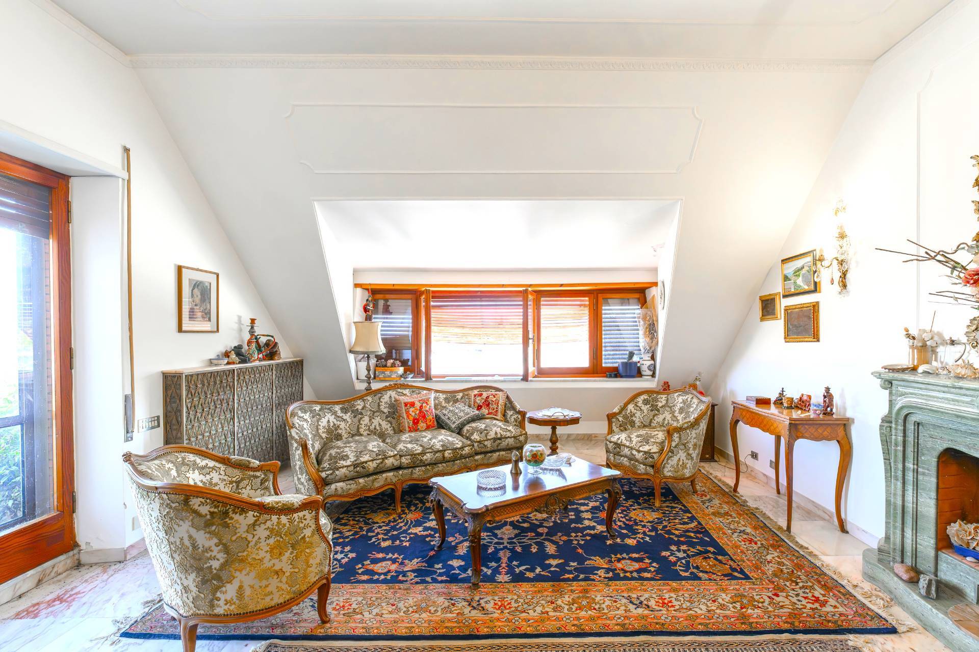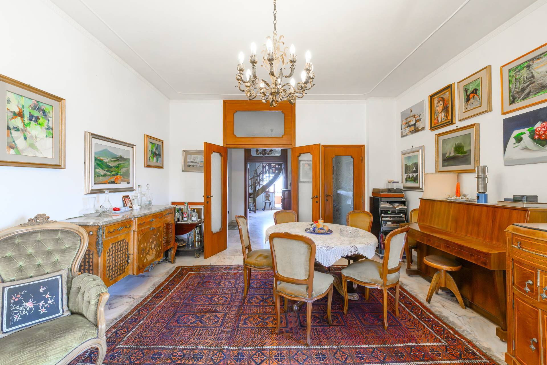 Ingresso di rappresentanza, salone doppio con camino, cucina abitabile, comodo disimpegno con armadio a muro, tre camere da letto matrimoniali, ampio studio e locale lavanderia.