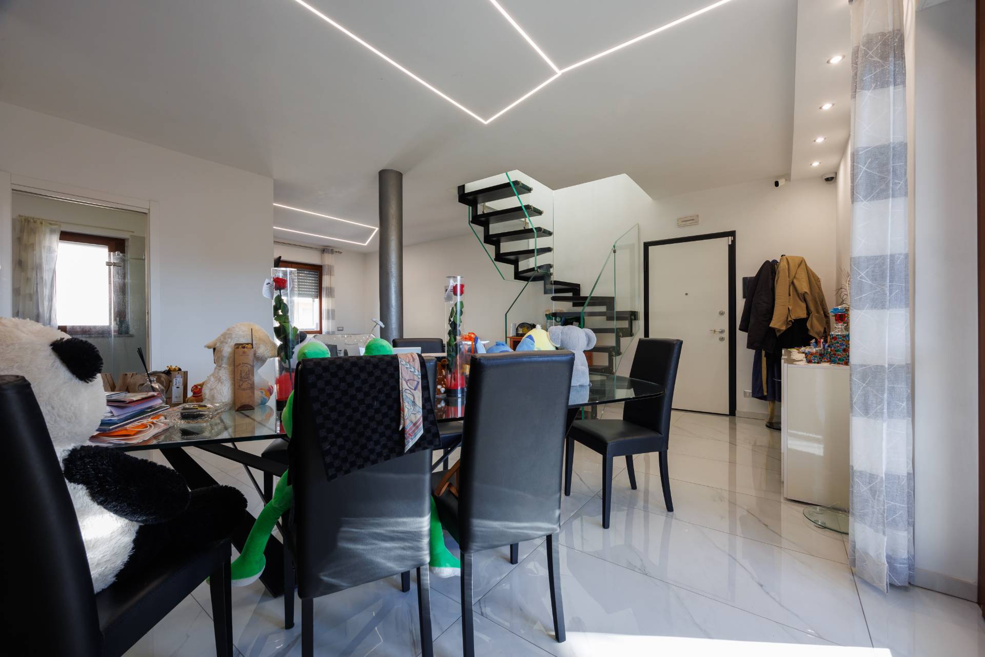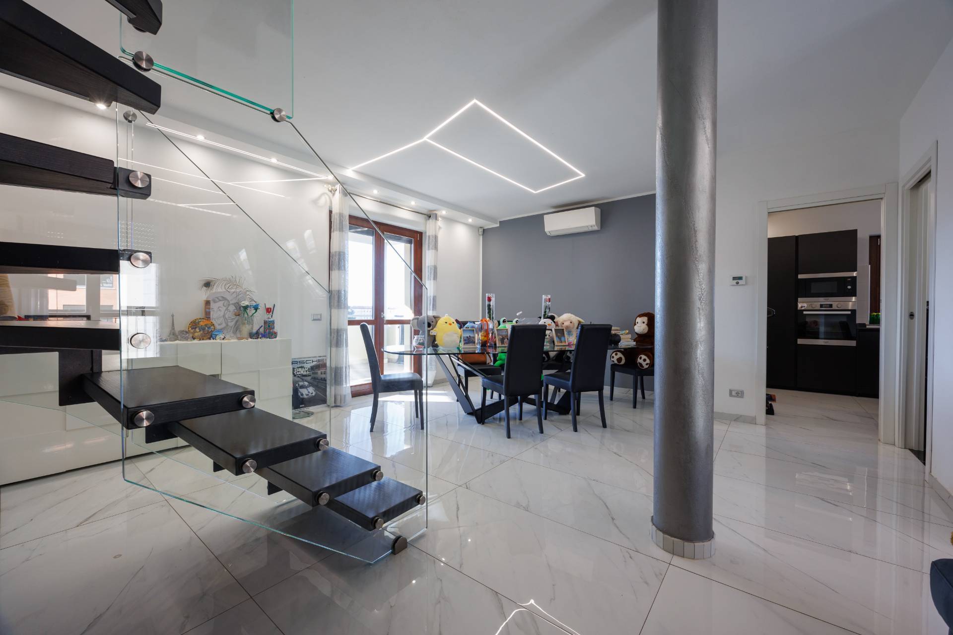 Una raffinata scala in vetro con illuminazione a LED accompagna al piano superiore, dove si sviluppa la zona notte con camera matrimoniale, seconda camera e bagno con box doccia.