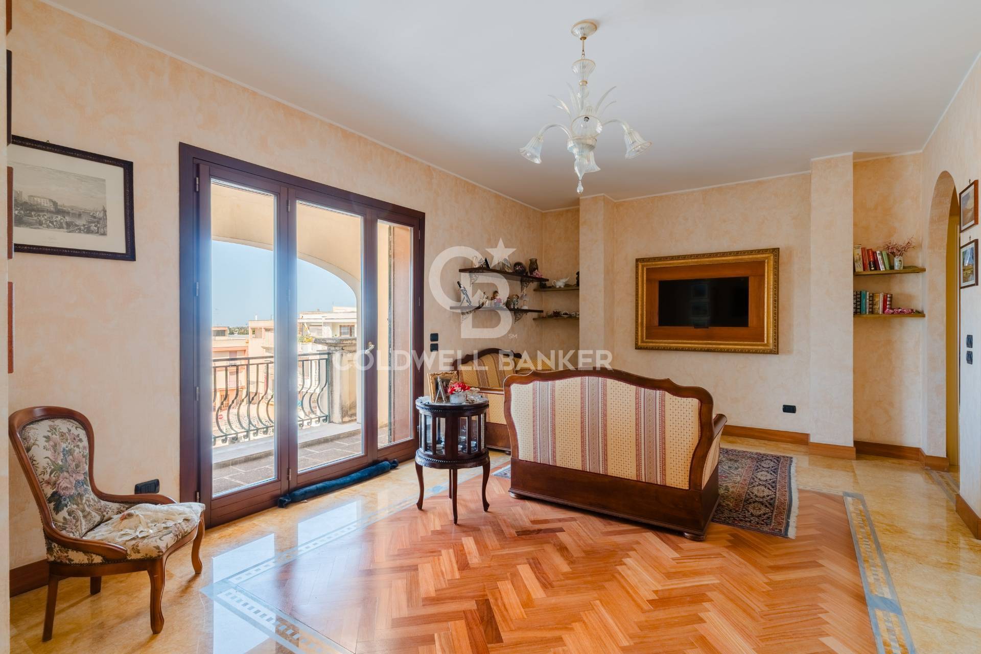 Caratteristiche principali: Ingresso su ampia zona living luminosa, con pavimenti in parquet e inserti in marmo di pregio (cornice Siena e marmo azzurro brasiliano a contrasto), elegante e accogliente.