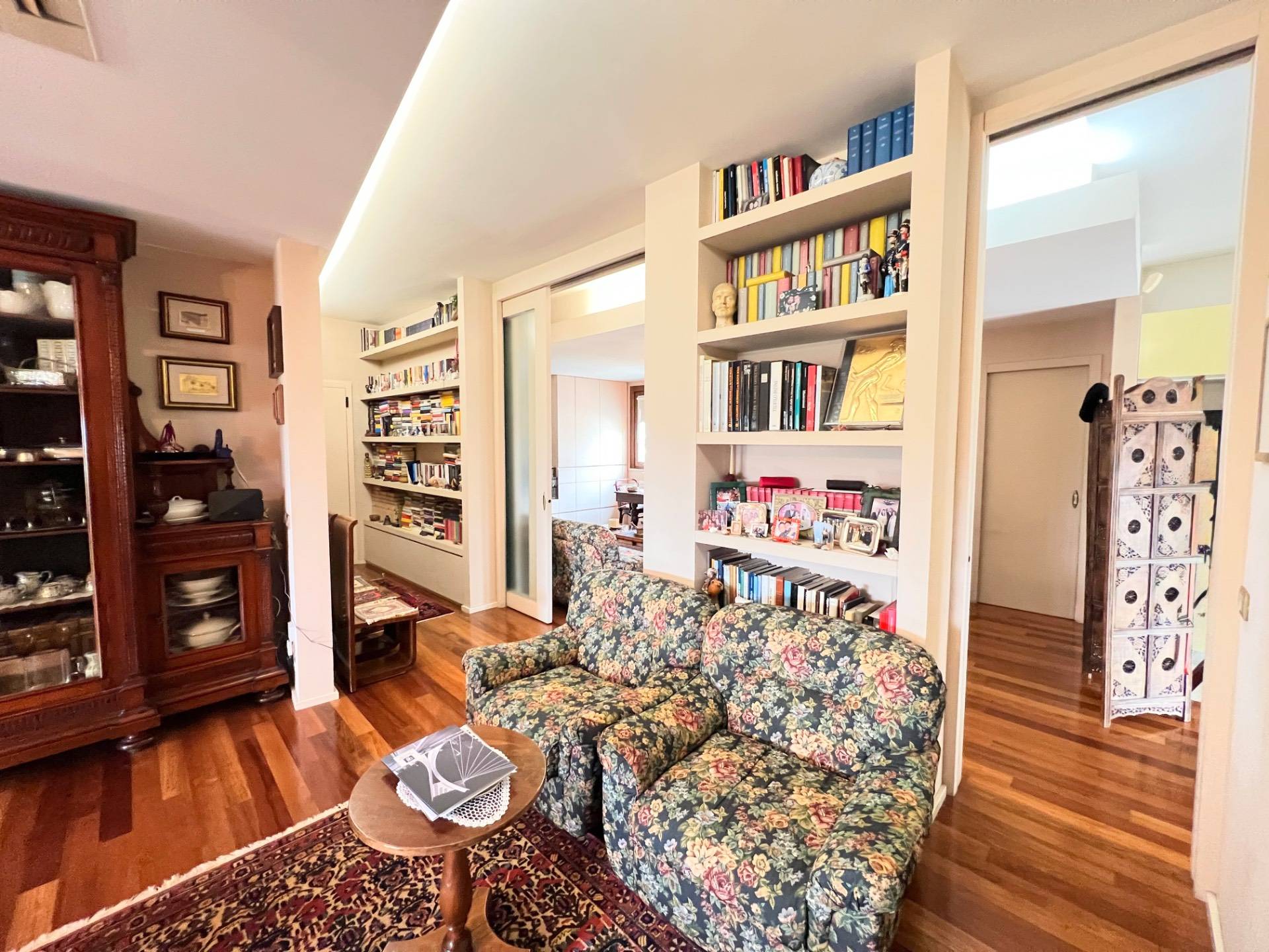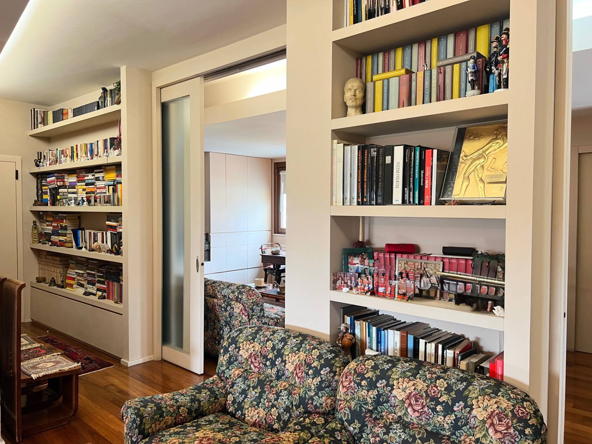 Il tutto servito da armadiature e librerie a muro perfettamente mimetizzate che massimizzano gli spazi senza appesantirli, al pari della pratica lavanderia nella parte retrostante la cucina.