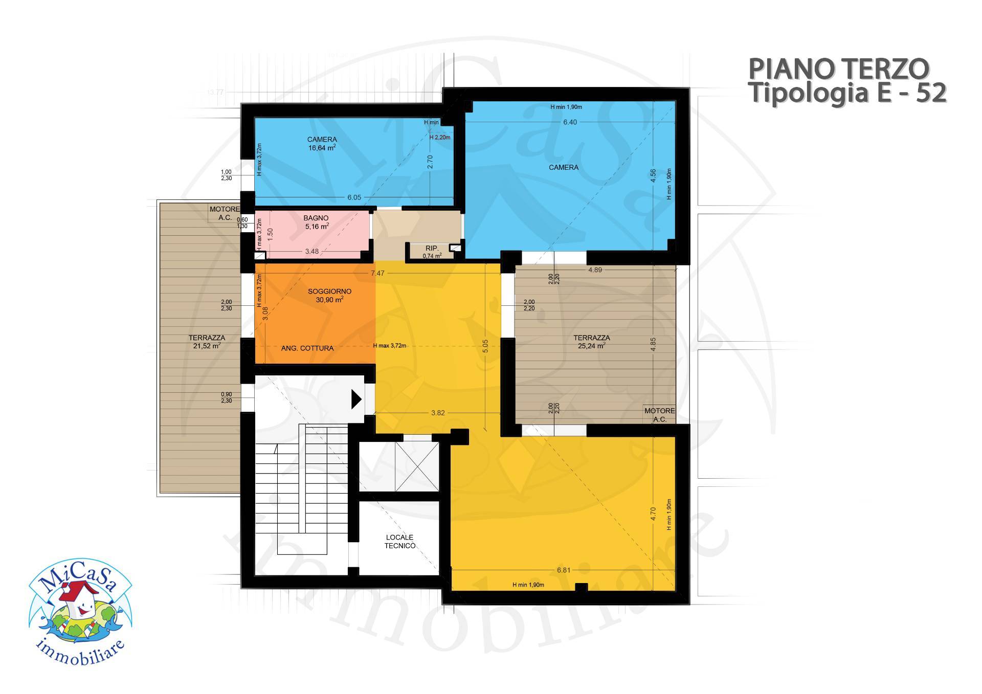 Lattico composto da un ampio e luminoso soggiorno con angolo cottura, disimpegno, ripostiglio, tre camere da letto e doppi servizi.