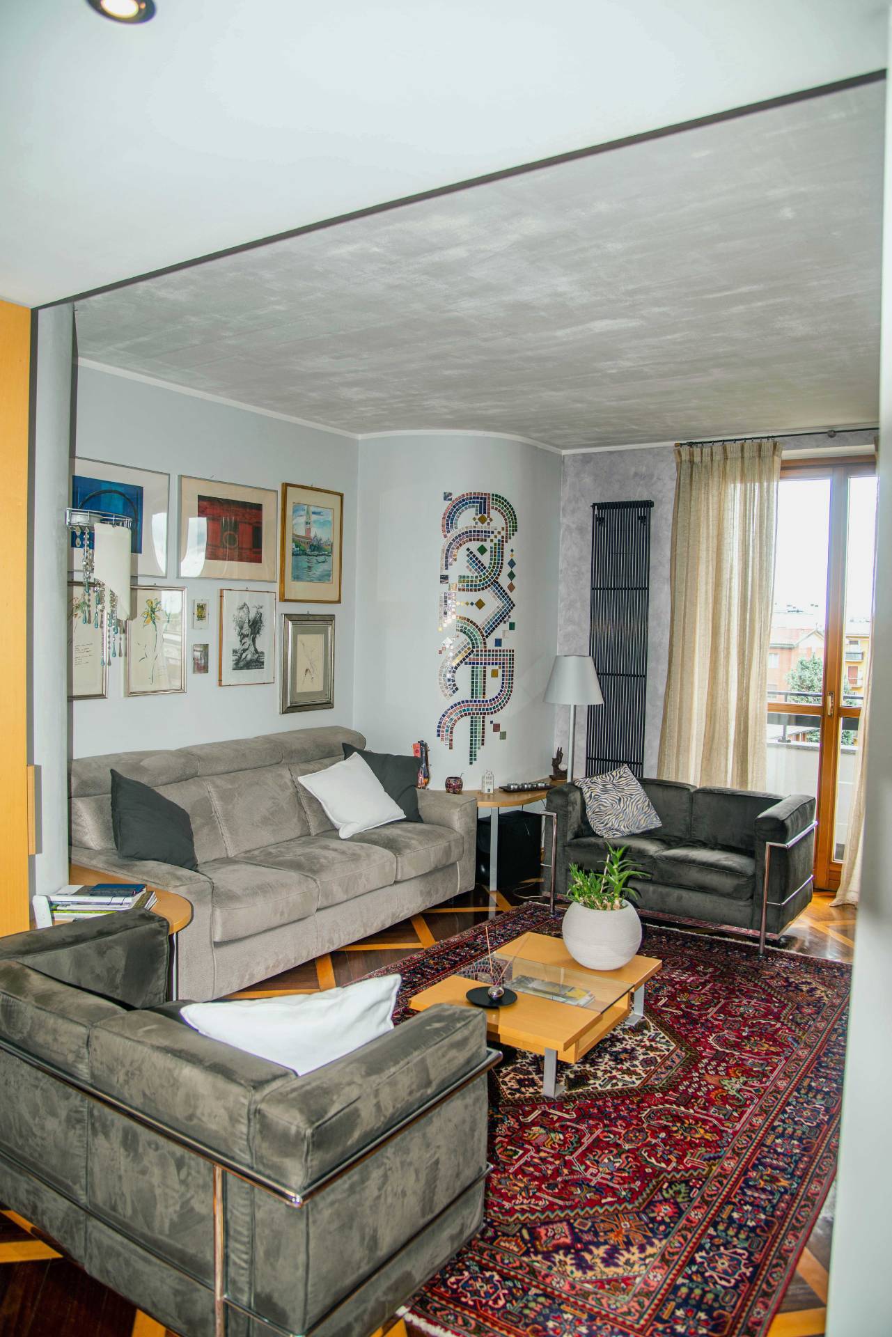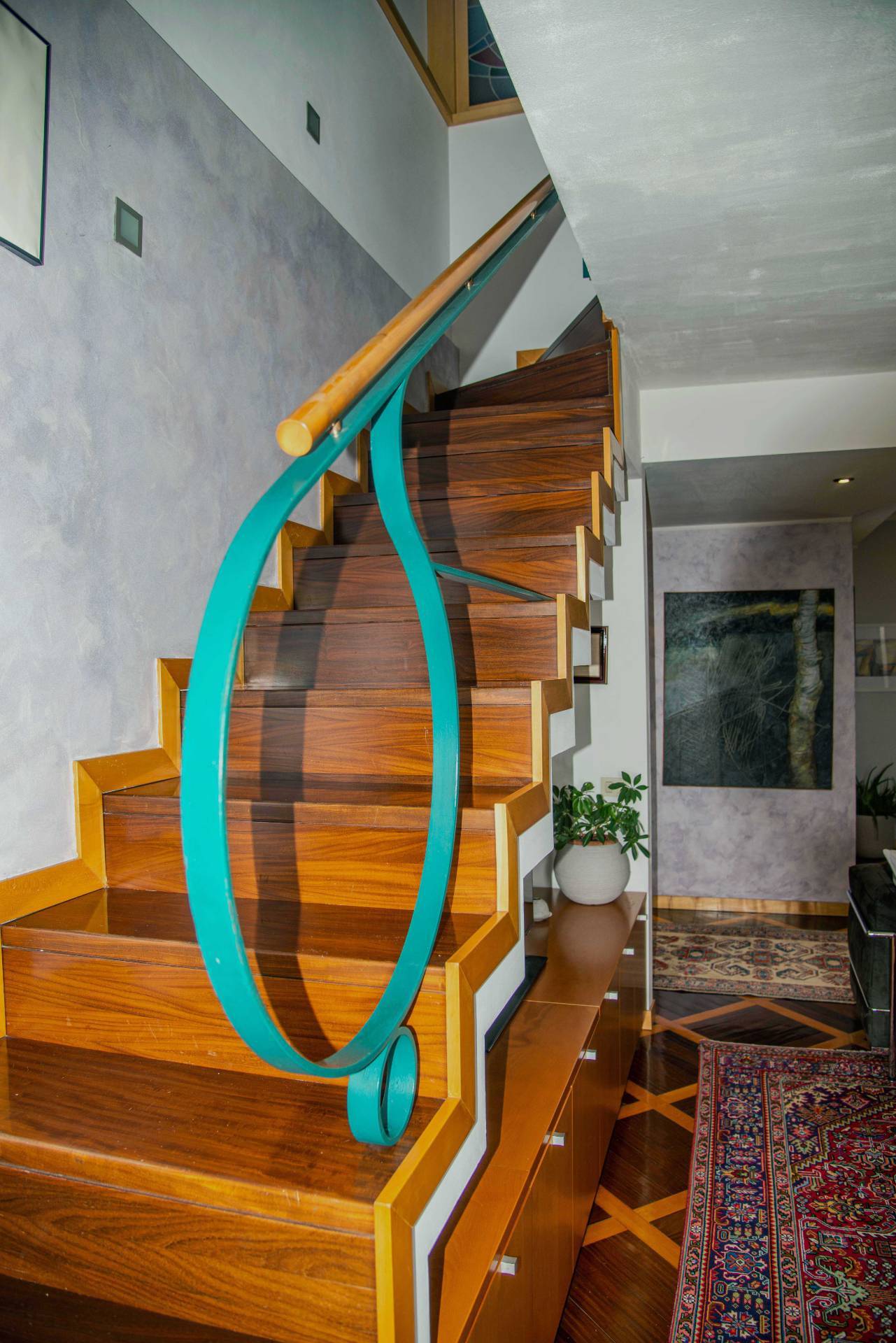 Una scala interna in muratura rivestita in legno porta al piano superiore mansardato composto da un secondo soggiorno con camino, uno studio, un ripostiglio ed una lavanderia oltre ad un terrazzo di mq. 28. Completano la propriet una cantina e la possibilit di un box singolo ed un box triplo (prezzo a parte). Riscaldamento autonomo.